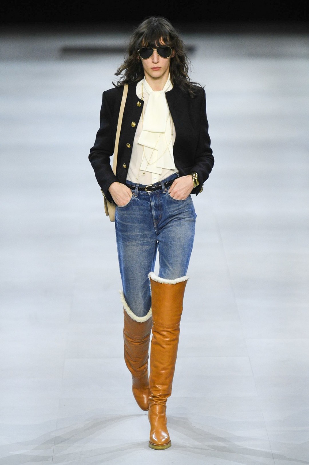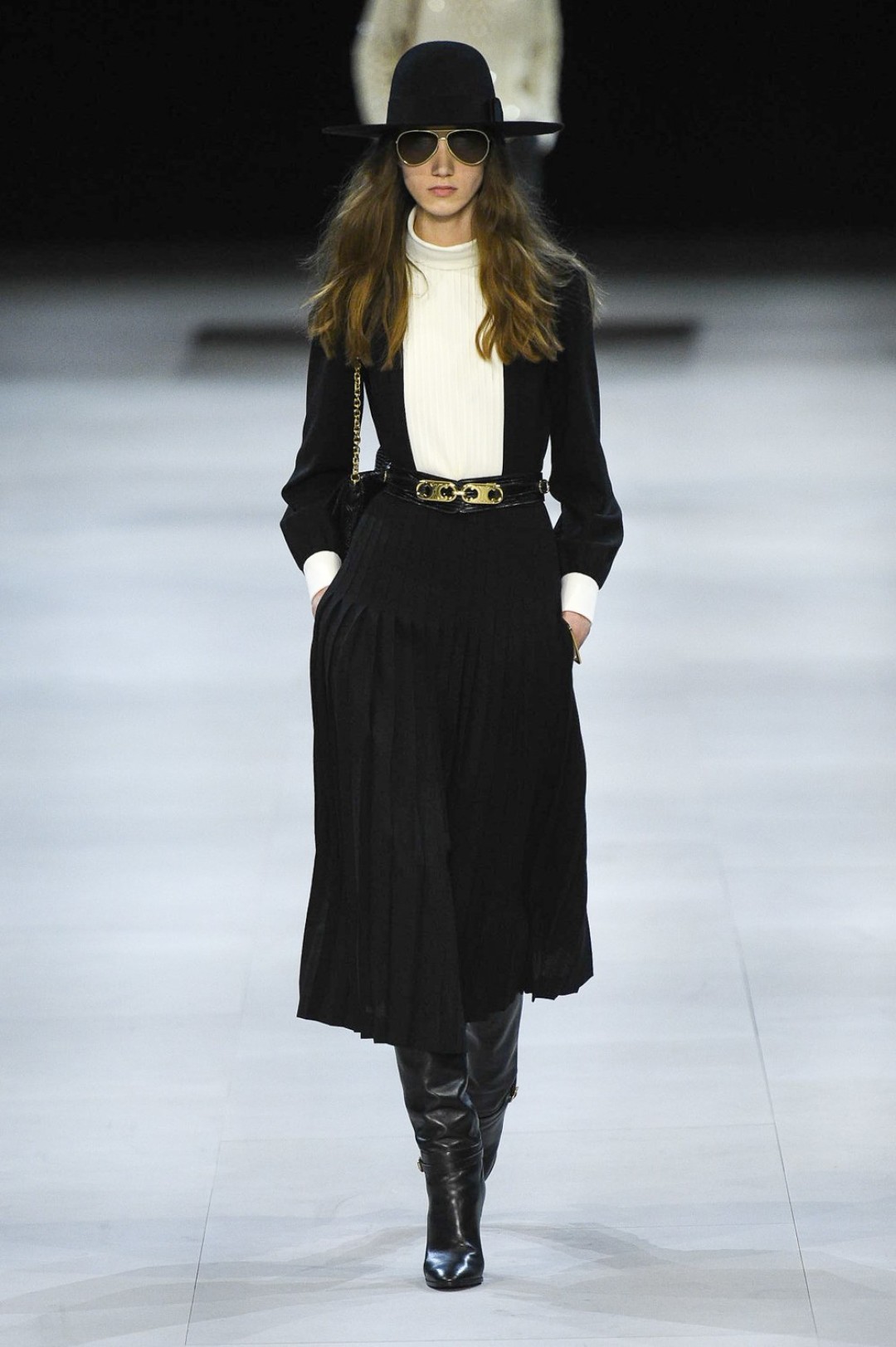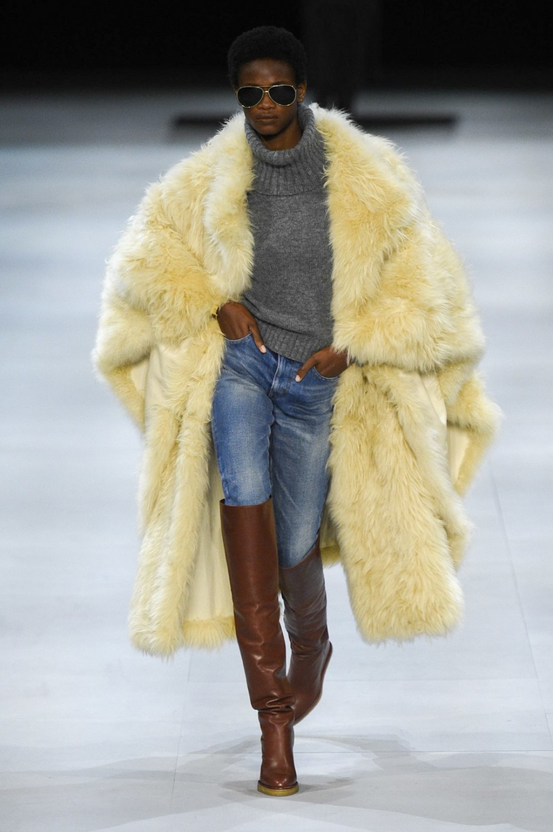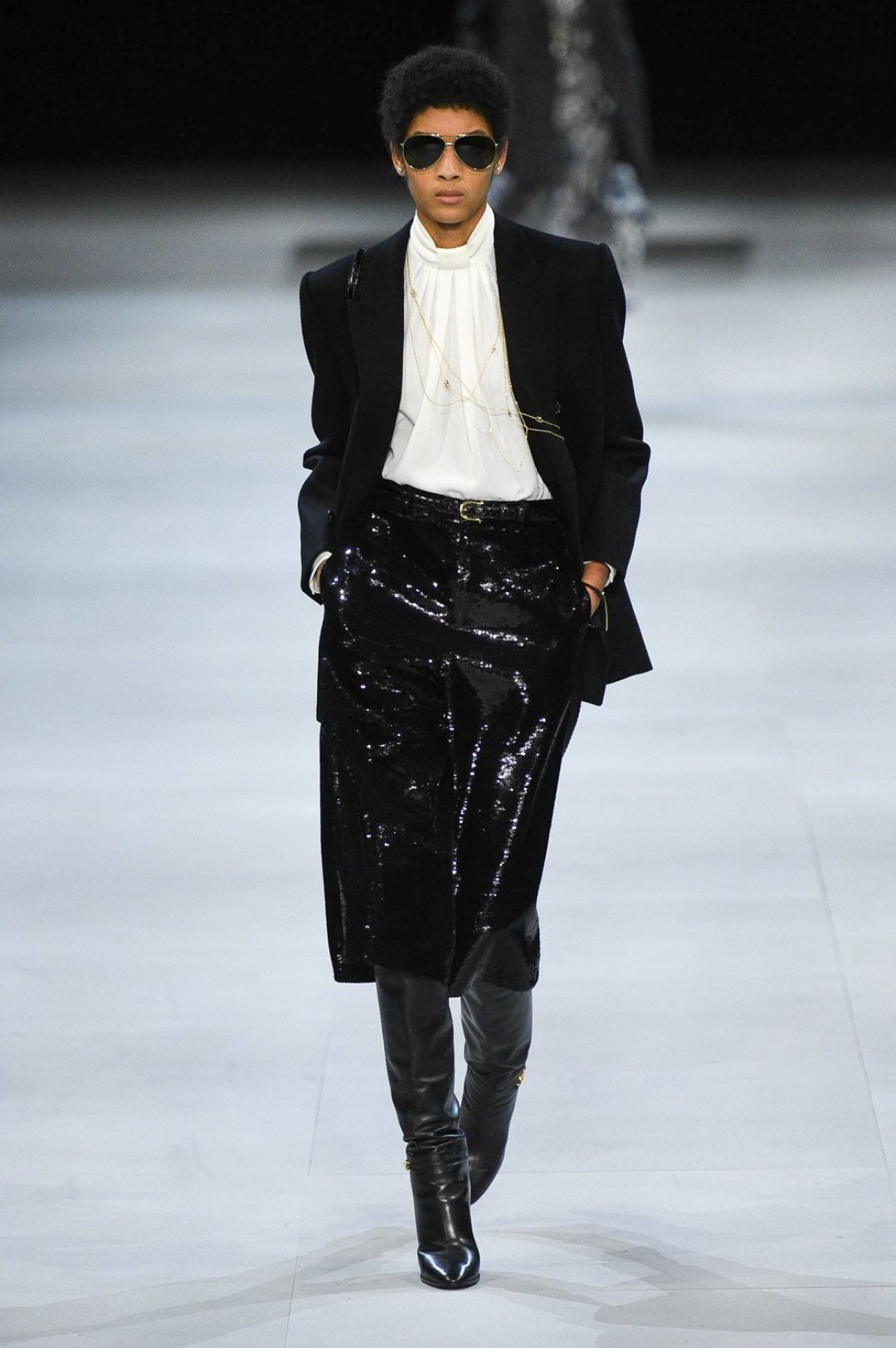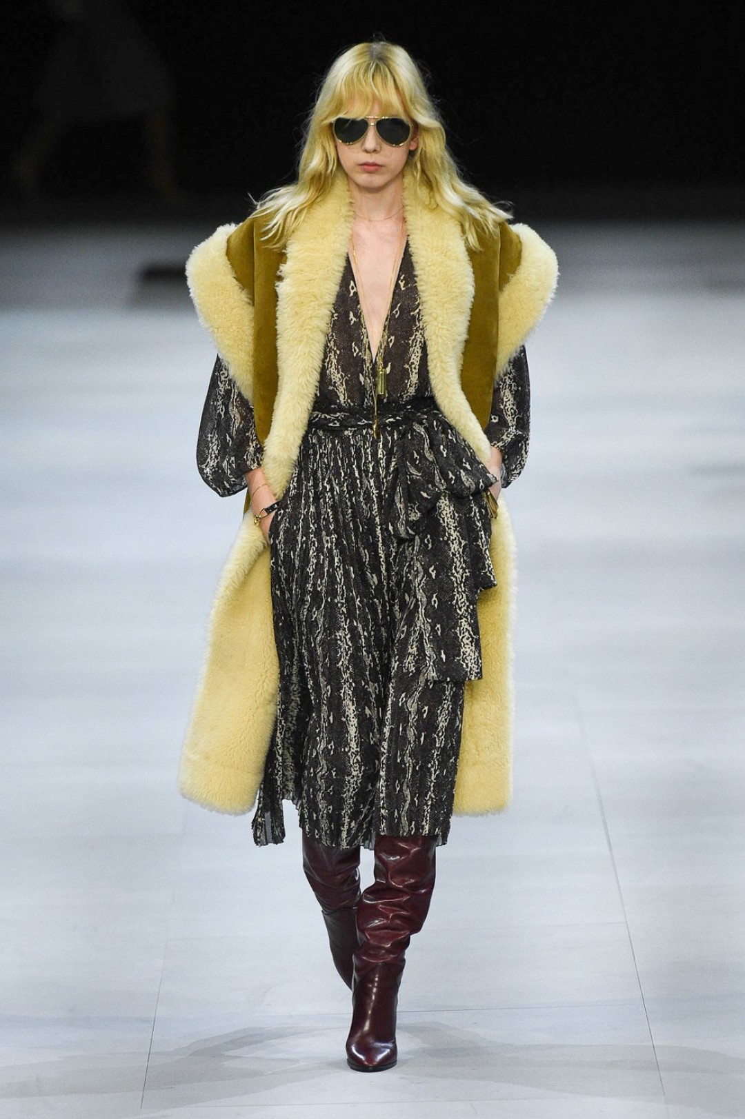 Главная вещь на показе (которую многие уже внесли в маст-хэв лист) — сапоги: утепленные изнутри овчиной, они стилизовали «лыжные» свитеры, белые шубы, «авиаторские» куртки и накидки, которые наверняка понравятся королеве Елизавете II. А учитывая любовь Эди Слимана к кастомизации платьев для красных дорожек, мы уже видим на звездах (и на себе!) платье с имитацией цепей и золотой тотал-лук с кюлотами.