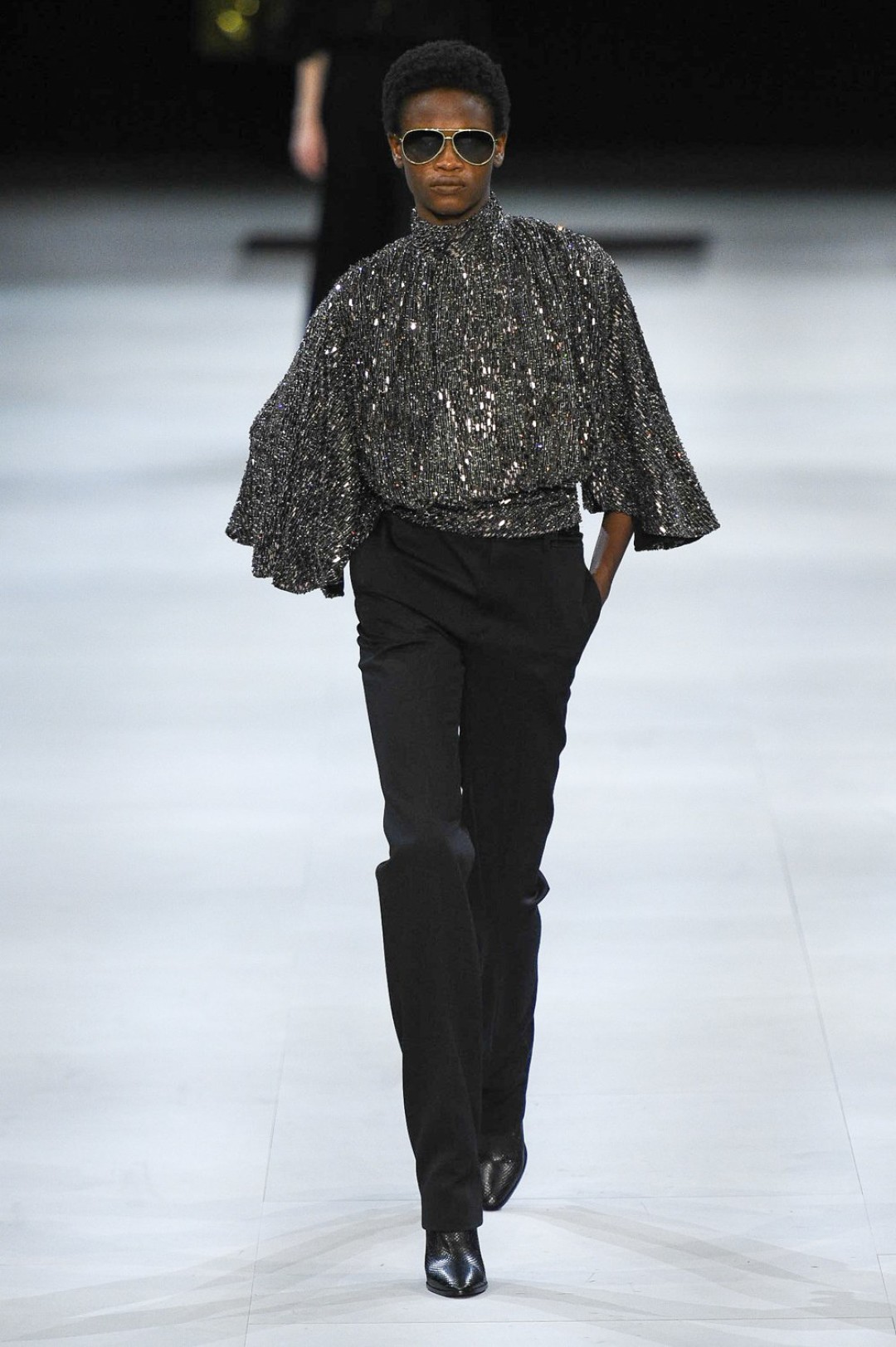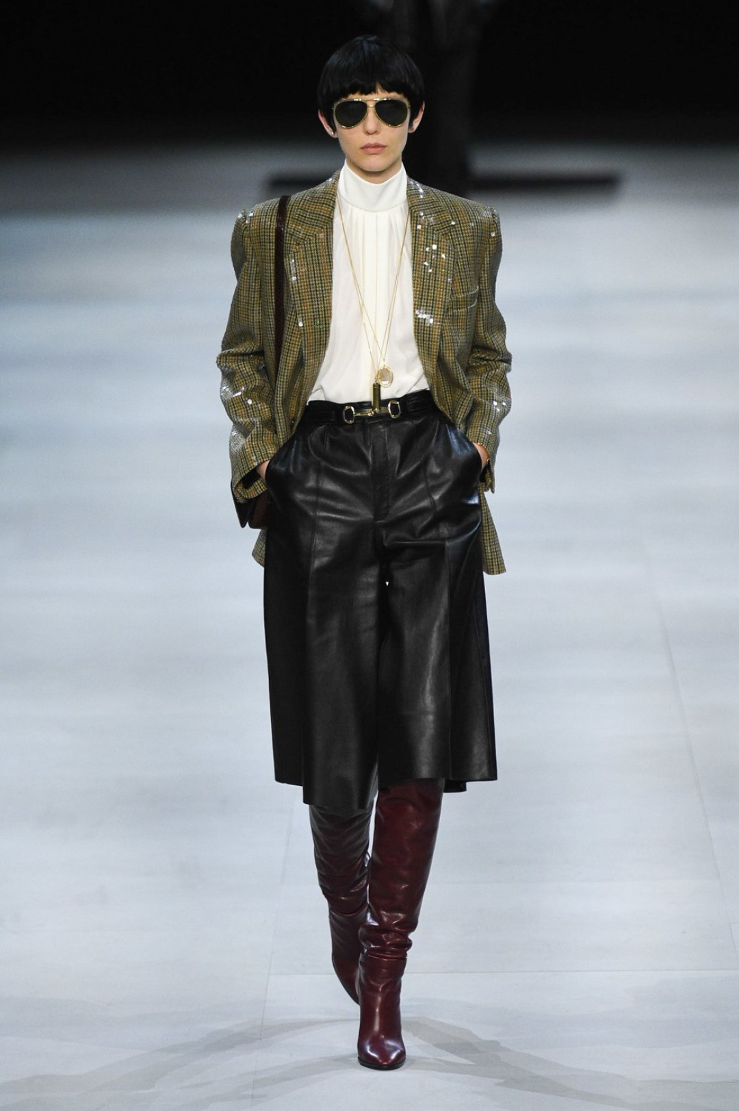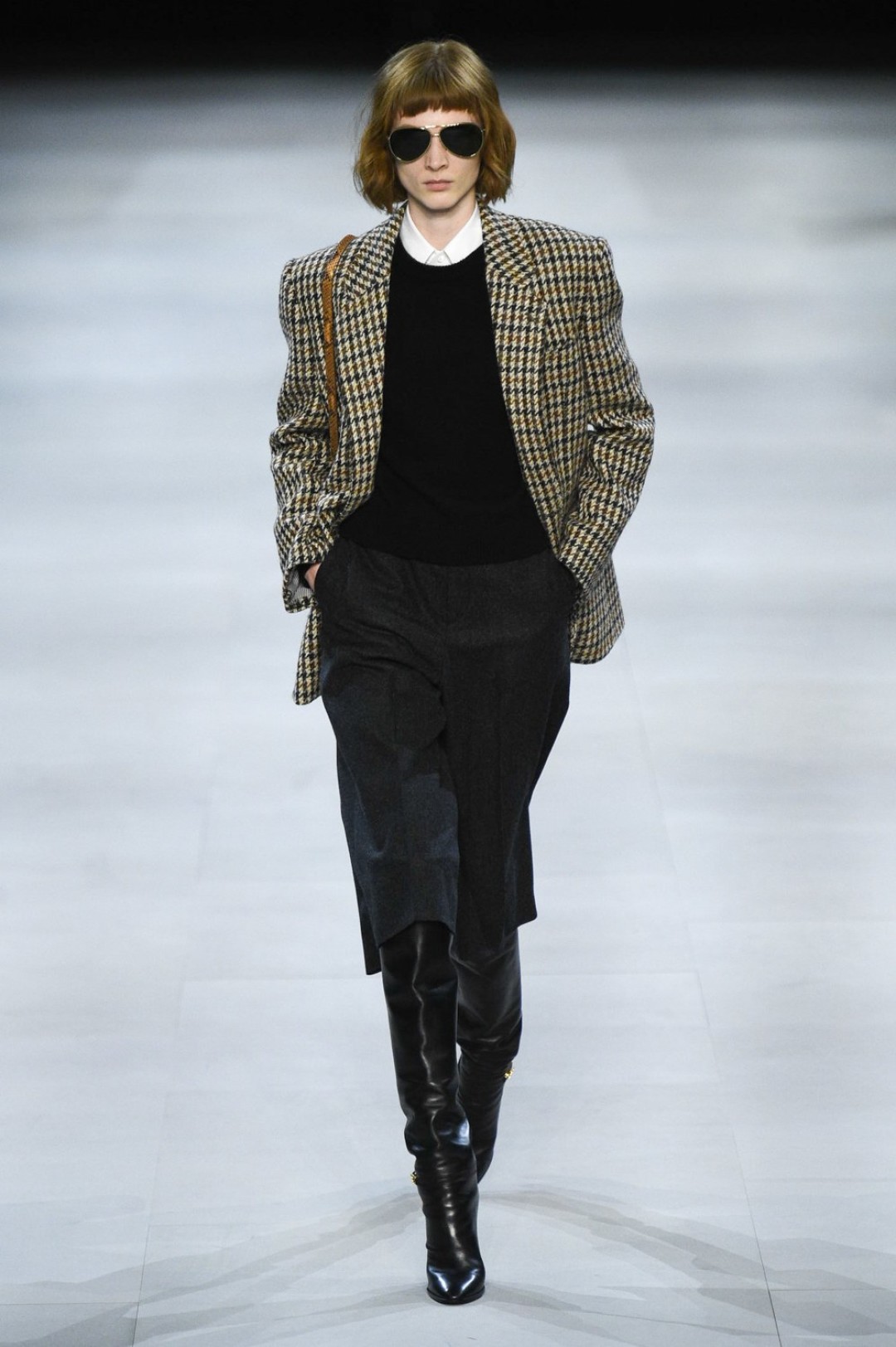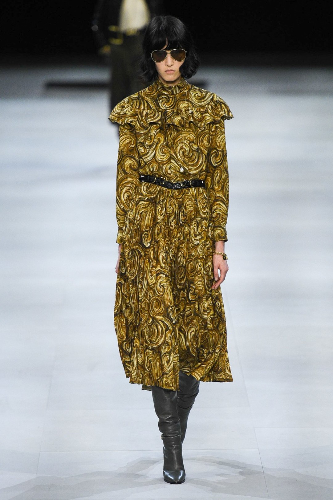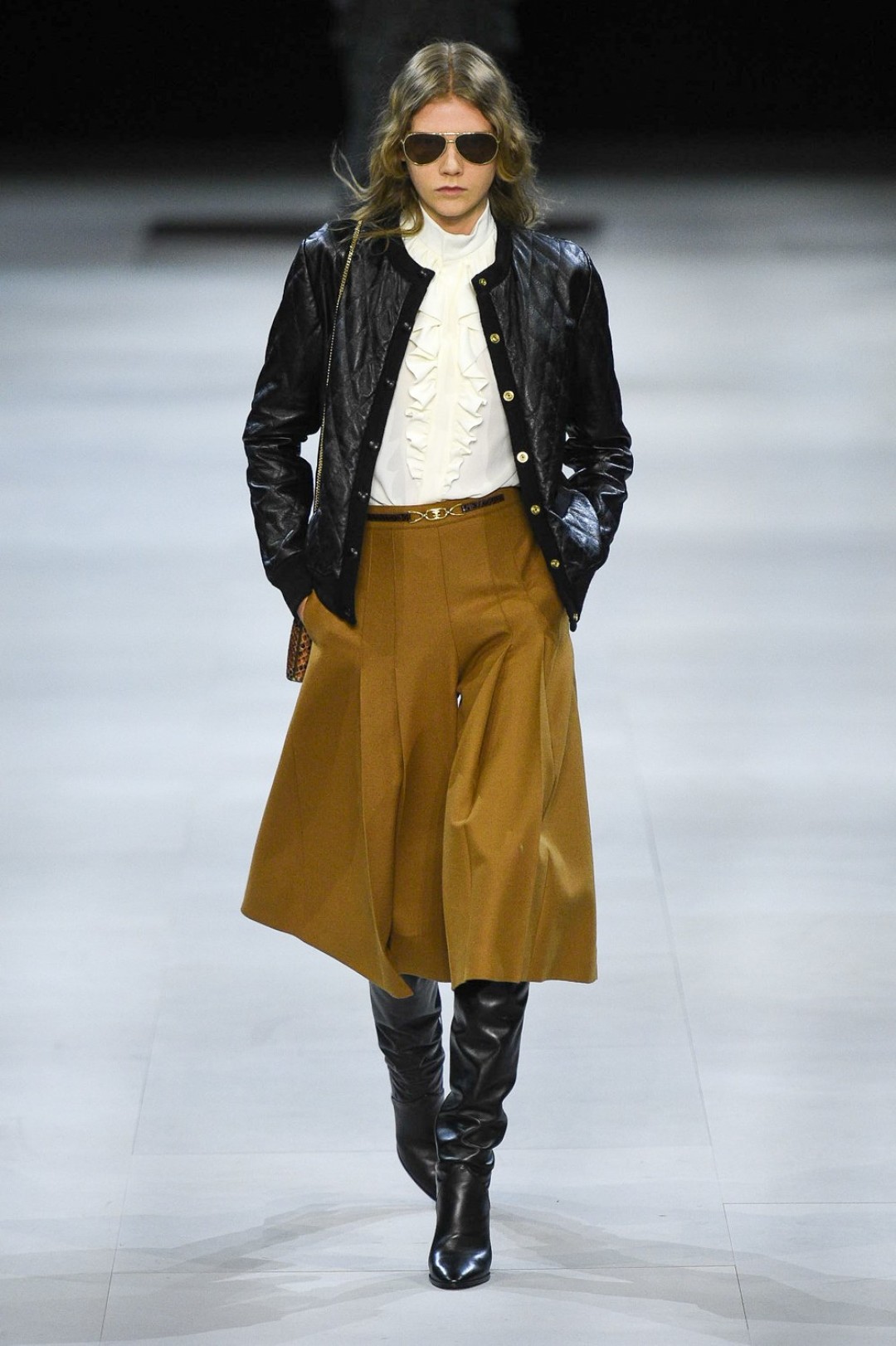 Главная вещь на показе (которую многие уже внесли в маст-хэв лист) — сапоги: утепленные изнутри овчиной, они стилизовали «лыжные» свитеры, белые шубы, «авиаторские» куртки и накидки, которые наверняка понравятся королеве Елизавете II. А учитывая любовь Эди Слимана к кастомизации платьев для красных дорожек, мы уже видим на звездах (и на себе!) платье с имитацией цепей и золотой тотал-лук с кюлотами.