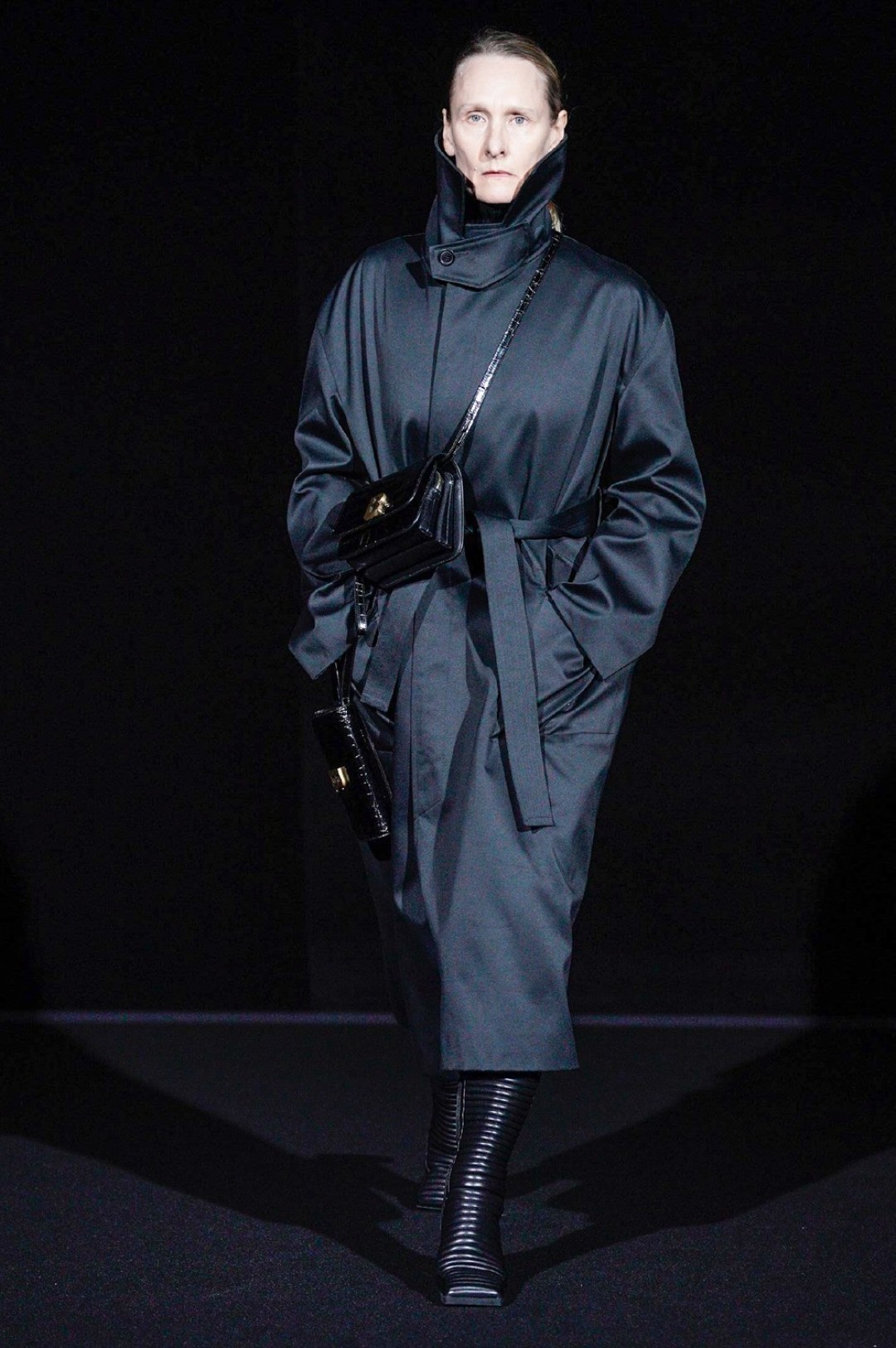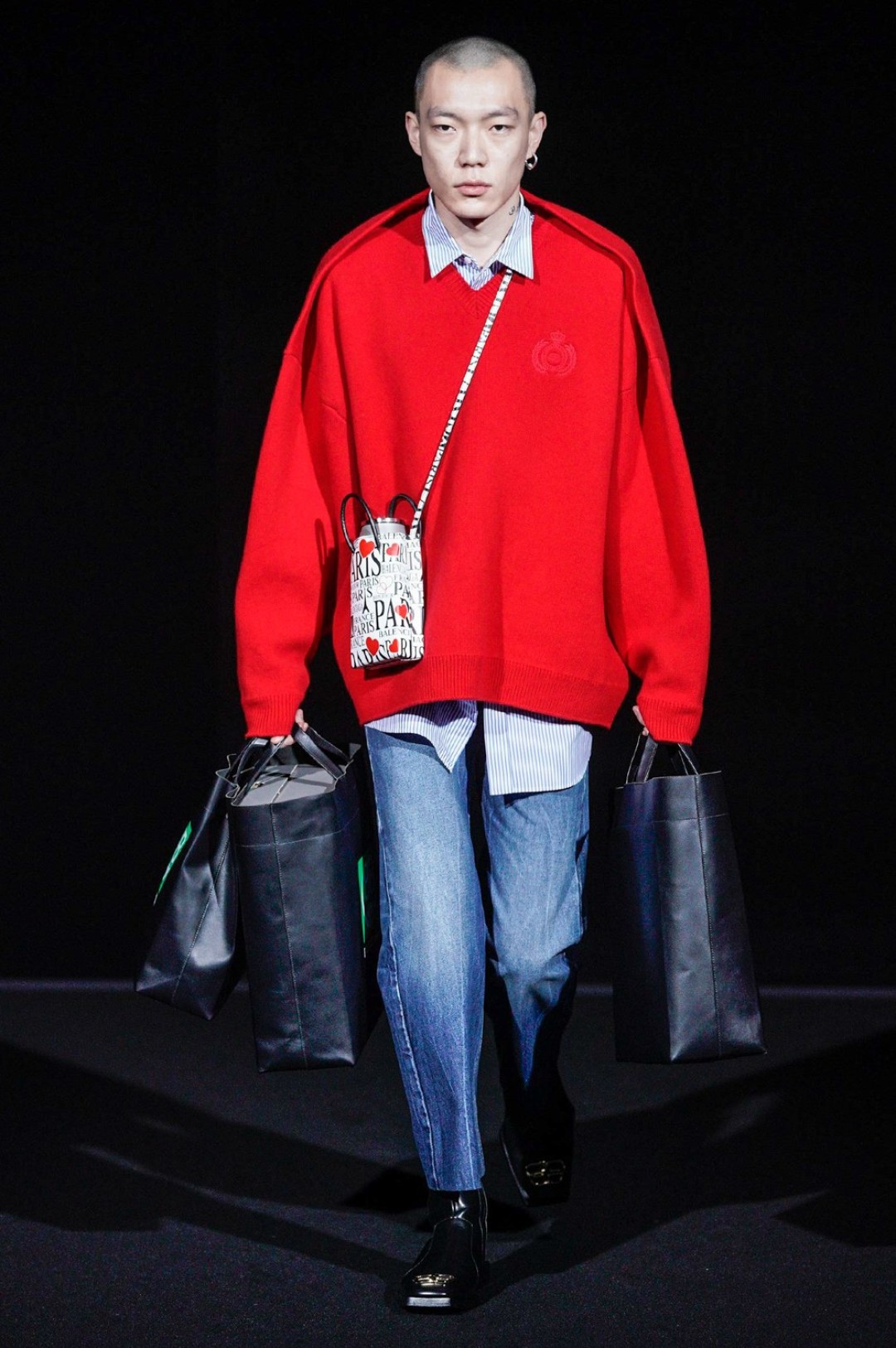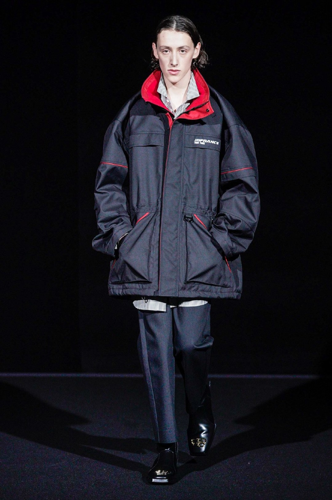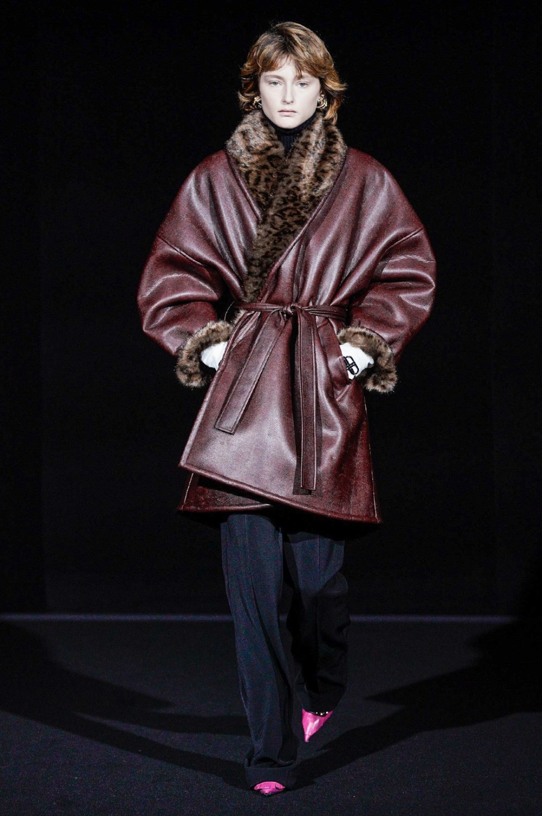 Дальше — больше: классические черные жакеты сменялись дубленками с гипертрофированными плечами, сумки-планшеты — картонными кросс-боди с прозрачными бутылками внутри, брендированные свитшоты — футболками «Paris» в стиле нулевых годов, а лакированные плащи — уютными пальто-халатами.