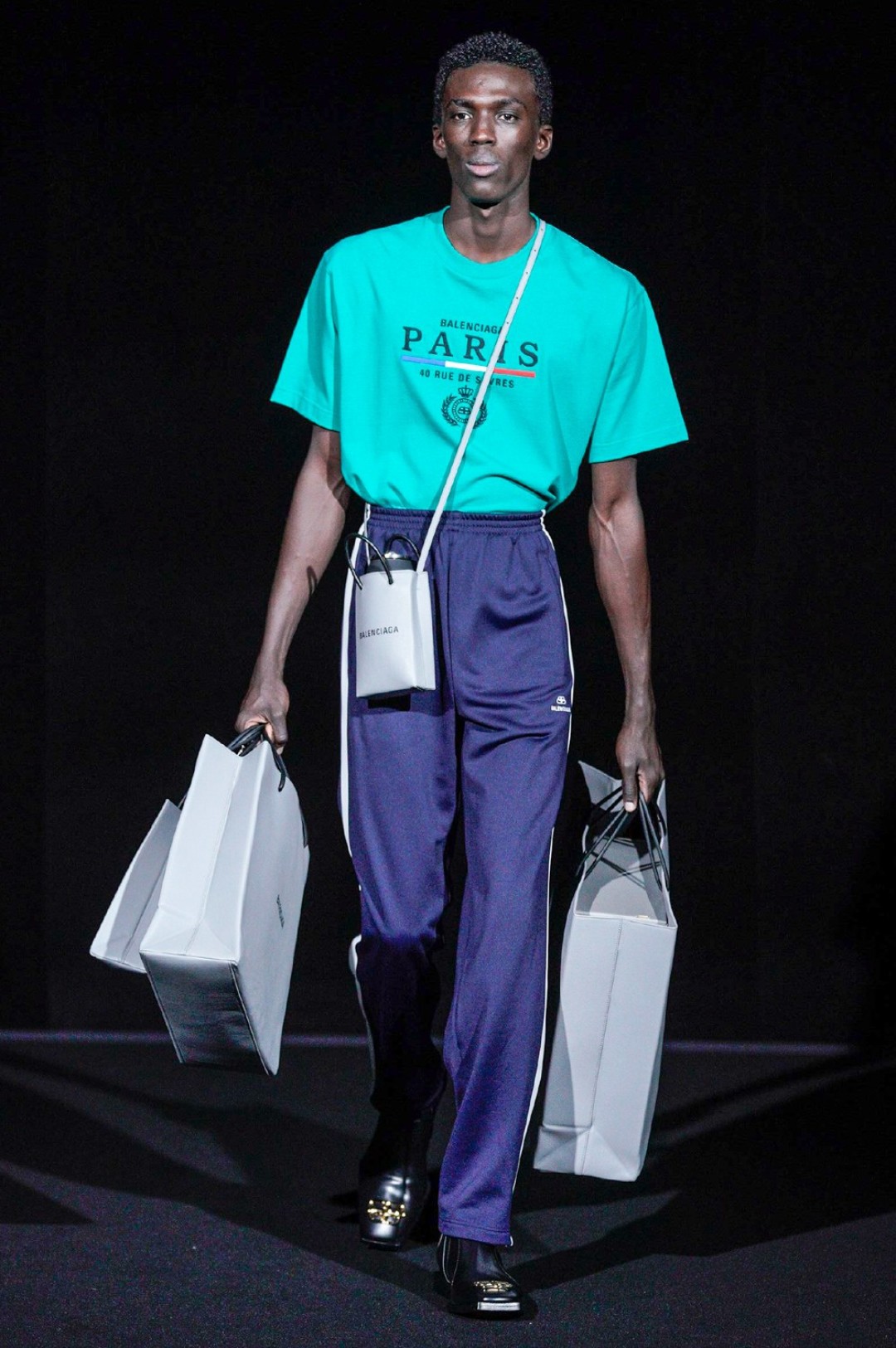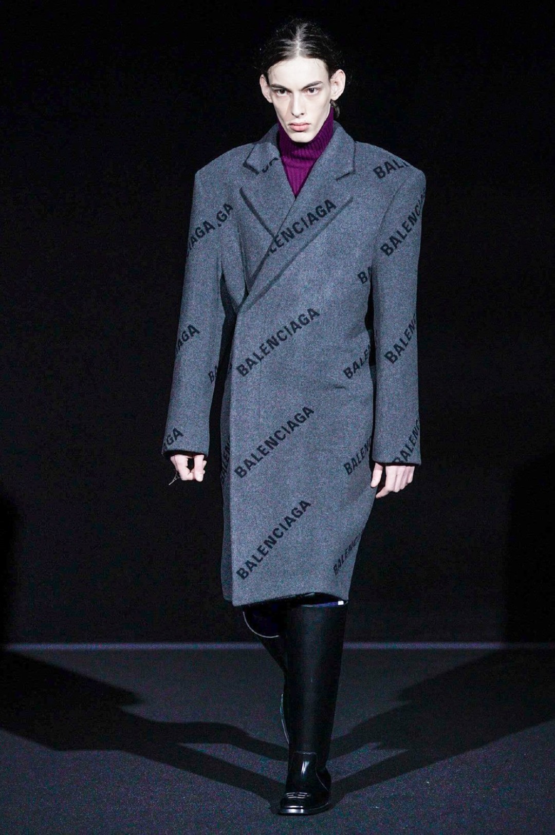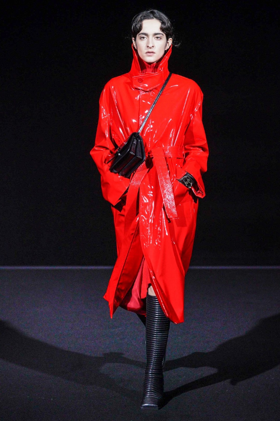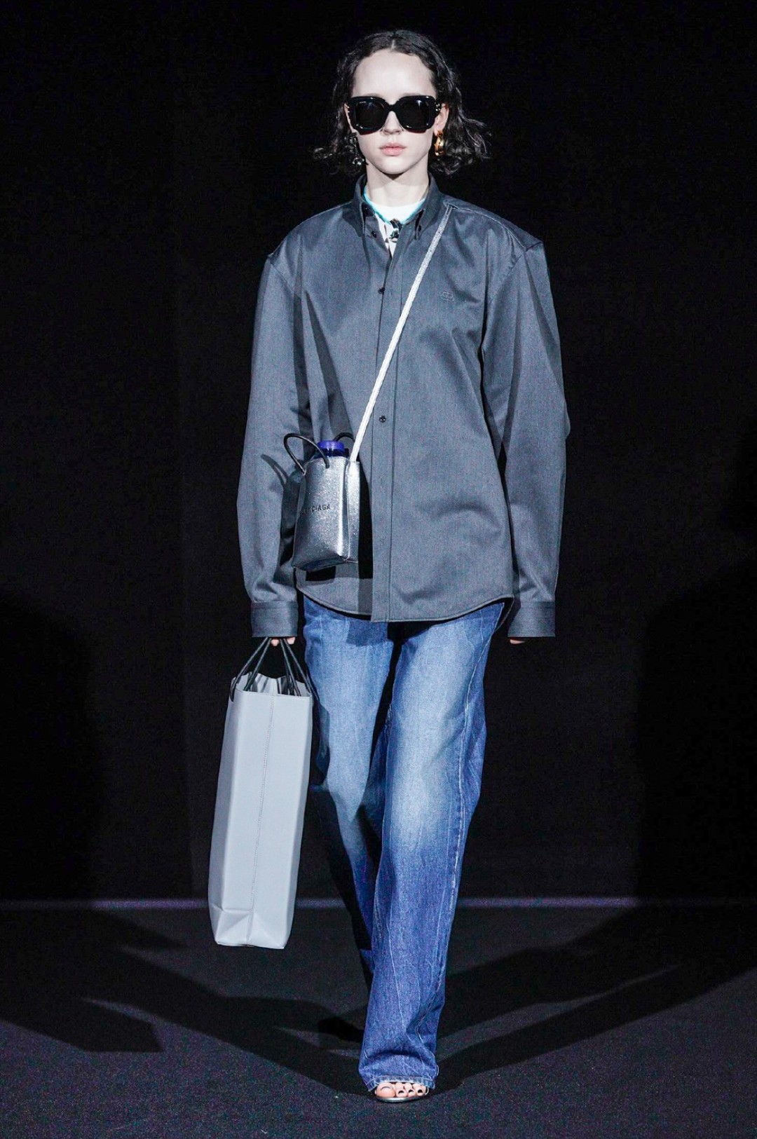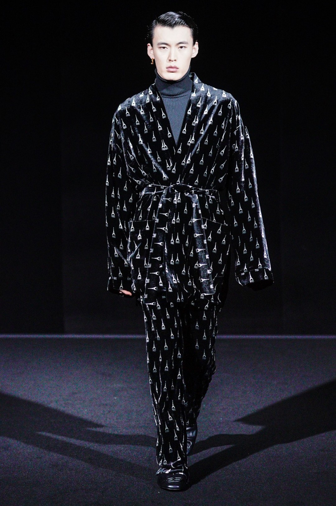 Дальше — больше: классические черные жакеты сменялись дубленками с гипертрофированными плечами, сумки-планшеты — картонными кросс-боди с прозрачными бутылками внутри, брендированные свитшоты — футболками «Paris» в стиле нулевых годов, а лакированные плащи — уютными пальто-халатами.