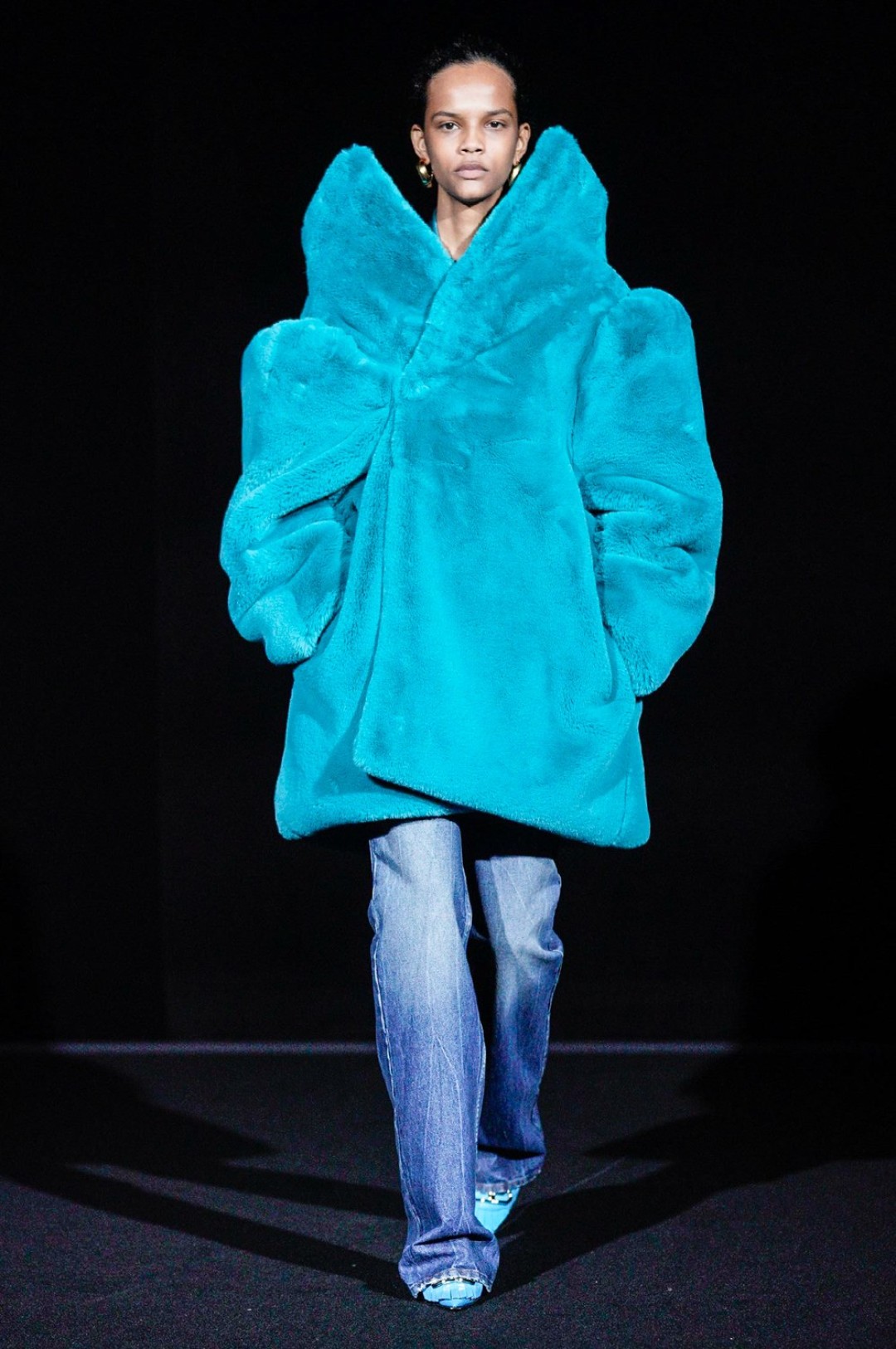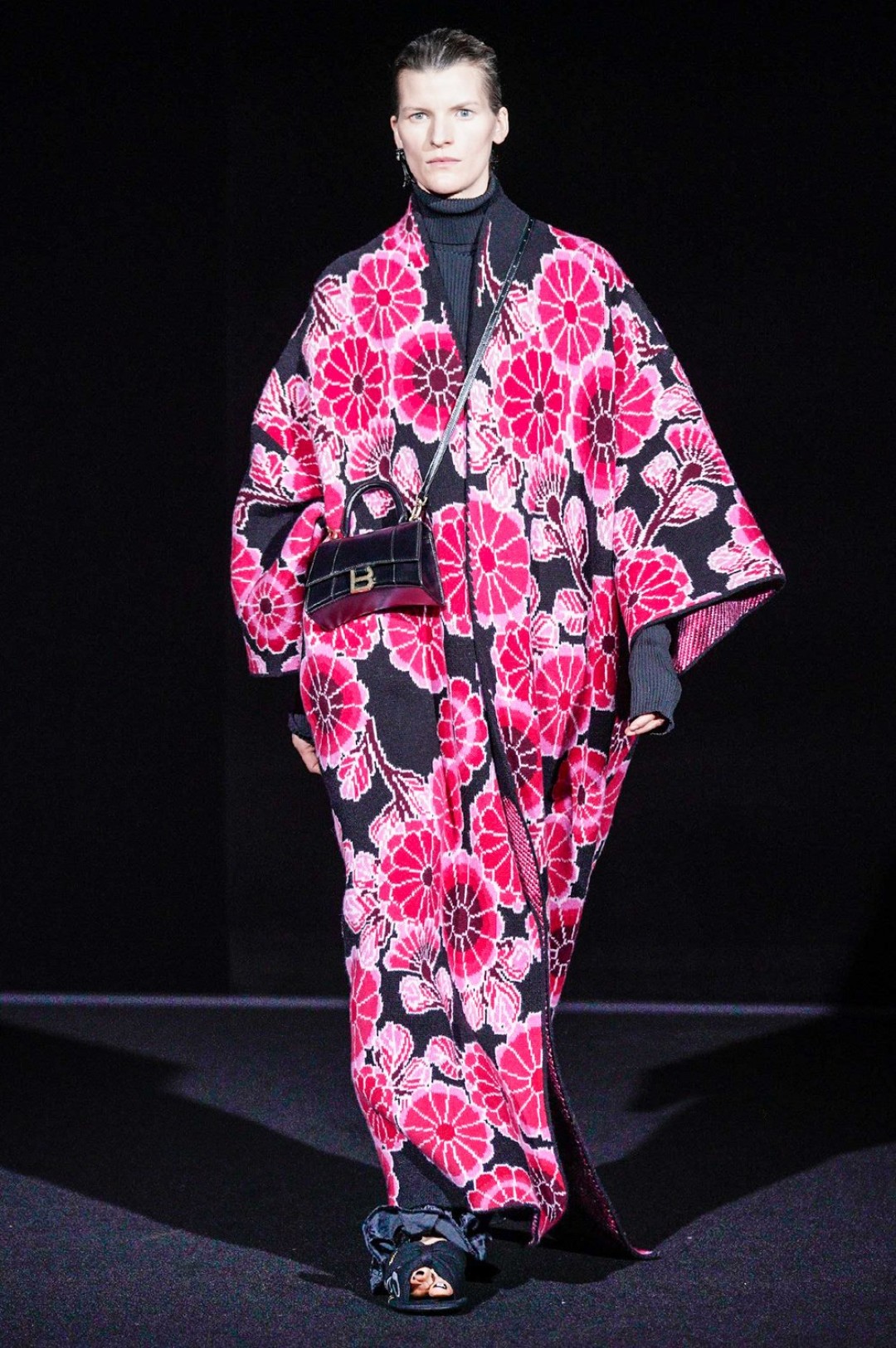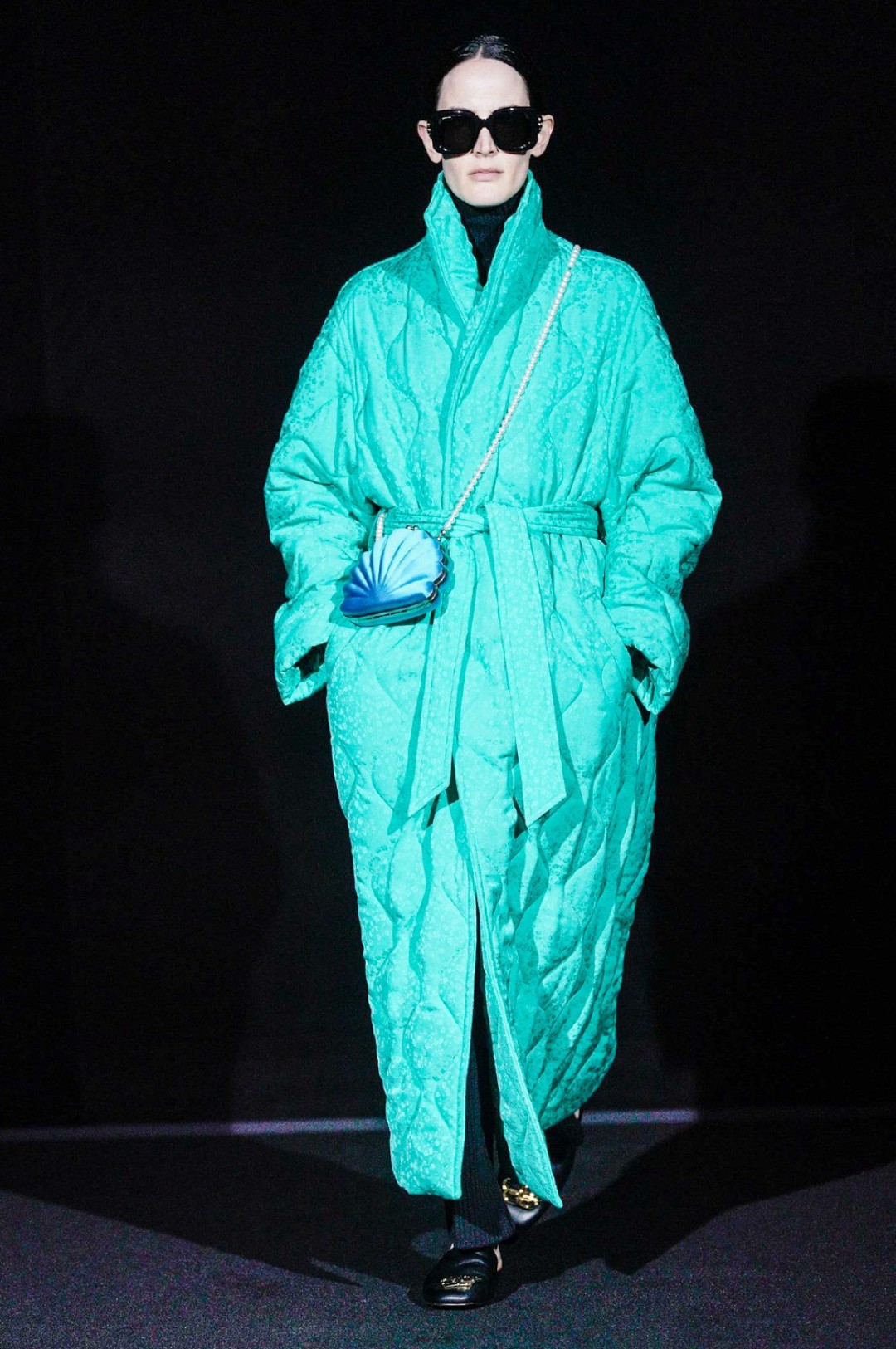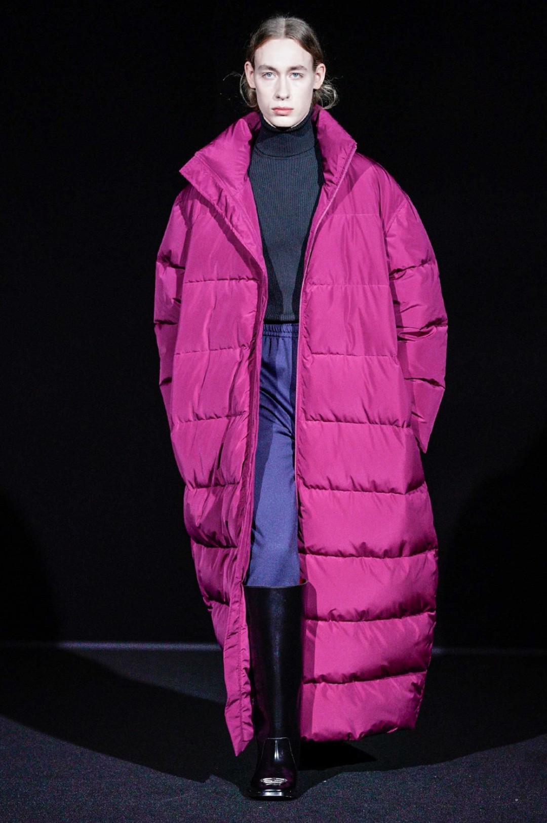 Дальше — больше: классические черные жакеты сменялись дубленками с гипертрофированными плечами, сумки-планшеты — картонными кросс-боди с прозрачными бутылками внутри, брендированные свитшоты — футболками «Paris» в стиле нулевых годов, а лакированные плащи — уютными пальто-халатами.