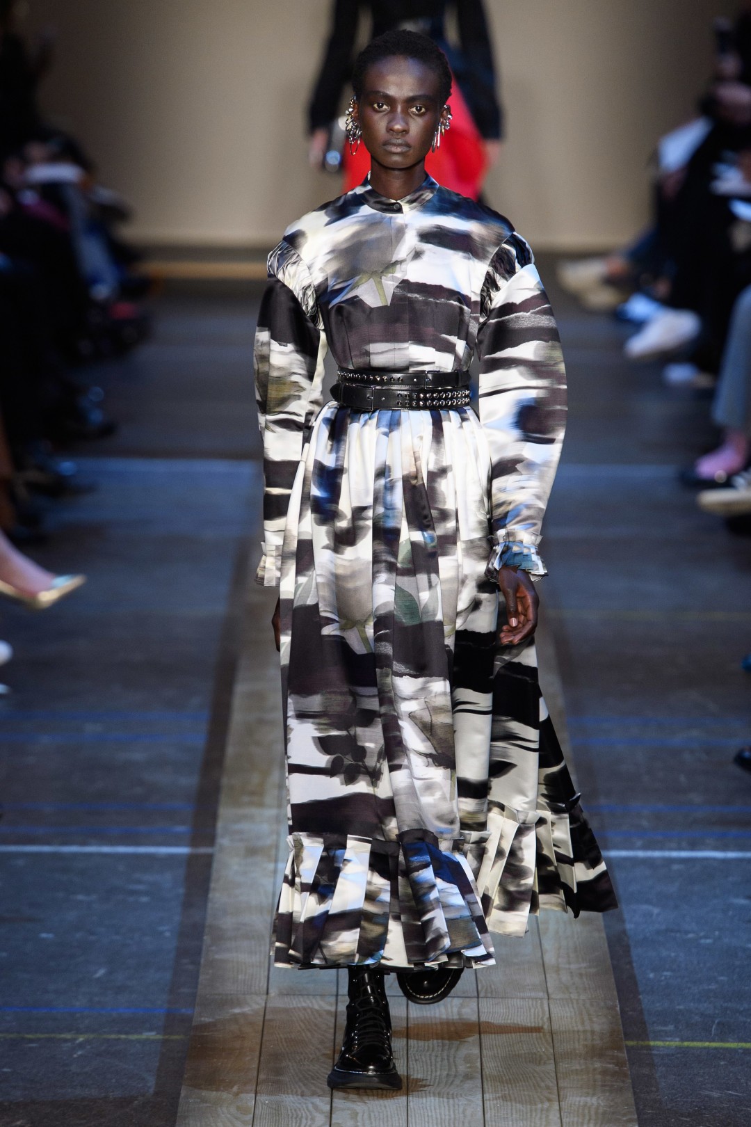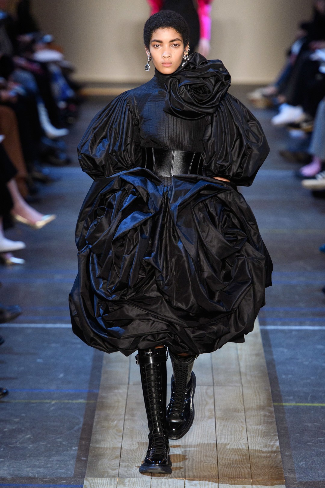 Платье из черного тюля с металлическими блестками имитировало звук фабричного станка, черный корсетный пояс напоминал круглые элементы механизмов, а архитектурный жакет с клепками апеллировал к подручным инструментам мастеров. На этом фоне появился (а точнее распустился) еще один символ Северной Англии — Алая роза Ланкастеров, исторически противостоящая Белой розе Йорков. Именно так Сара Бертон назвала финальное платье из тафты, форма которого повторилась в принтах нескольких нарядов.