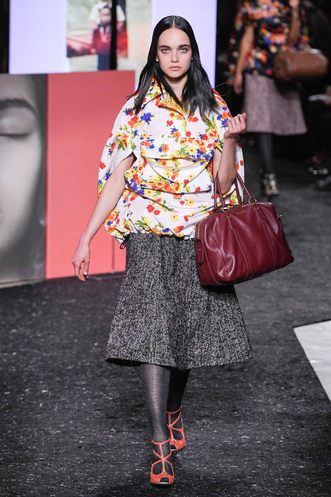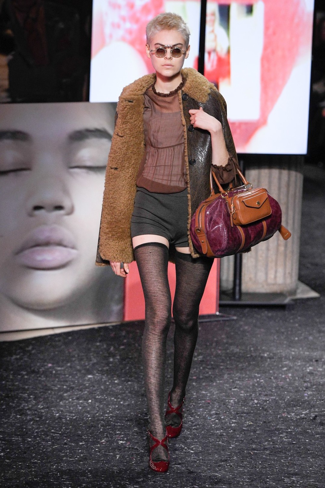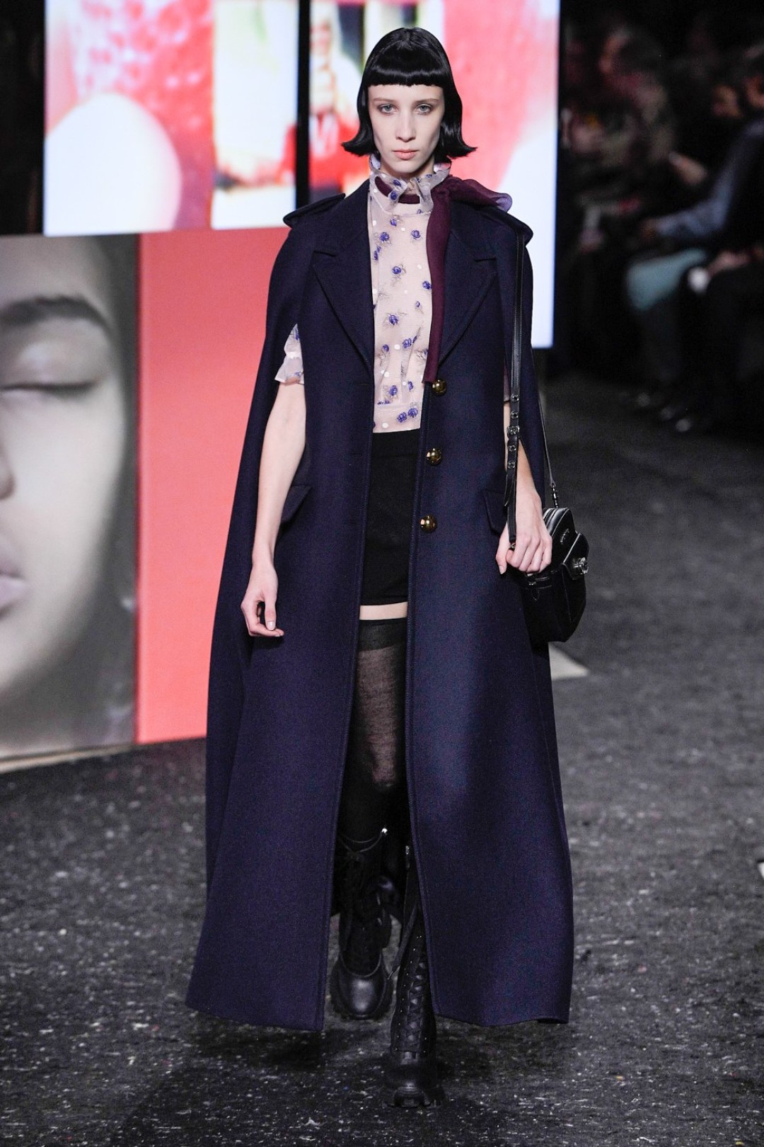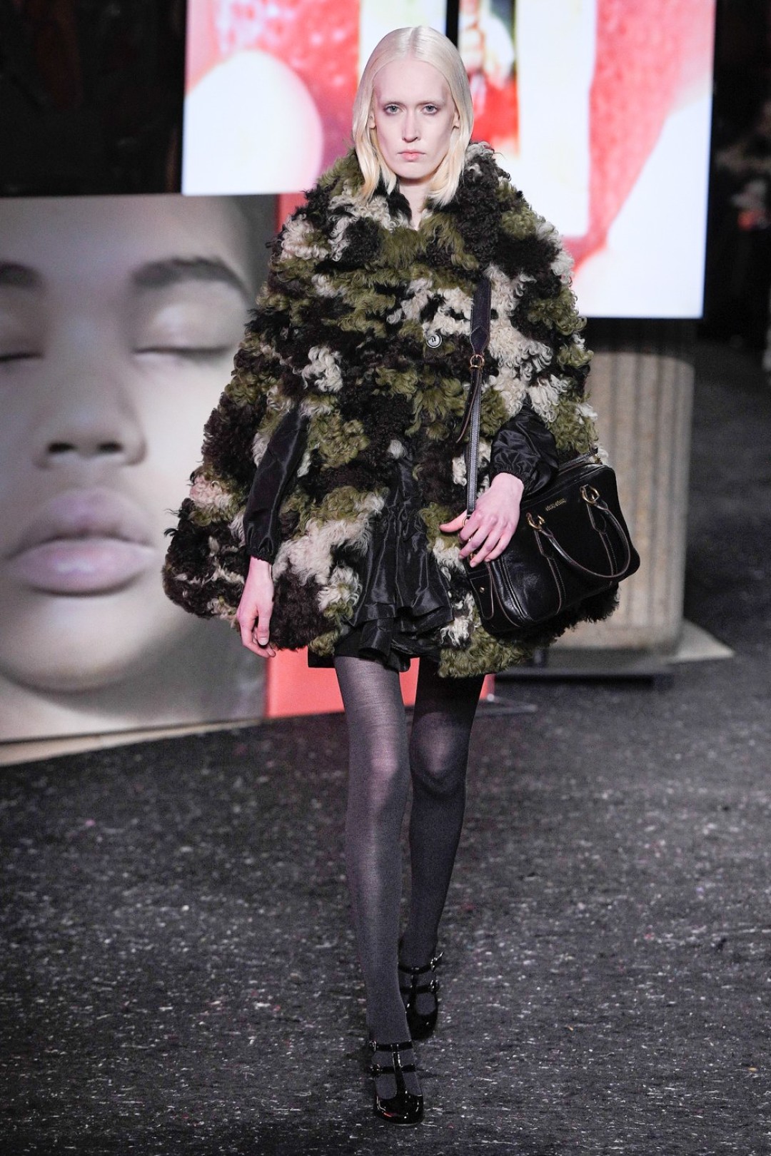Miu Miu показали коллекцию в Париже — в окружении плакатов с лоу-фай кадрами, которые продолжили недавнюю рекламную кампанию бренда, и телевизоров с видео-клипами, созданными для него новозеландской художницей и клипмейкером Шарной Осборн.