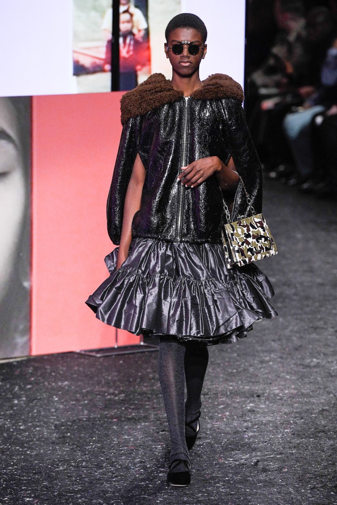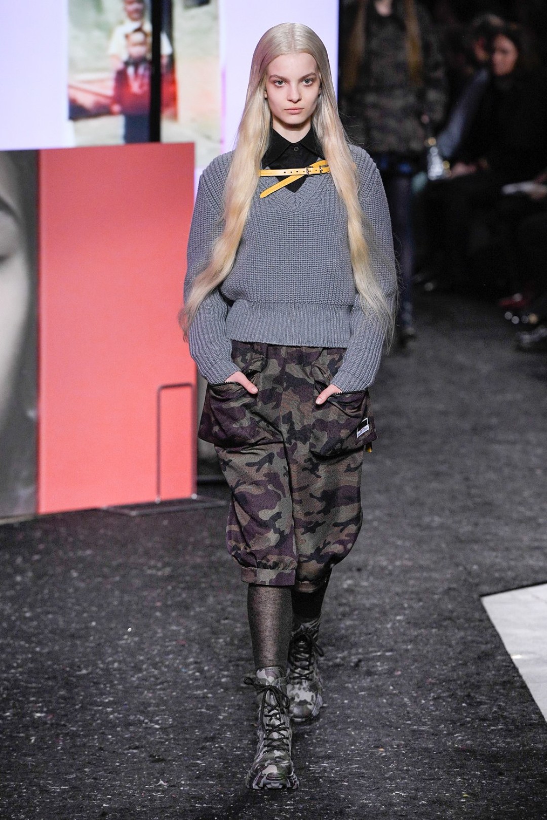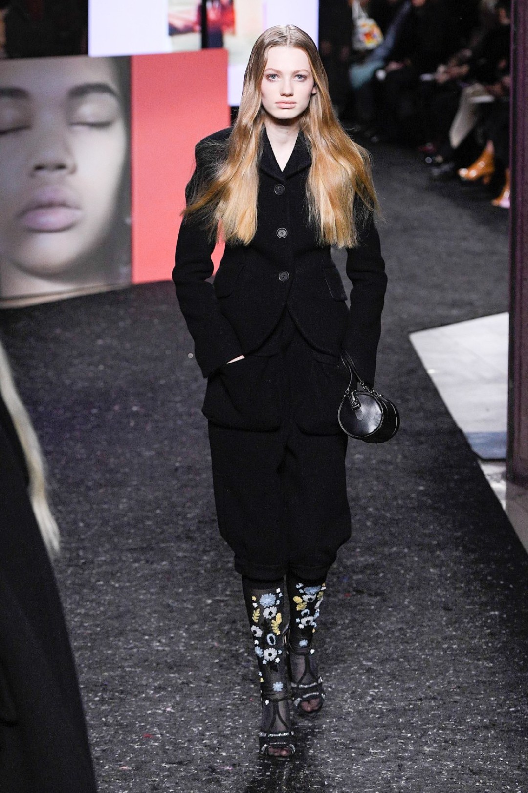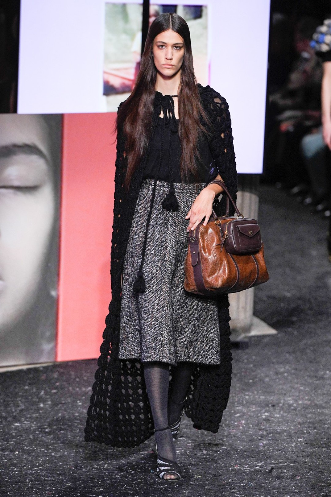 Miu Miu показали коллекцию в Париже — в окружении плакатов с лоу-фай кадрами, которые продолжили недавнюю рекламную кампанию бренда, и телевизоров с видео-клипами, созданными для него новозеландской художницей и клипмейкером Шарной Осборн.