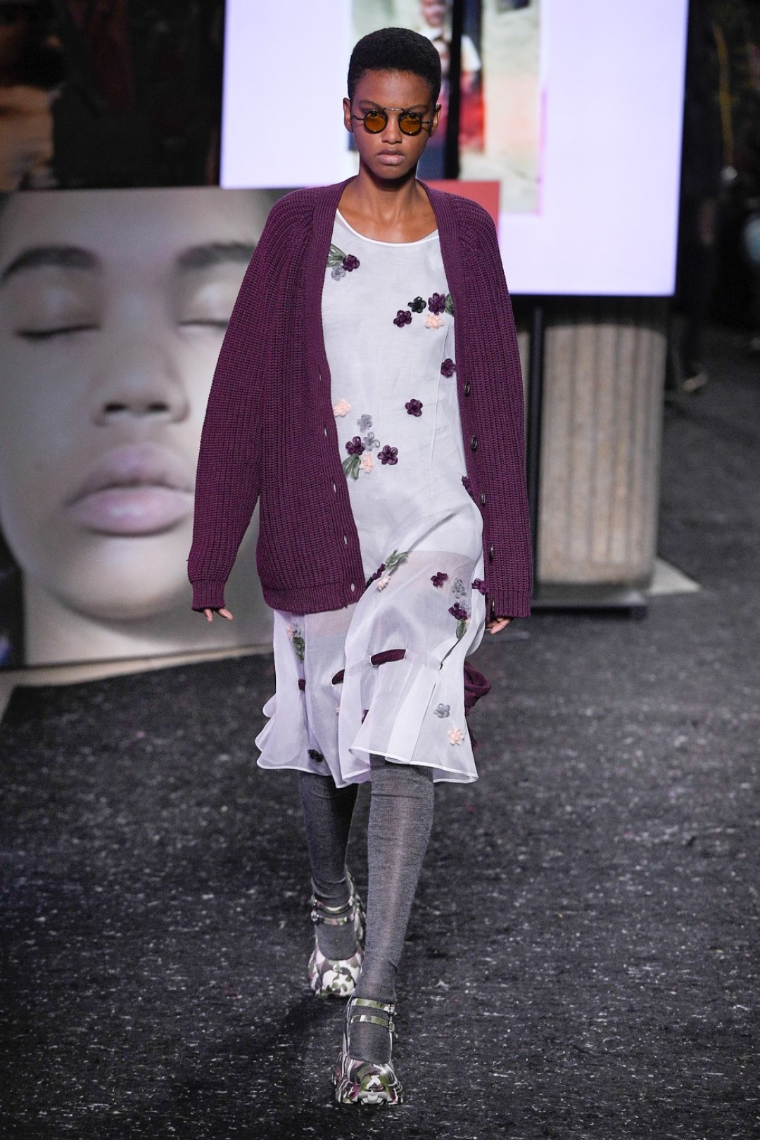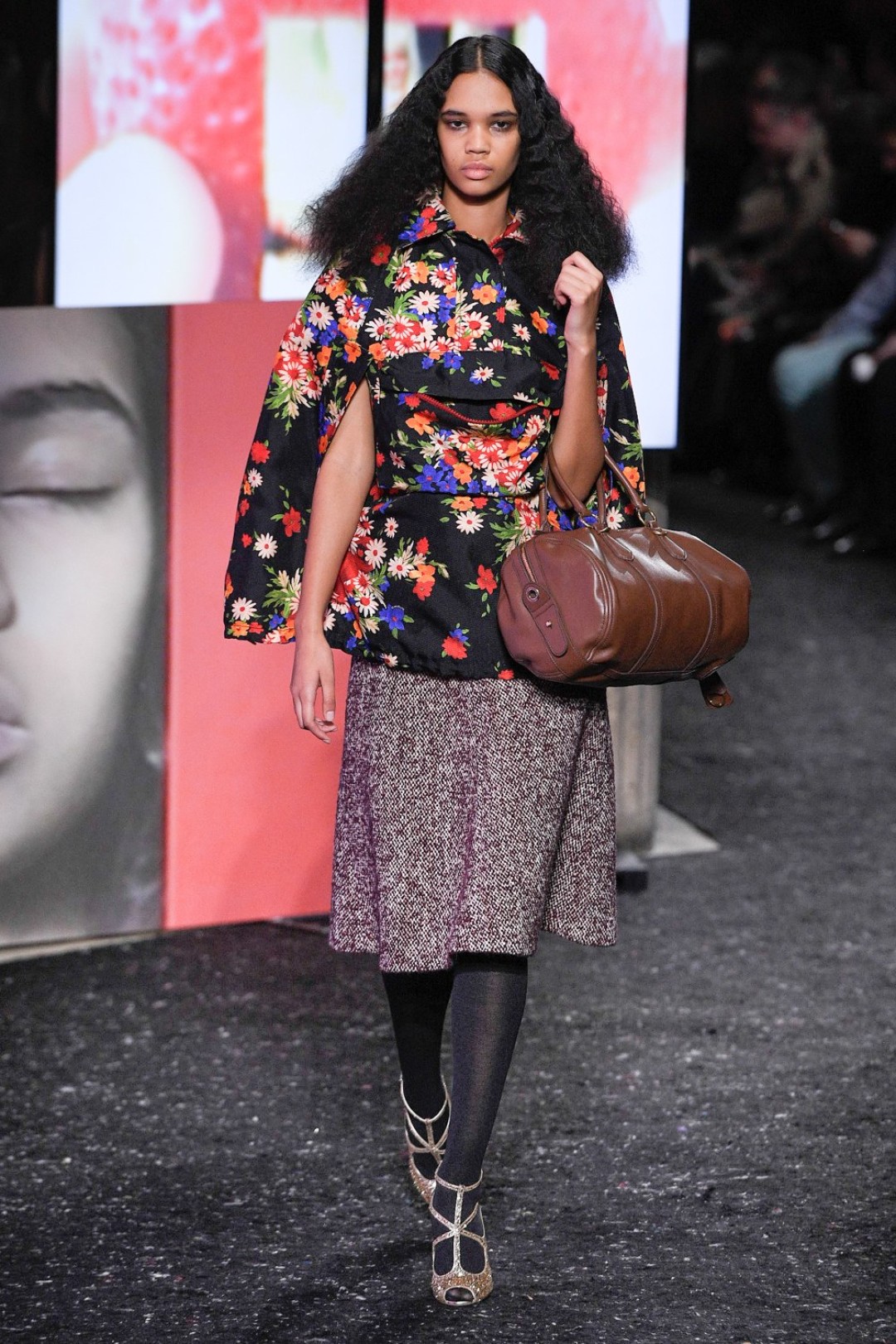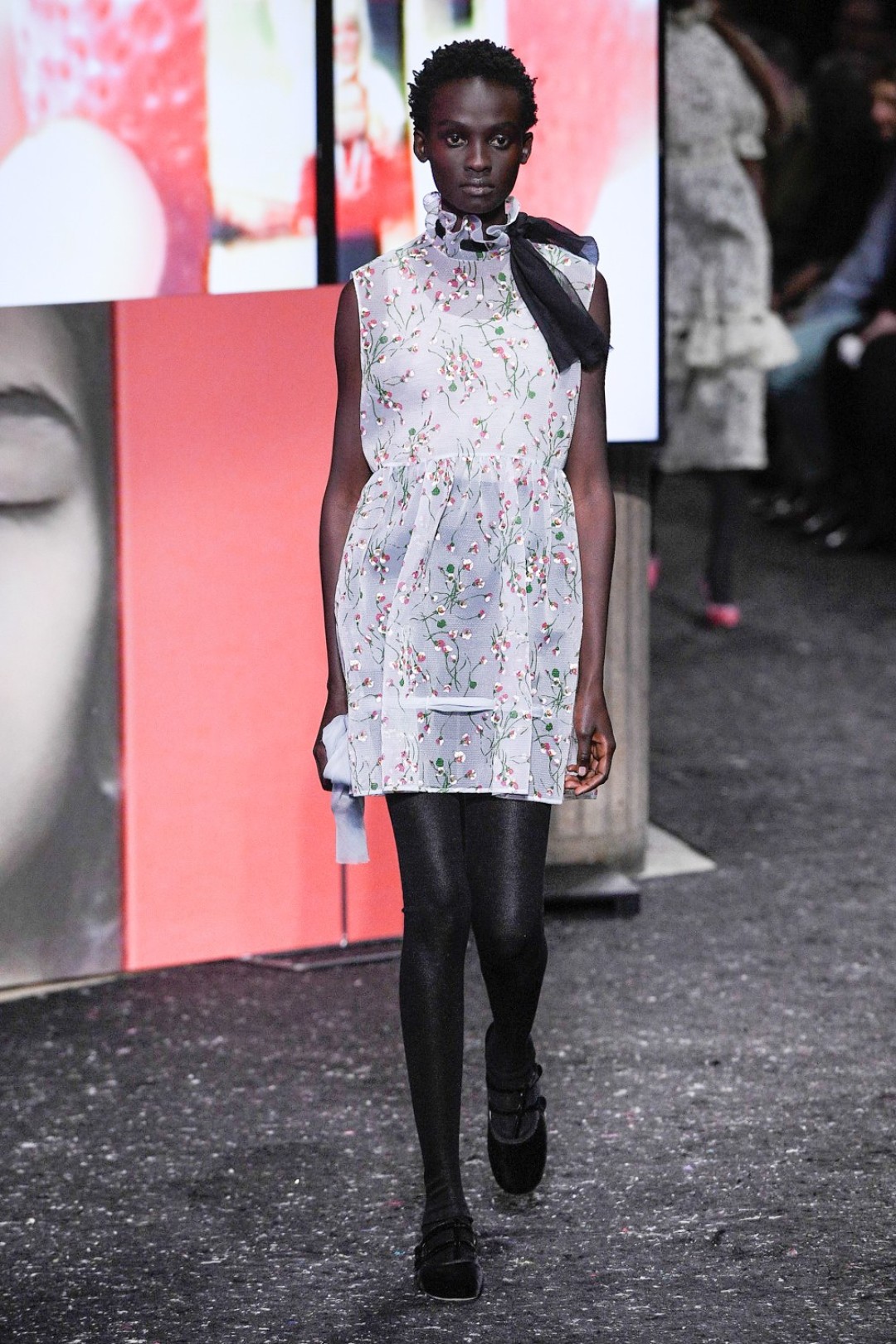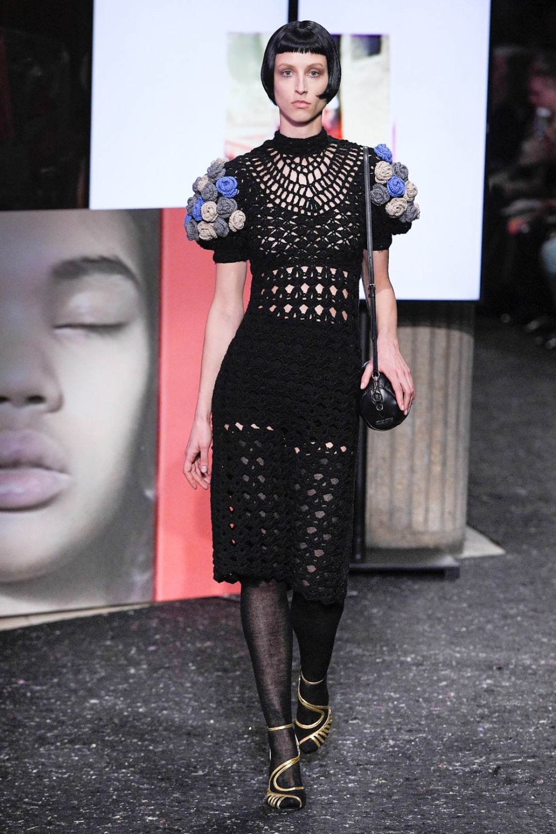 Miu Miu показали коллекцию в Париже — в окружении плакатов с лоу-фай кадрами, которые продолжили недавнюю рекламную кампанию бренда, и телевизоров с видео-клипами, созданными для него новозеландской художницей и клипмейкером Шарной Осборн.