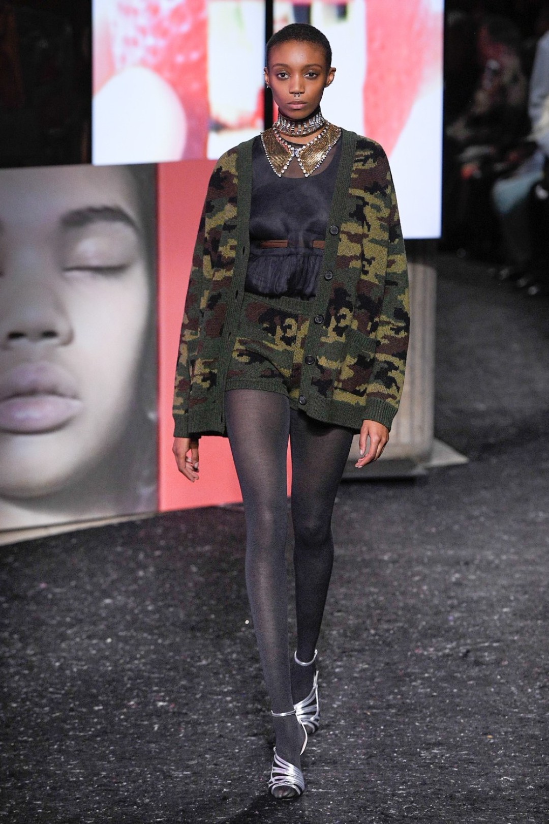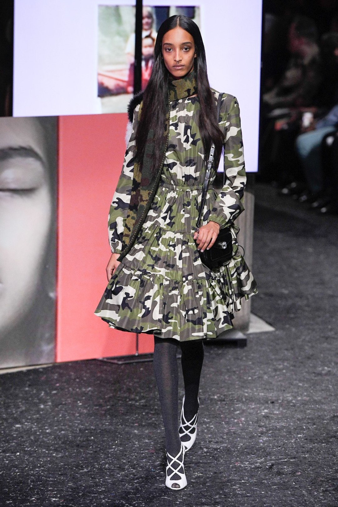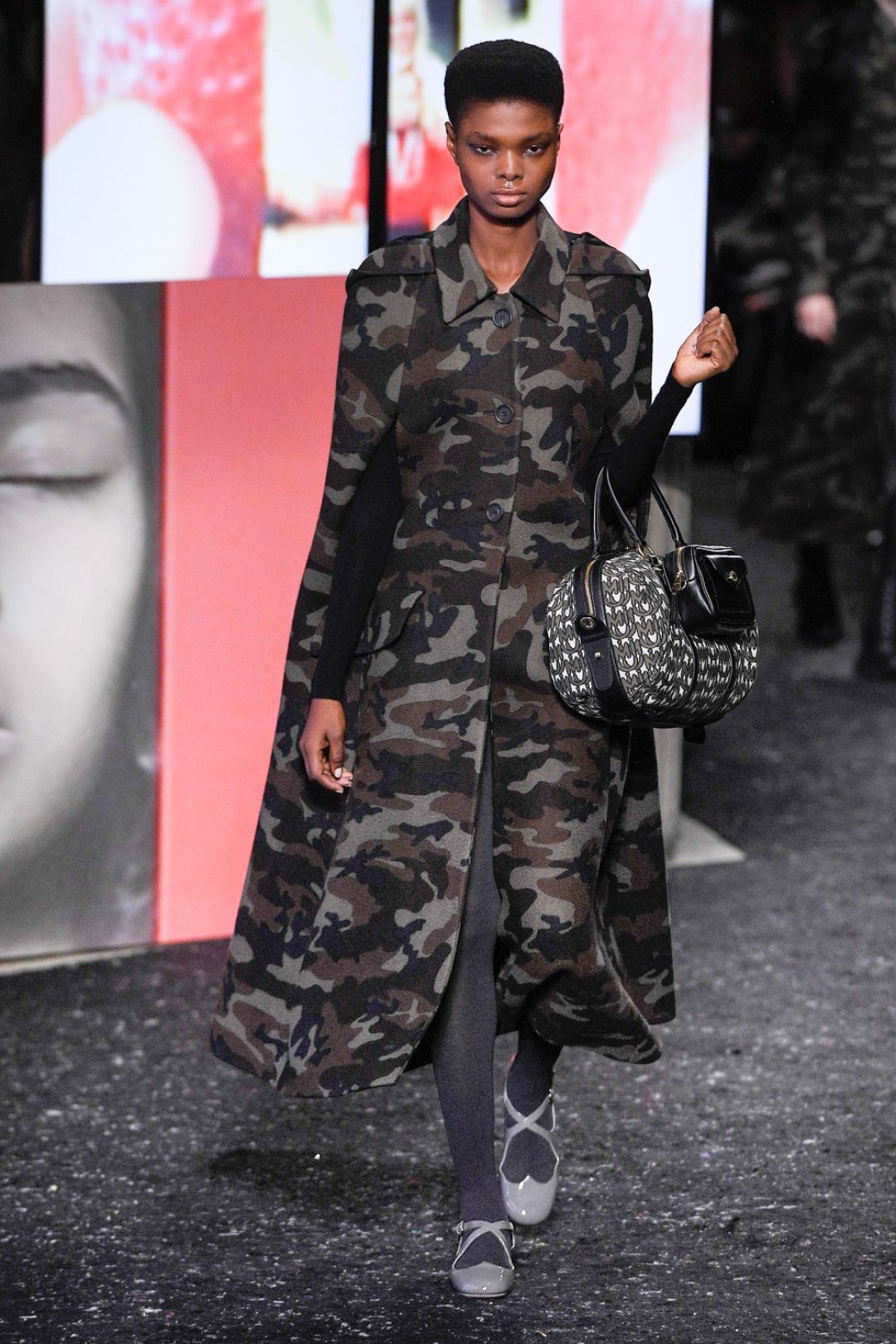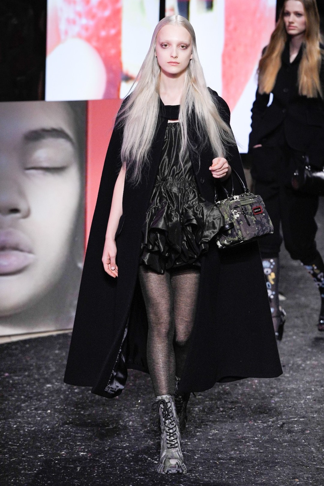 Miu Miu показали коллекцию в Париже — в окружении плакатов с лоу-фай кадрами, которые продолжили недавнюю рекламную кампанию бренда, и телевизоров с видео-клипами, созданными для него новозеландской художницей и клипмейкером Шарной Осборн.