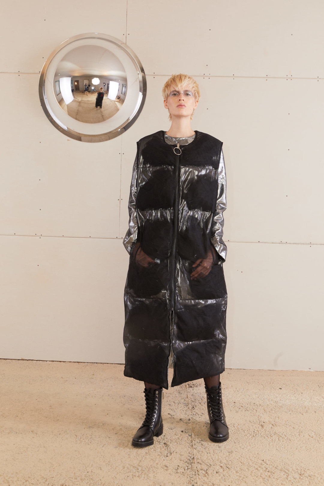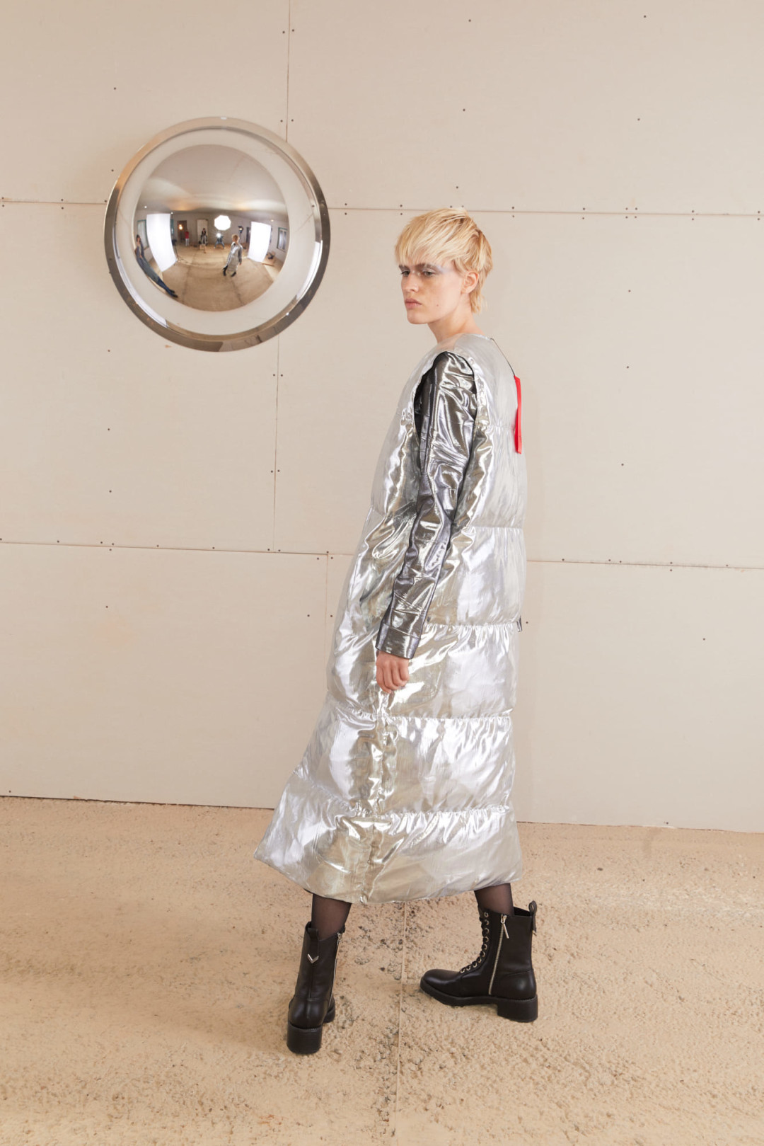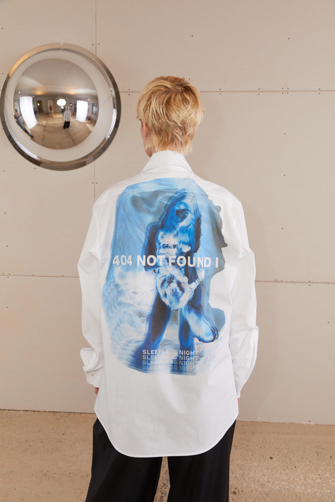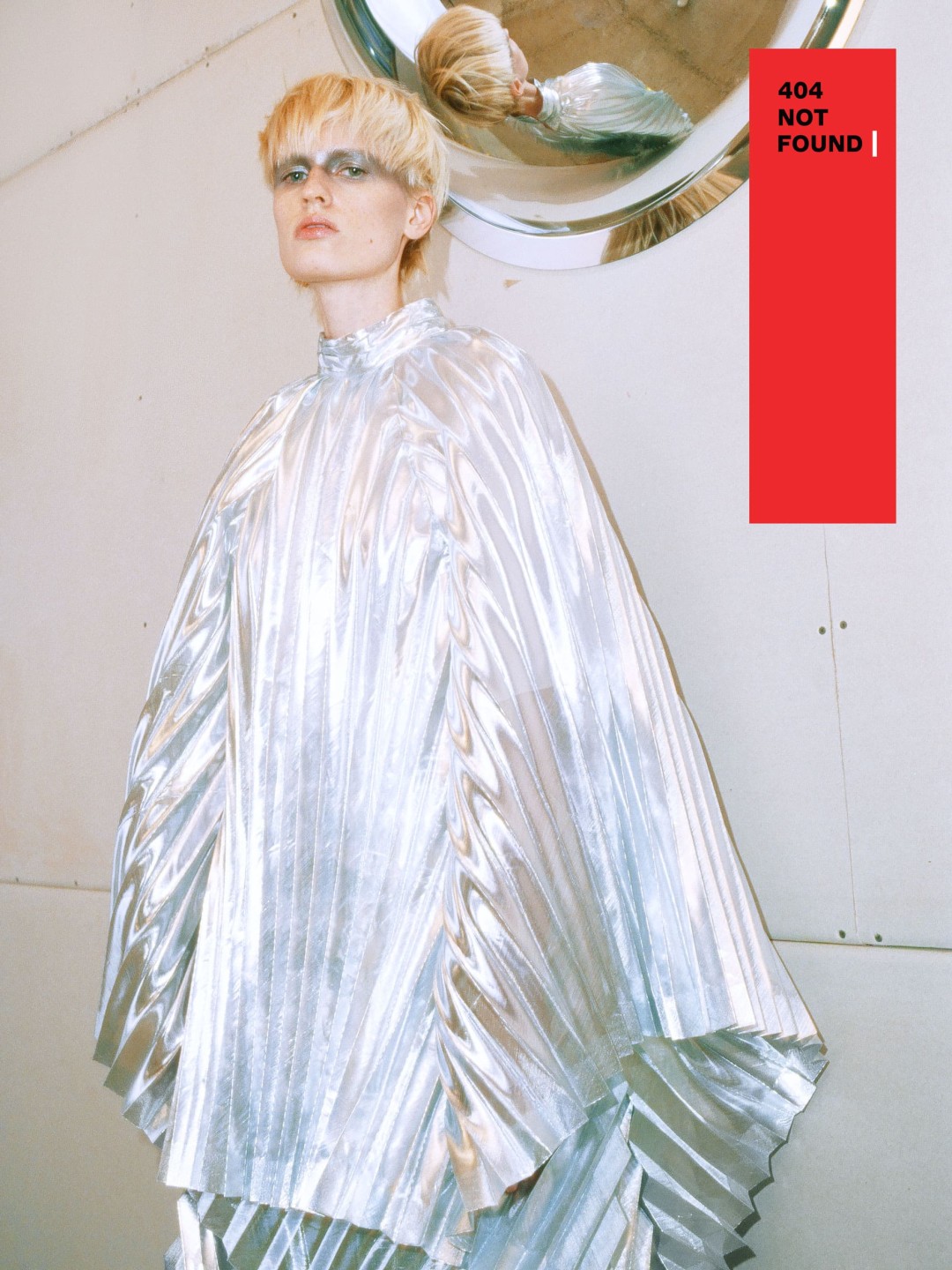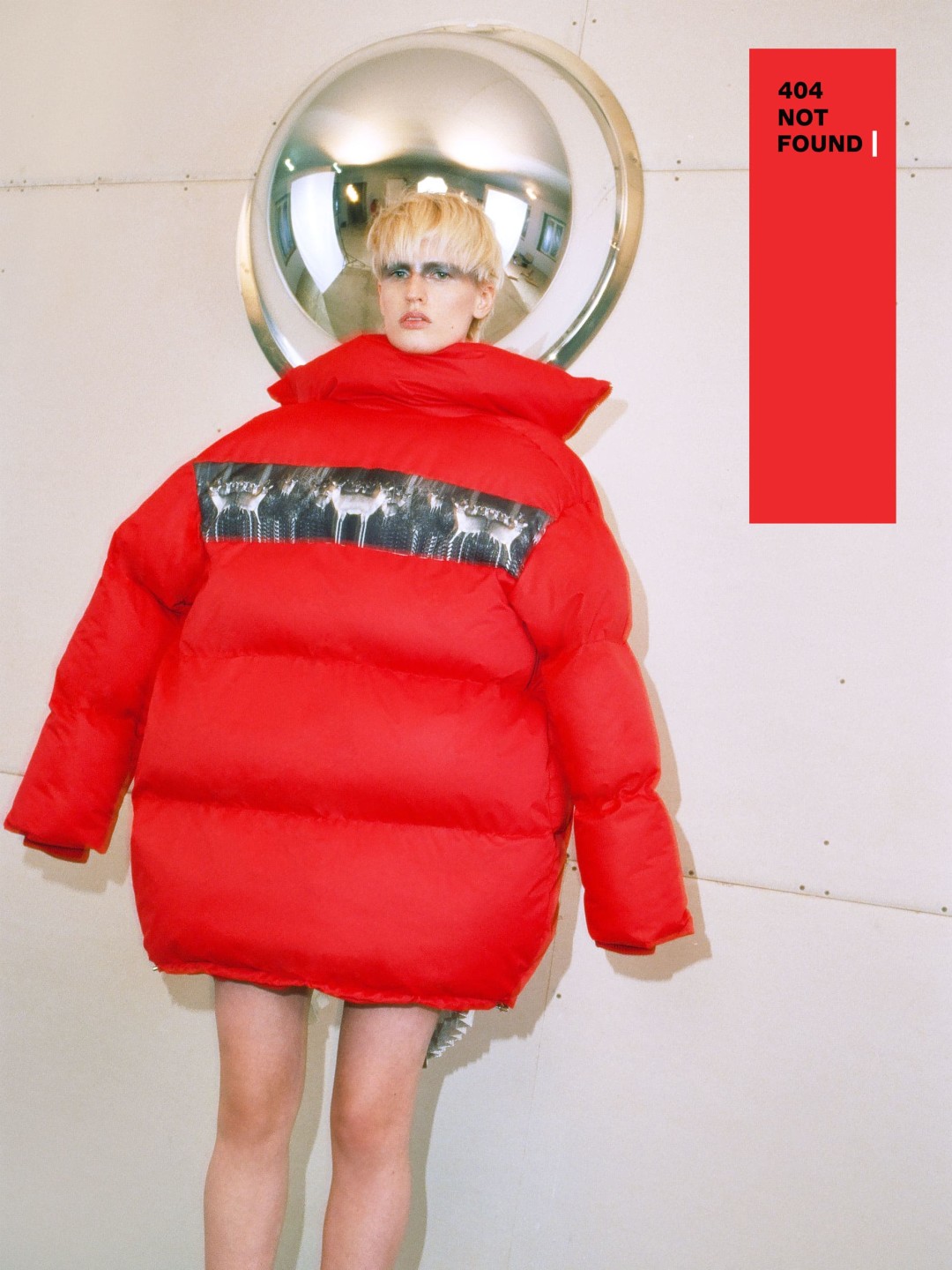 Самая кутюрная модель в коллекции — плиссированное платье из вручную сложенного гофре, на которым работали сразу несколько мастеров во главе с дизайнером Аленой Феликсовой — стала оммажем фильму «Бегущий по лезвию» и получила название «Blade». Но главная часть мудборда 404 NOT FOUND — это съемка скрытыми камерами: именно их имитируют геометричные орнаменты на пижамных костюмах и металлические пуговицы на драпированных платьях. Результаты видеонаблюдения стали принтами на верхней одежде: урбанистические жилеты и оверсайзовые пуховики дополнены снимками призрачных оленей.