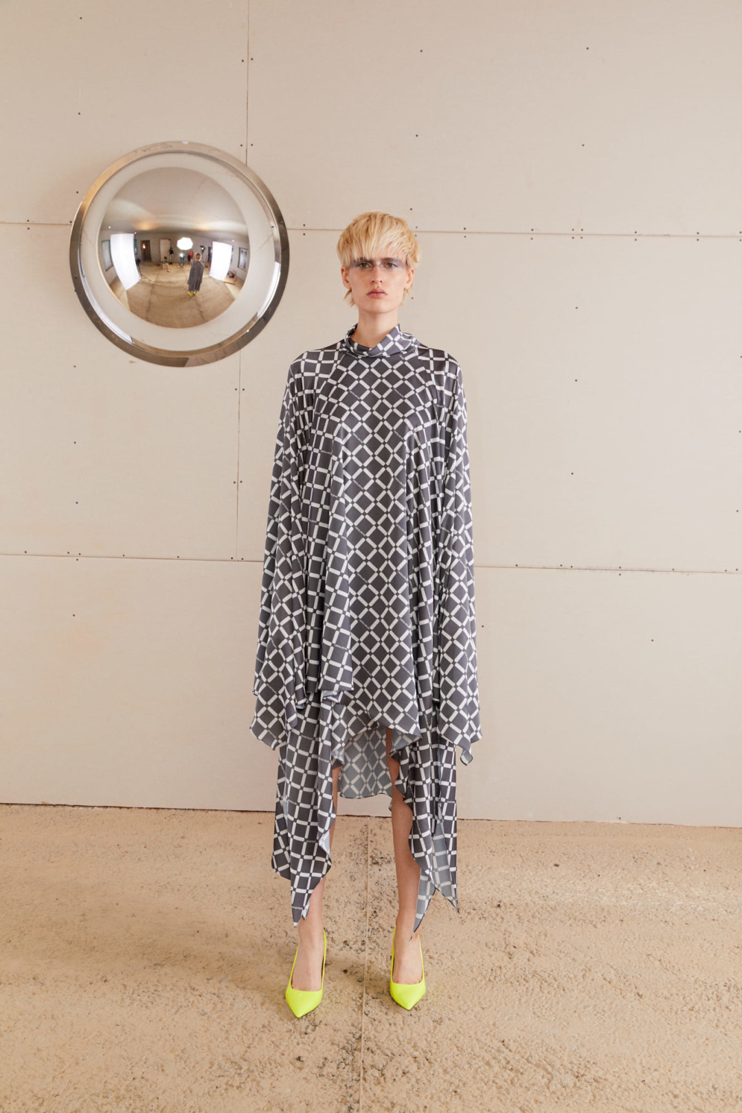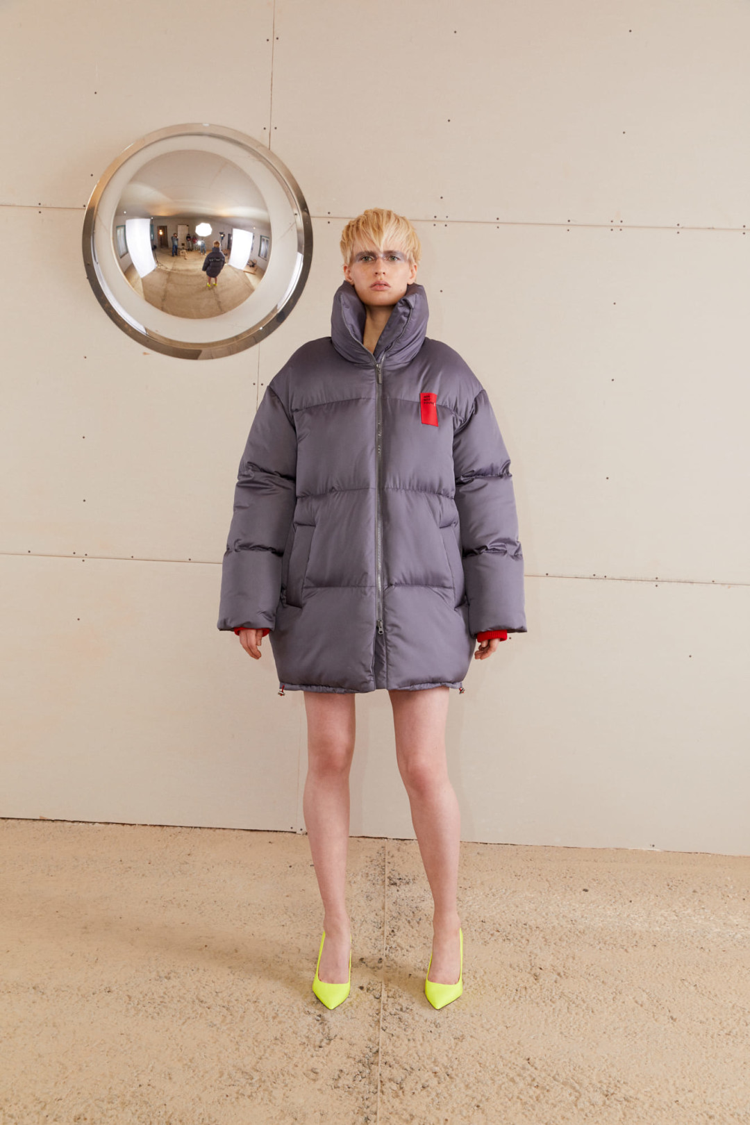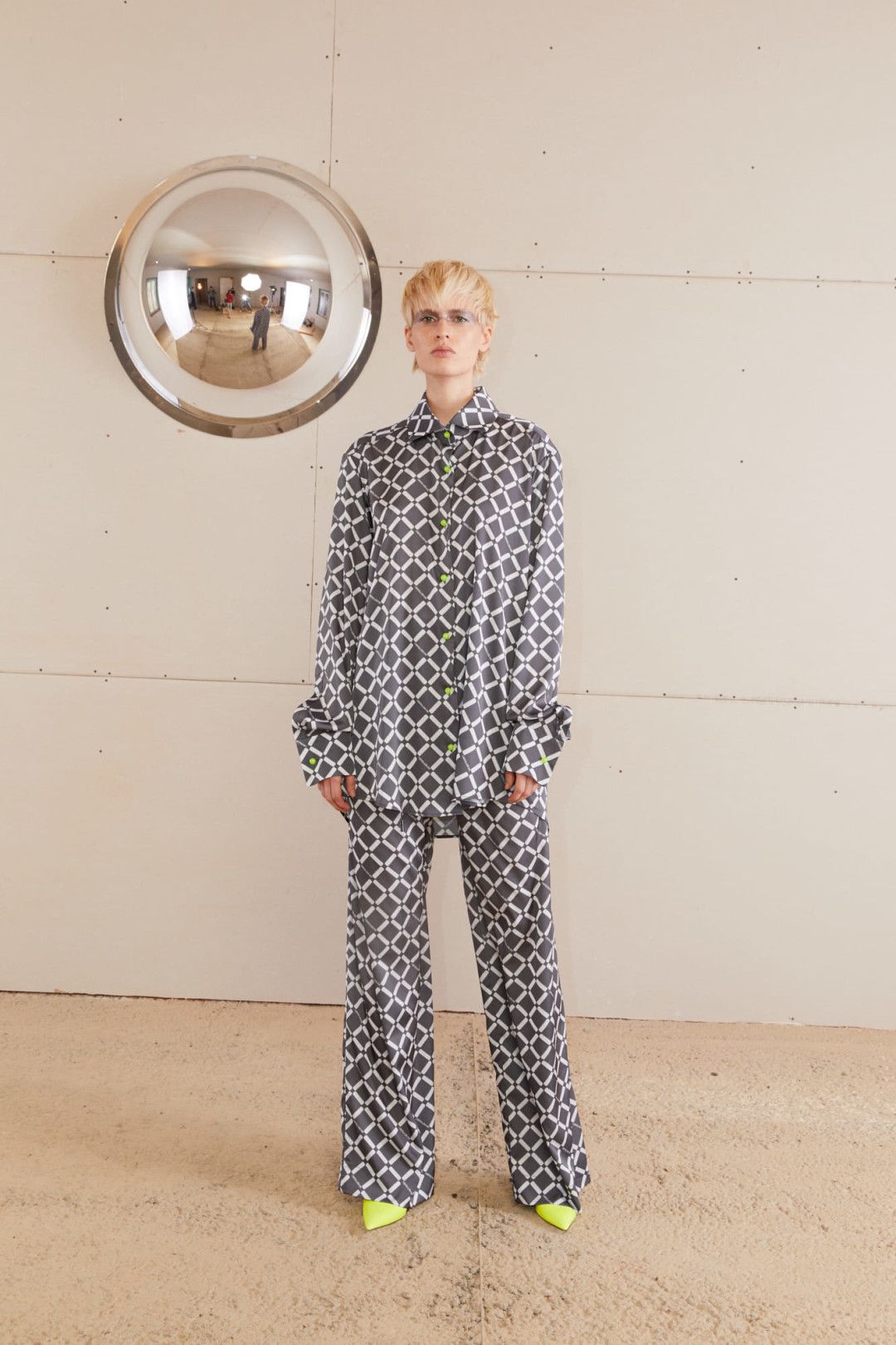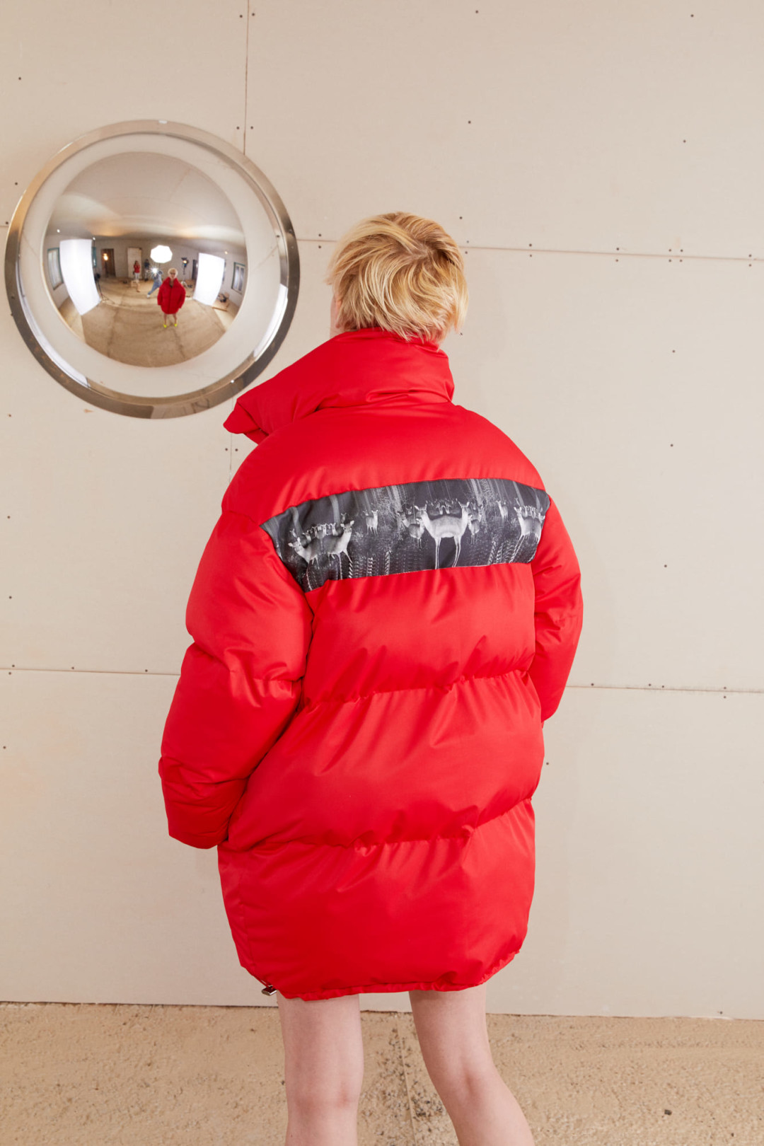 Самая кутюрная модель в коллекции — плиссированное платье из вручную сложенного гофре, на которым работали сразу несколько мастеров во главе с дизайнером Аленой Феликсовой — стала оммажем фильму «Бегущий по лезвию» и получила название «Blade». Но главная часть мудборда 404 NOT FOUND — это съемка скрытыми камерами: именно их имитируют геометричные орнаменты на пижамных костюмах и металлические пуговицы на драпированных платьях. Результаты видеонаблюдения стали принтами на верхней одежде: урбанистические жилеты и оверсайзовые пуховики дополнены снимками призрачных оленей.