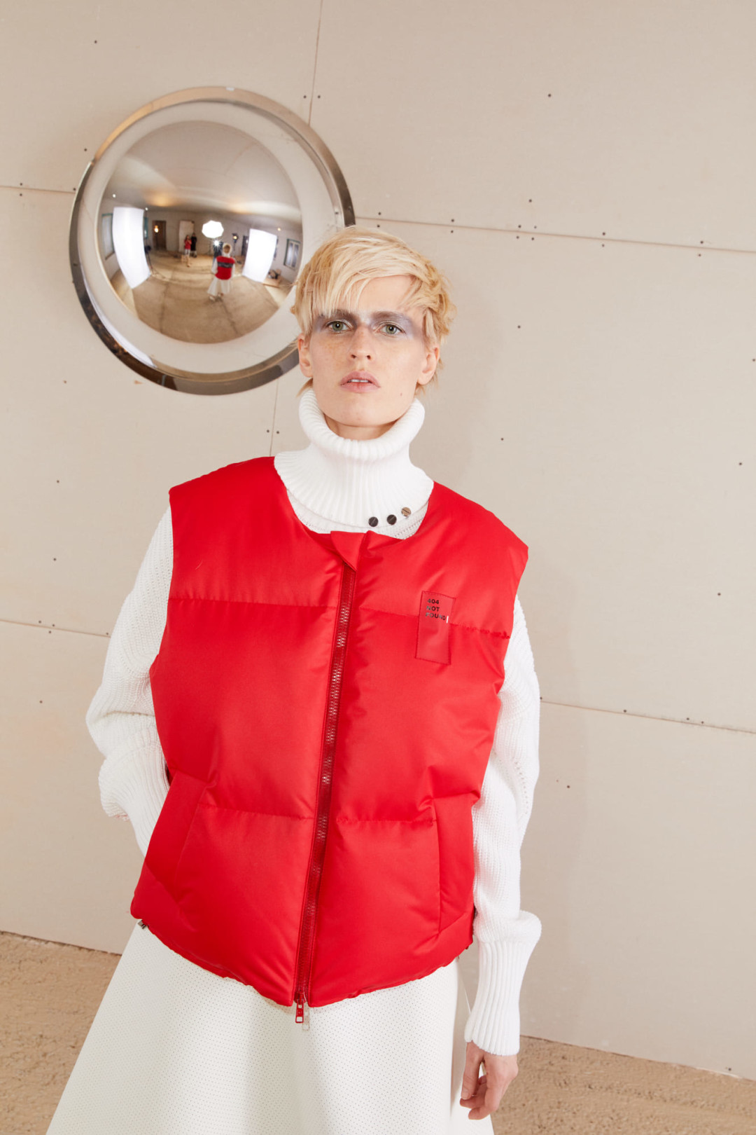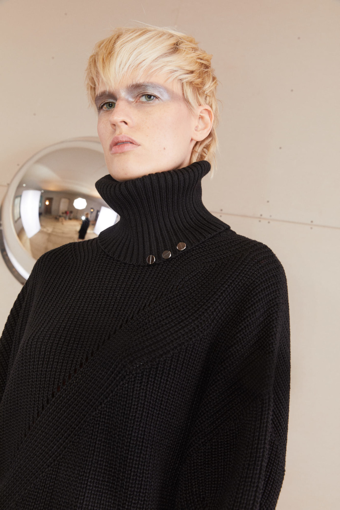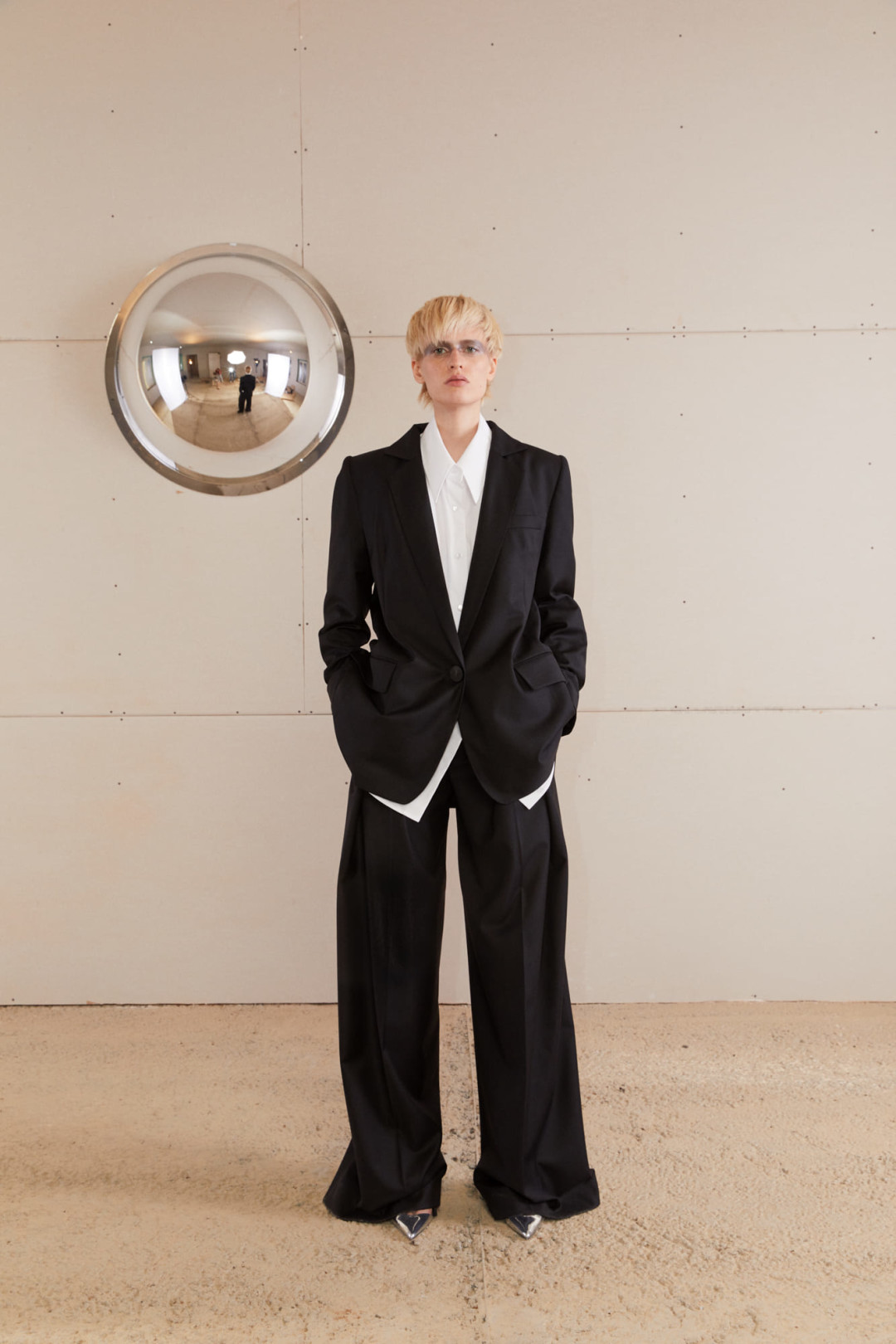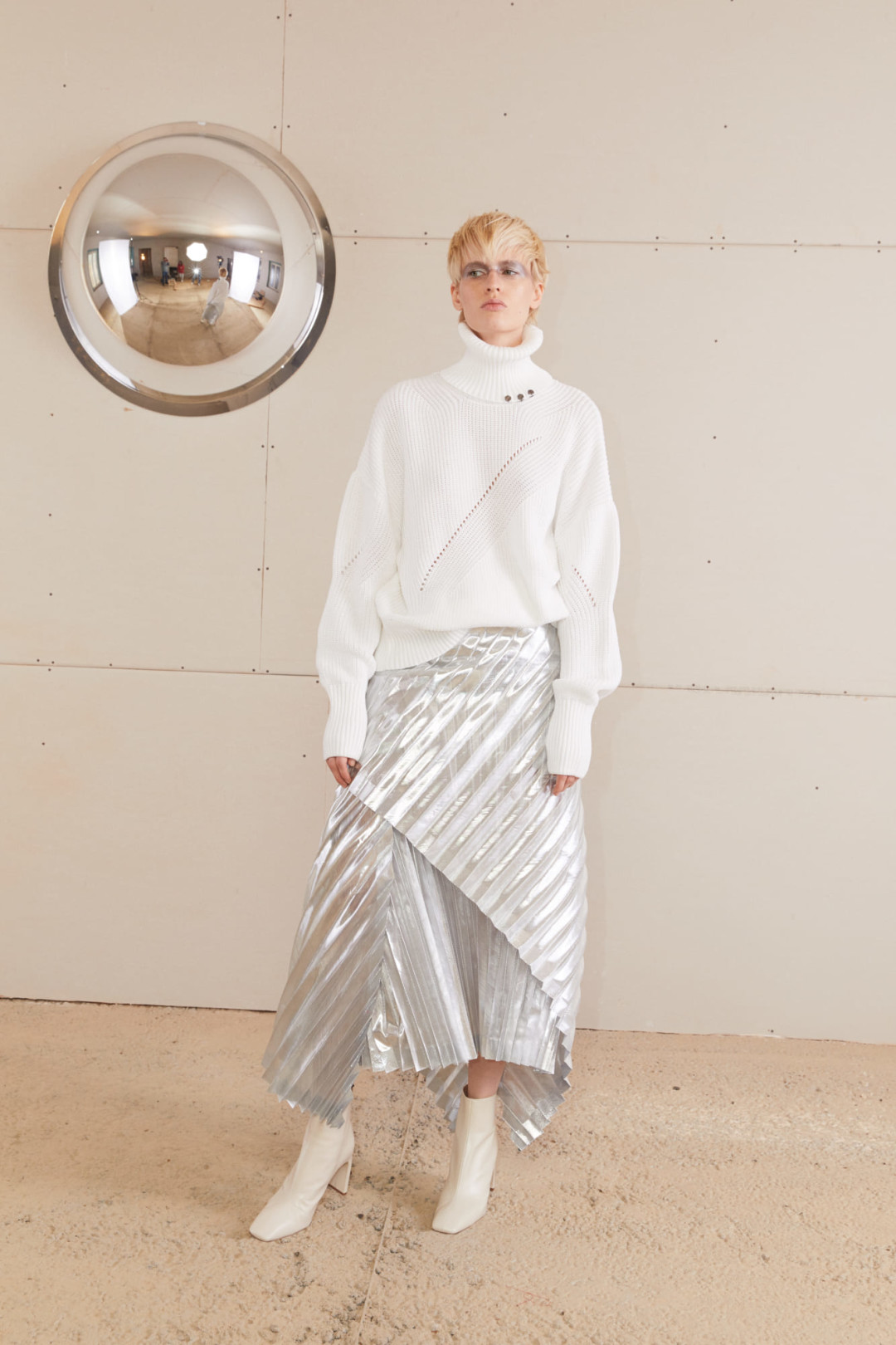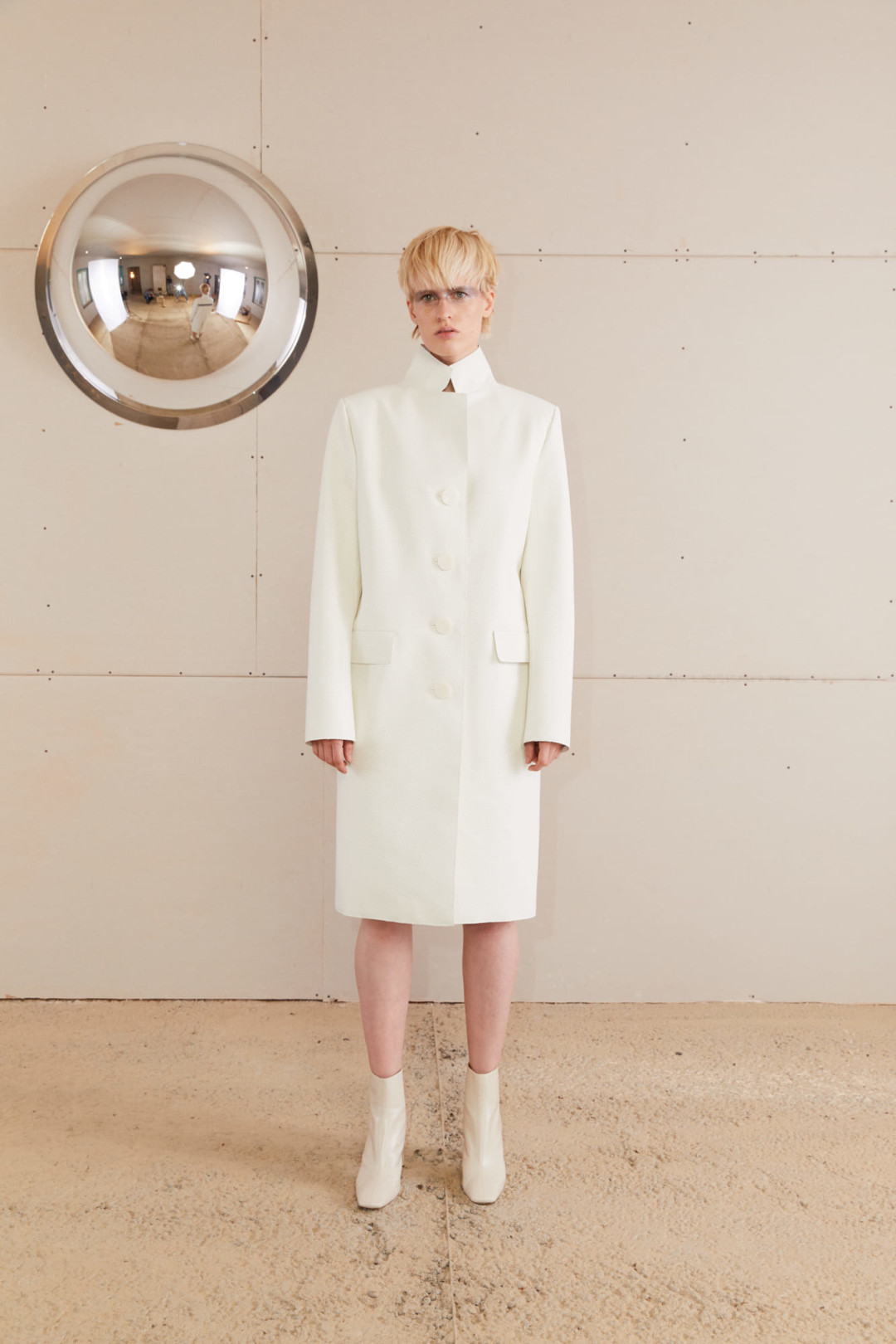 Самая кутюрная модель в коллекции — плиссированное платье из вручную сложенного гофре, на которым работали сразу несколько мастеров во главе с дизайнером Аленой Феликсовой — стала оммажем фильму «Бегущий по лезвию» и получила название «Blade». Но главная часть мудборда 404 NOT FOUND — это съемка скрытыми камерами: именно их имитируют геометричные орнаменты на пижамных костюмах и металлические пуговицы на драпированных платьях. Результаты видеонаблюдения стали принтами на верхней одежде: урбанистические жилеты и оверсайзовые пуховики дополнены снимками призрачных оленей.