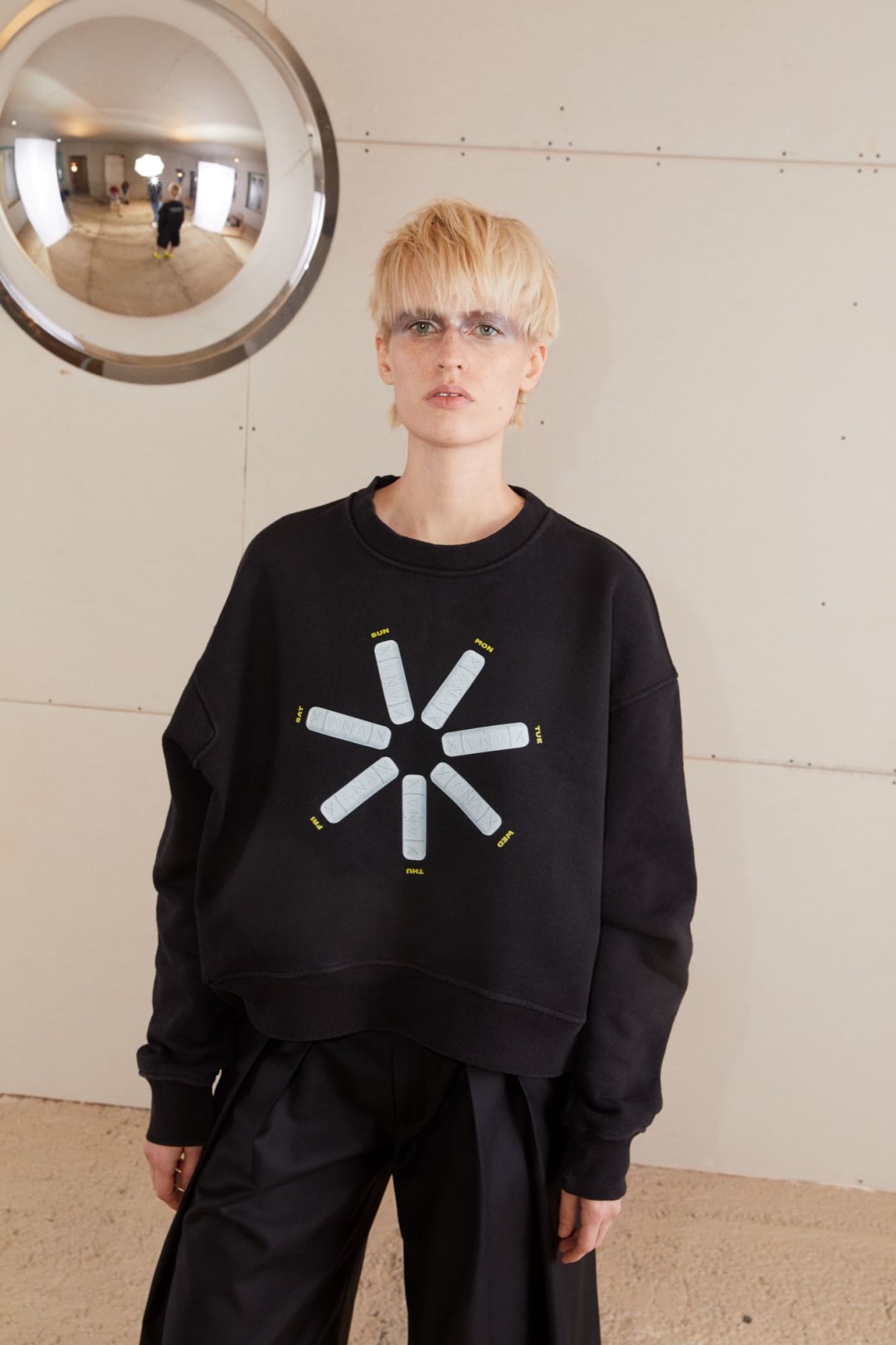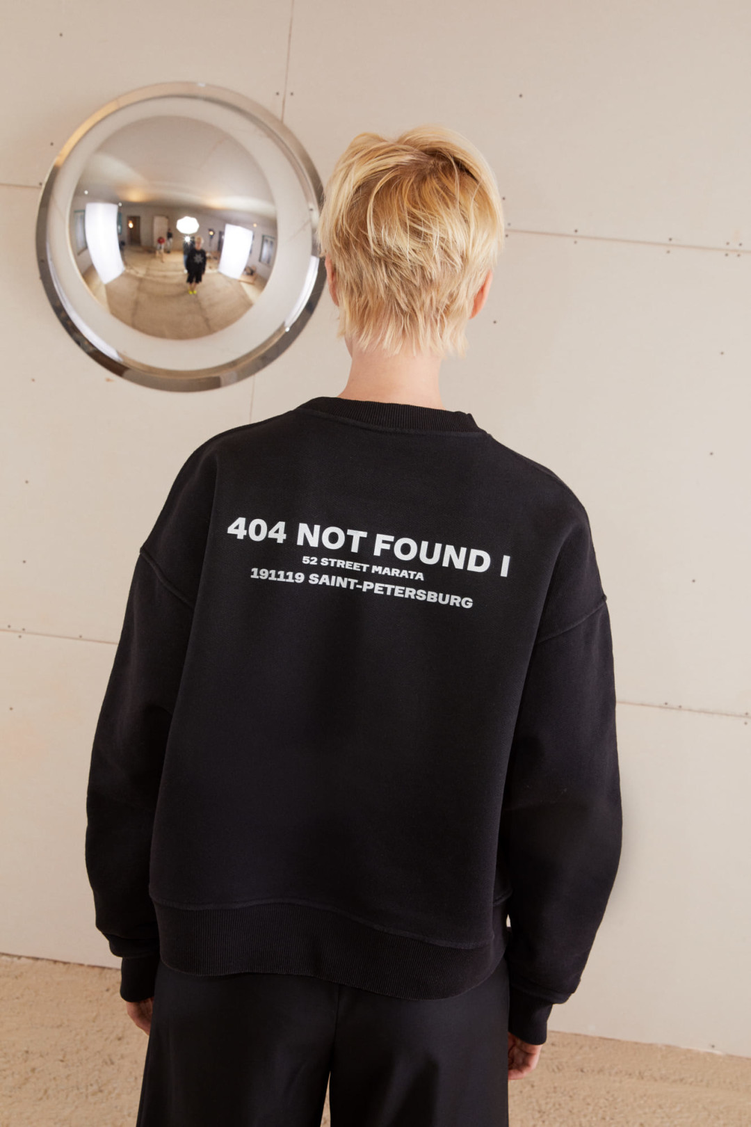 Талисманом от серости урбанизма, технологий, слежки и социальных сетей — тем, которые также подчеркнуты в коллекции материалами (шерсть, трикотаж и перфорированная кожа) и цветами (черный, серый, белый и красный) — стали таблетки Xanax. Они выложены на свитшоте по дням недели и в форме солнца, в то время как заднюю сторону вещи украшает адрес и индекс штаб-квартиры 404 NOT FOUND – Санкт-Петербург, улица Марата, 52.