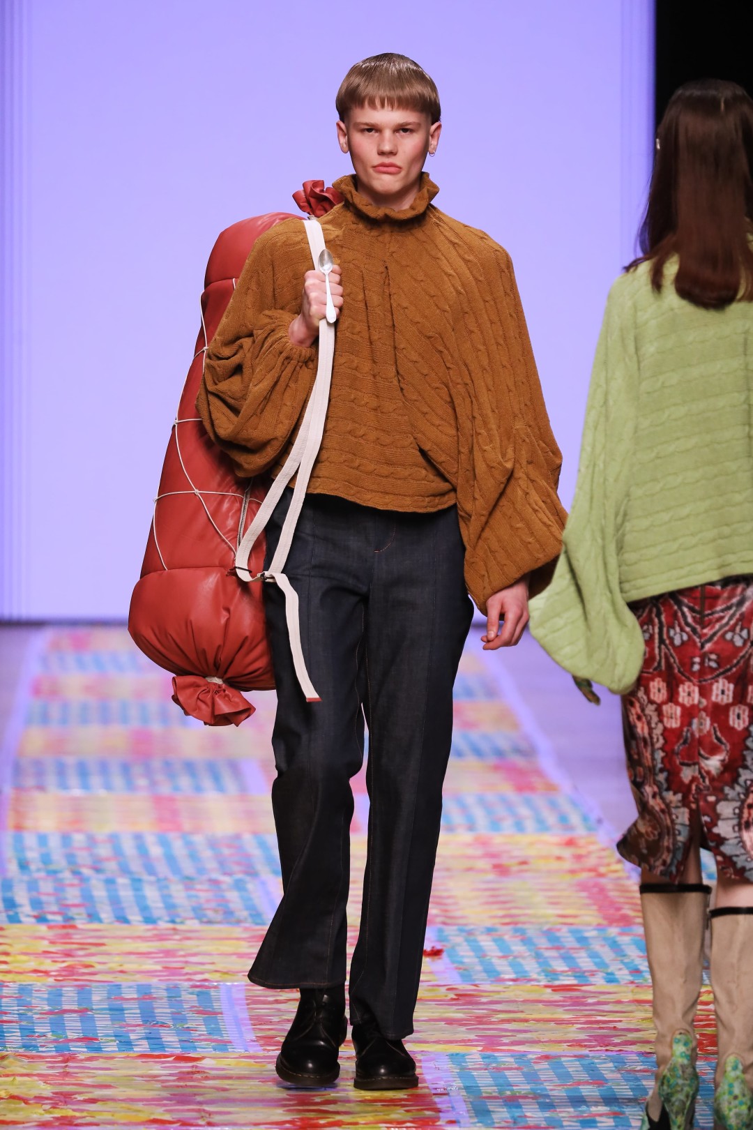 Оскар Ренкель: Это единственный показ, который выглядит круто, — гипертрофированные объемы, инфантильные элементы, яркие, но при этом не ядовитые цвета. Вся Москва уже ходит в такой одежде, и я бы к ней присоединился! Конечно, есть вопросы к «защипанным» плечам, которые уже встречались у Рика Оуэнса и Рафа Симонса, но в целом, мне все нравится! Особенно вещи из кожи.