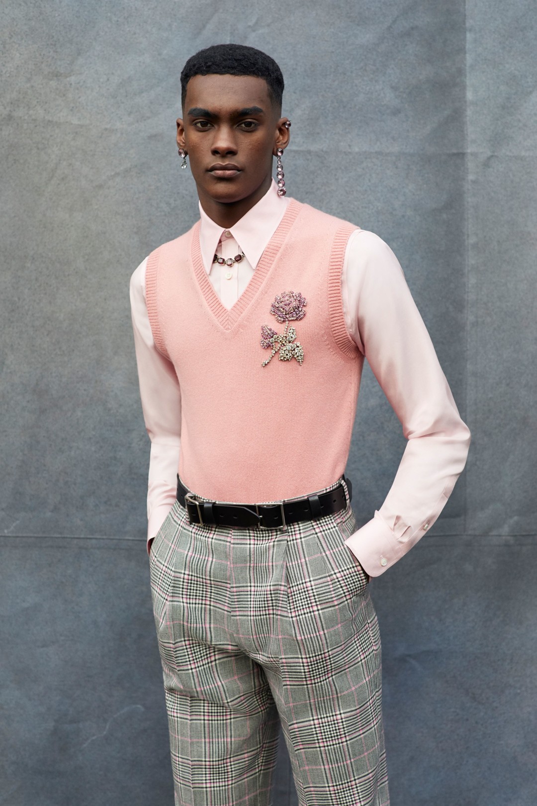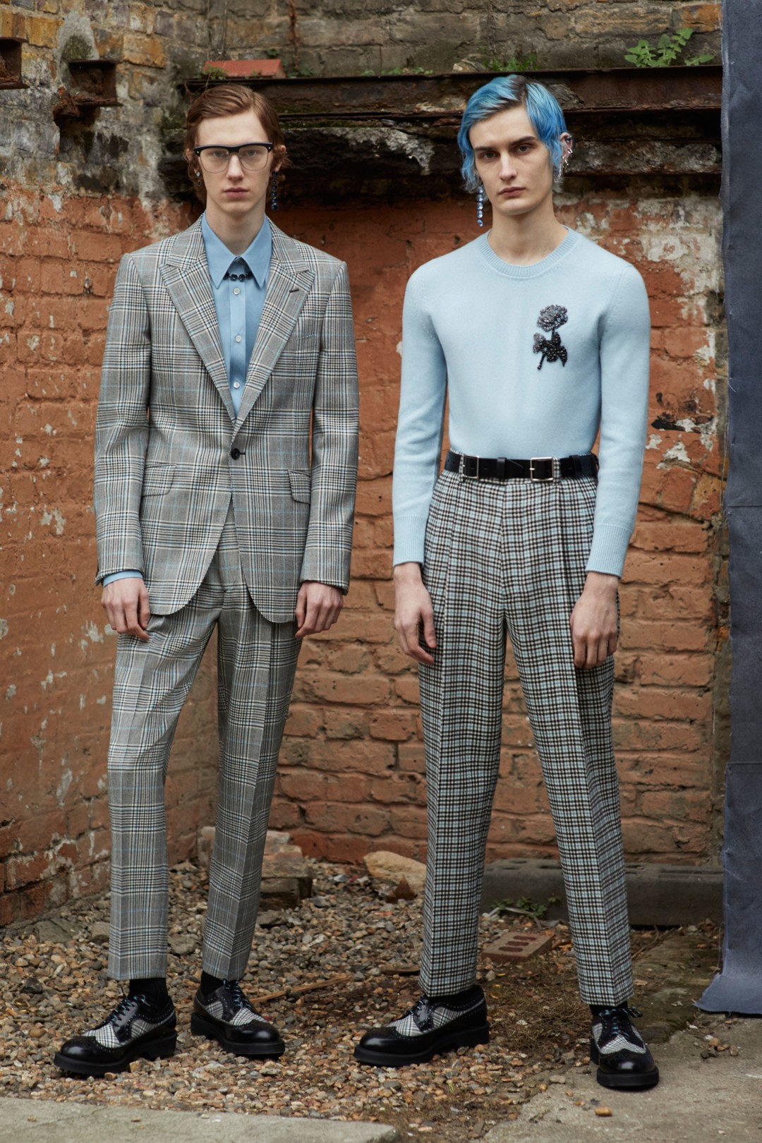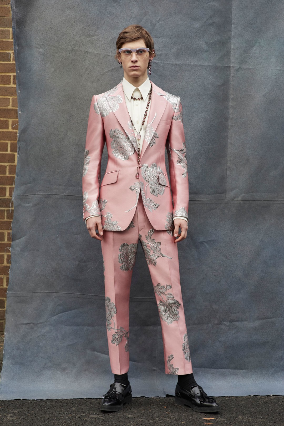 Креативный директор Alexander McQueen Сара Бертон показывает, как будут выглядеть мужчины в 2020 году: джемперы с цветочными вышивками, заправленные в классические брюки, розовые костюмы, стилизованные ожерельями и сережками, обтягивающие пиджаки, дополненные имитацией кружева, и кожаные юбки с торчащими из-под подола брюками.