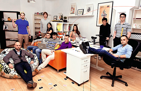 Слева направо: арт-директор Никита Юткин, дизайнер Андрей Ильин, арт-директор Алексей Пушков (стоит), дизайнер Нина Пушкова, технический директор Евгений Головин, разработчик IT Роман Хан, креативный директор Макс Федоров, руководитель проектов Татьяна Ив
