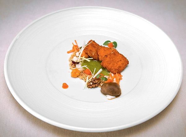 Капусту порезать, подержать в маринаде из яблочного сока 5 минут, обвалять в панировке и обжарить во фритюре. Грецкие орехи измельчить. Яблоко нарезать кубиками. Морковь протереть через сито, добавить соль, перец, растительное масло и тушить на сковороде. На тарелку выложить все ингредиенты и морошку. В самом конце добавить сорбет. Для приготовления сорбета капусту протушить, добавить соль и сахар, в конце влить бальзамический уксус. Измельчить, затем добавить растительное масло. Полученную эмульсию пропустить через мороженицу. Положить в силиконовую форму для застывания. |