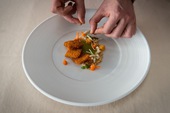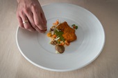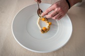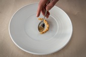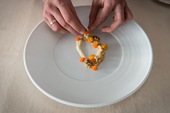 Капуста белокочанная 45 г / Сухарная панировка 15 г / Грецкий орех 20 г / Яблоко 10 г / Морковь 10 г / Морошка 10 г / Сок яблочный свежевыжатый 30 г / Масло растительное 25 г Для сорбета: Капуста белокочанная 100 г / Бальзамический уксус 16 г / Сахар 10 г / Соль по вкусу |