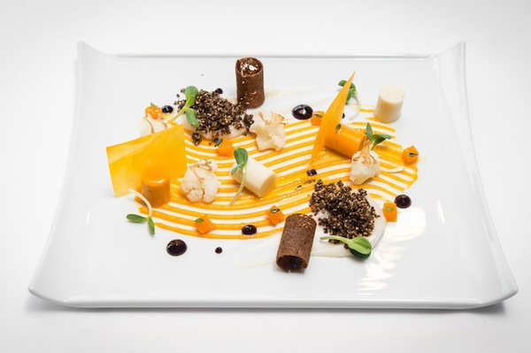 Цветная капуста с тыквой, семенами подсолнечника и соусом из изюма