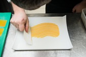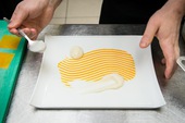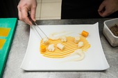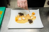Отварить капусту, пропустить через блендер вместе с отваром. В пюре добавить замоченный желатин, залить в форму, охладить до застывания. Тыкву очистить от кожуры, запечь под фольгой до готовности с медом, розмарином и маслом шалфея. Печеную тыкву нарезать на кубики размером 5 мм, измельчить их в блендере, приправить сахаром, солью и медом. В пюре из тыквы добавить замоченный желатин, залить в форму и охладить до застывания. Хлеб нарезать и подсушить, добавить семечки и измельчить в крошку. Изюм замочить и залить вином, варить 2–3 часа на слабом огне под крышкой, измельчить блендером. Выложить на тарелку полученные капустные и тыквенные роллы, крамбл из хлеба и семечек, украсить проростками подсолнечника. |