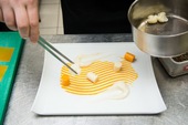 Отварить капусту, пропустить через блендер вместе с отваром. В пюре добавить замоченный желатин, залить в форму, охладить до застывания. Тыкву очистить от кожуры, запечь под фольгой до готовности с медом, розмарином и маслом шалфея. Печеную тыкву нарезать на кубики размером 5 мм, измельчить их в блендере, приправить сахаром, солью и медом.