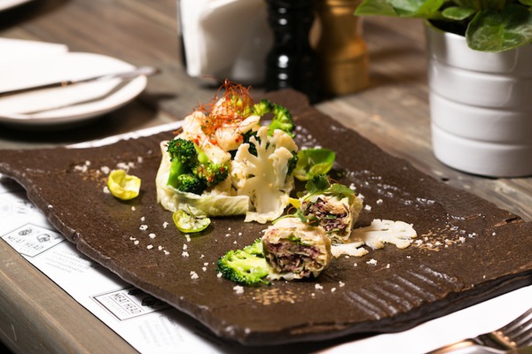 Цветную капусту и брокколи готовить вместе в подсоленной воде с оливковым маслом. Смешать капусту с соусом шисо-сальса. Выложить на тарелку, украсив сухими волокнами перца чили и листьями брюссельской капусты. Добавить ролл из китайской, белокочанной и краснокочанной капусты. Для приготовления соуса шисо-сальса смешать соевый соус, яблочный уксус, кунжутное масло, патоку (вместо этих ингредиентов можно использовать готовый соус Au Jus), масло виноградных косточек, зеленый табаско и мелко нарезанный красный перец чили. Для приготовления ролла в листья китайской капусты завернуть нашинкованную белокочанную и краснокочанную капусту и заправить бальзамическим соусом с кинзой. Бальзамический соус можно приготовить из масла виноградных косточек, чесночного пюре, кайенского перца и сахара. |