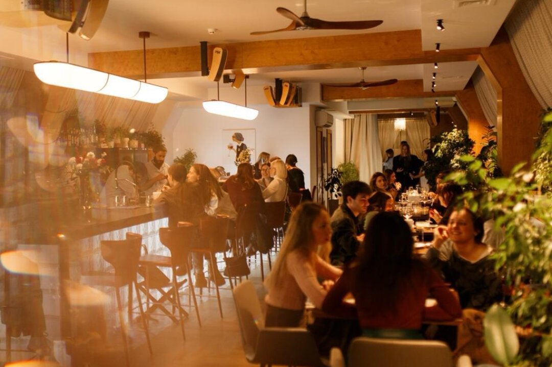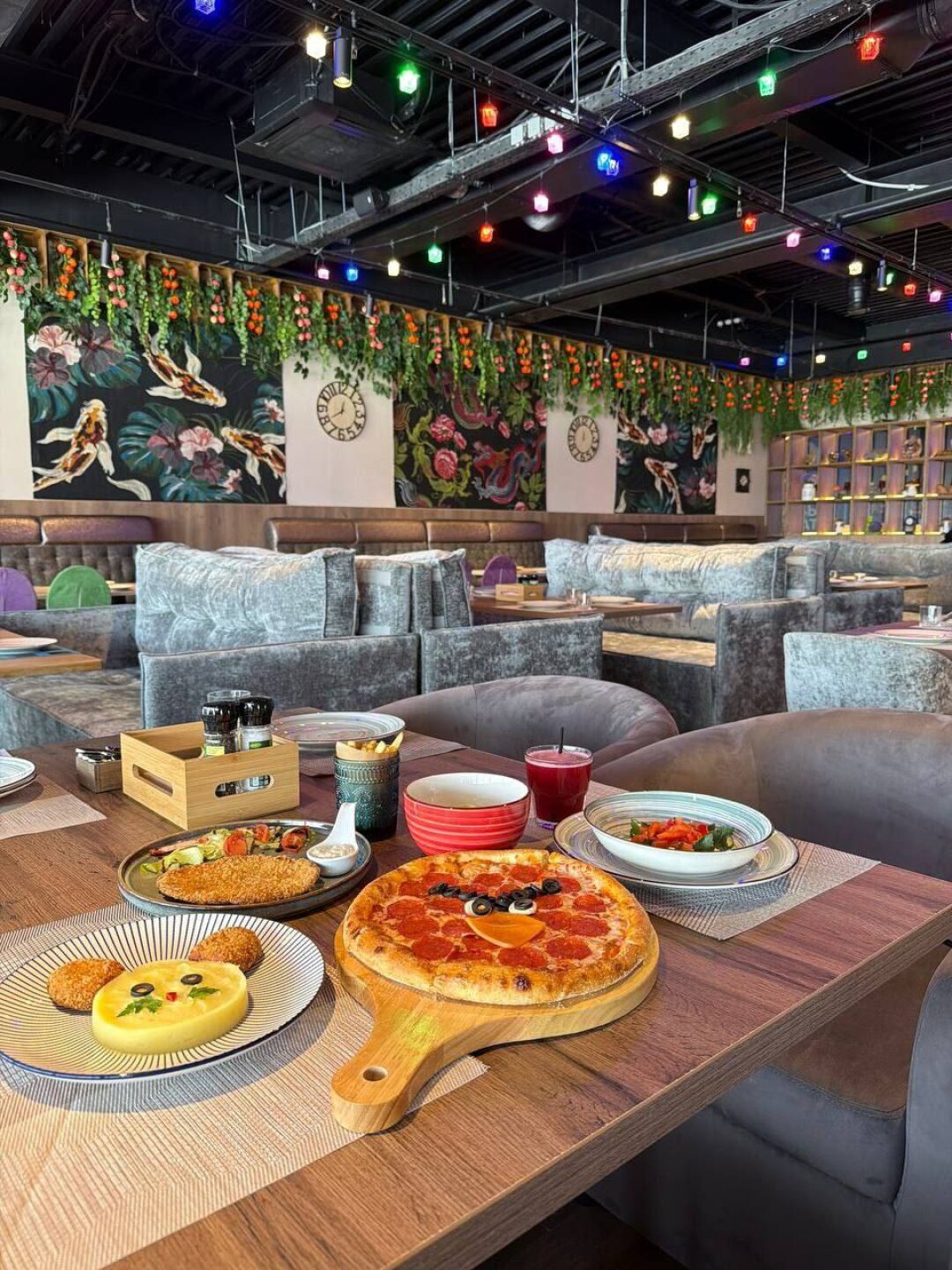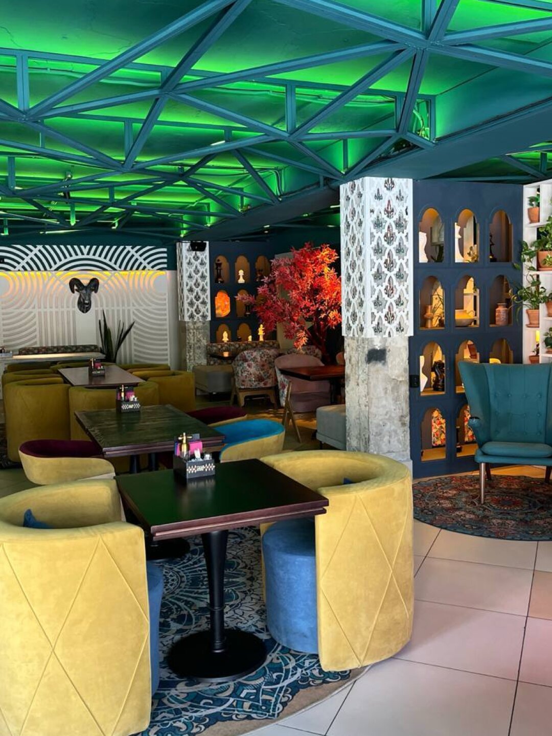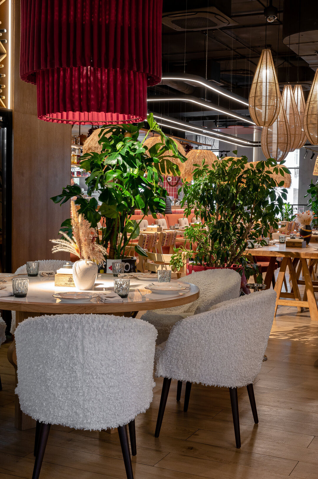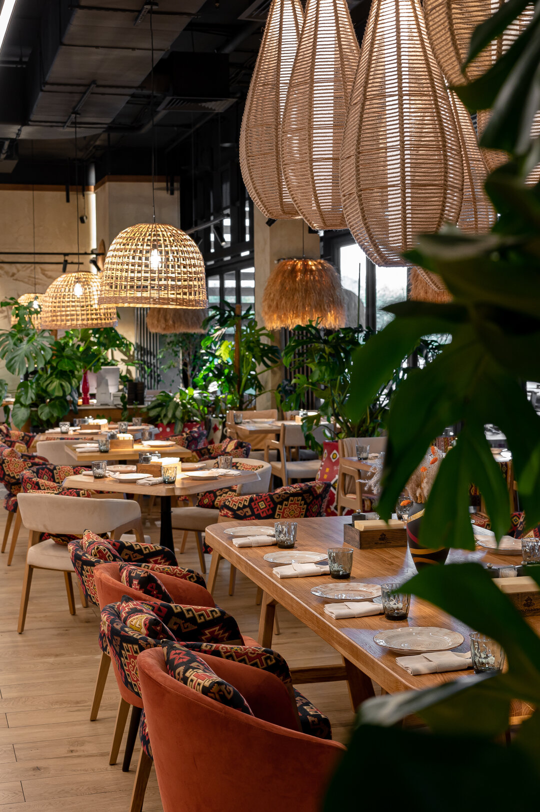 Здесь, в пространстве, наполненном светом благодаря панорамным окнам, царит гармония стиля и уюта. Узнаваемый фирменный дизайн ресторана – это элегантное сочетание мягких кресел с изысканным орнаментом, фактурных светильников, создающих приглушенное освещение, и живой зелени, добавляющей свежести и природной красоты. Колоритные кашпо с растениями завершают картину, создавая ощущение оазиса спокойствия и вкуса.