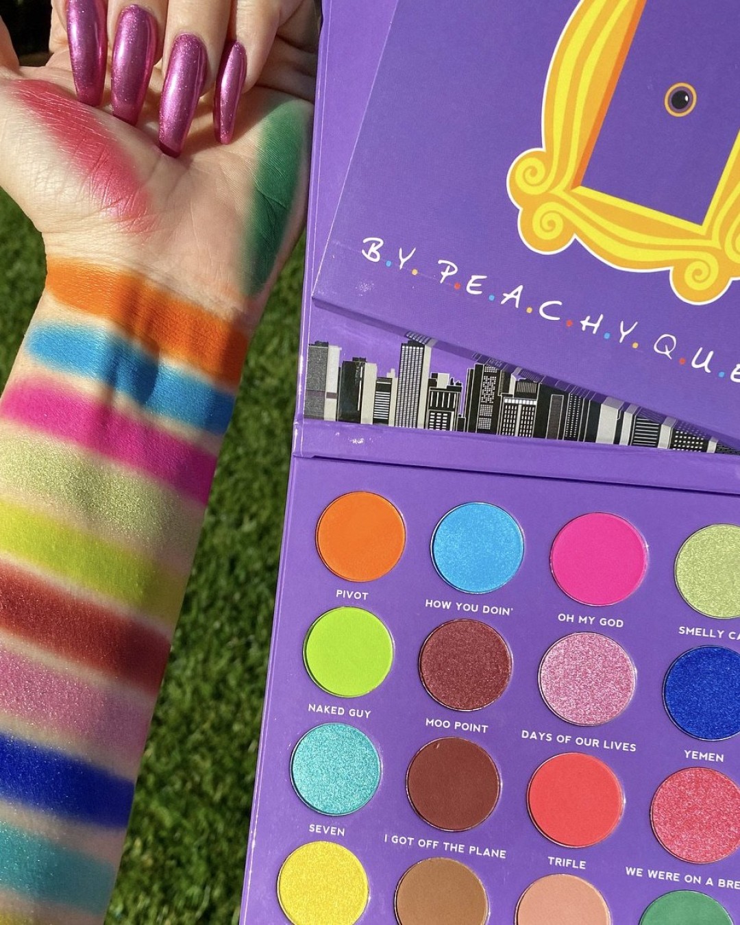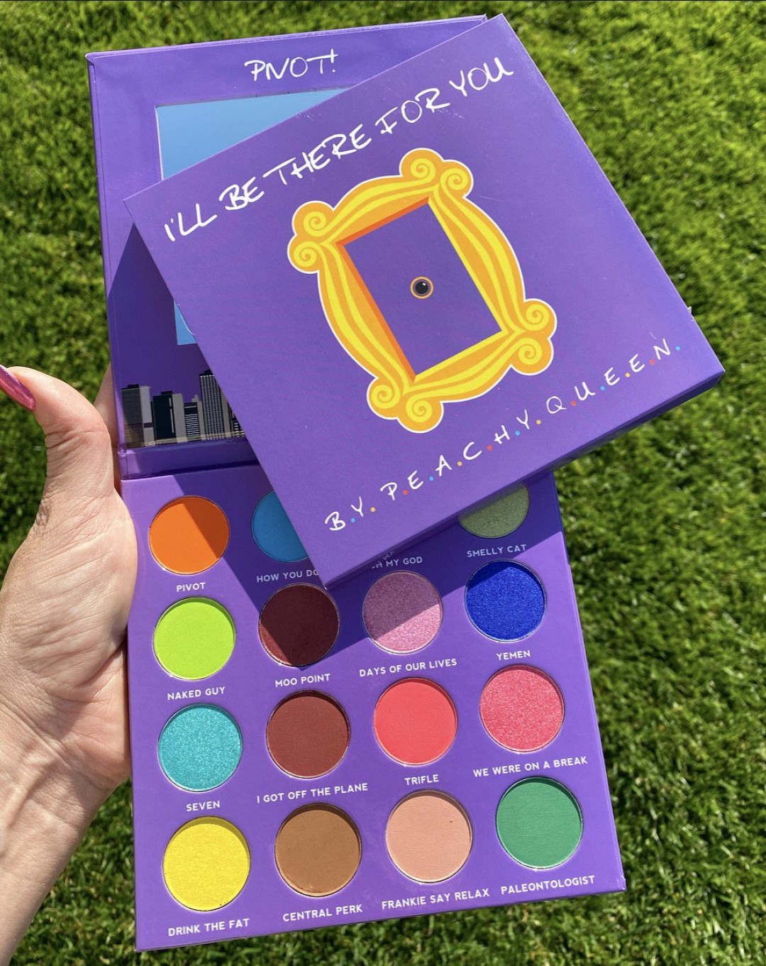 Вспомнить о главных приключениях «Друзей» можно не только пересмотрев старые эпизоды сериала, но и открыв палетку теней от бренда Peachy Queen. Название каждого оттенка отсылает к фразам, произнесенным героями, их профессиям, песням и даже нарядам: «Smelly Cat» (название композиции, которую исполняла Фиби), «Naked Guy» (прозвище, полученное соседом-нудистом), «Oh My God» (фирменный восклик Дженис), Paleontology (труднопроизносимая специальность Росса) и Central Perk (легендарная кофейня друзей). Сами же тени напоминают макияж Фиби конца 1990-х-начала 2000-х годов: это кислотно-зеленые, мерцающе-бирюзовые, ярко-оранжевые и приглушенно-коричневые оттенки. Заказать палетку можно на сайте Peachy Queen за 29,99 долларов (плюс доставка!).