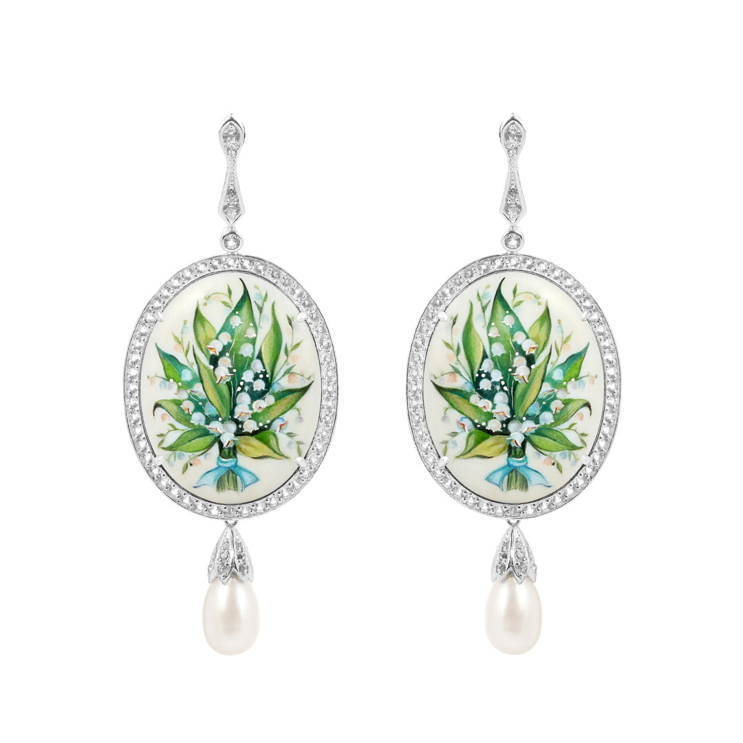 Два эмалевых натюрморта в рамке из стерлингового серебра и бесцветных топазов настолько благолепны, что мироточат каплевидными жемчужинами.