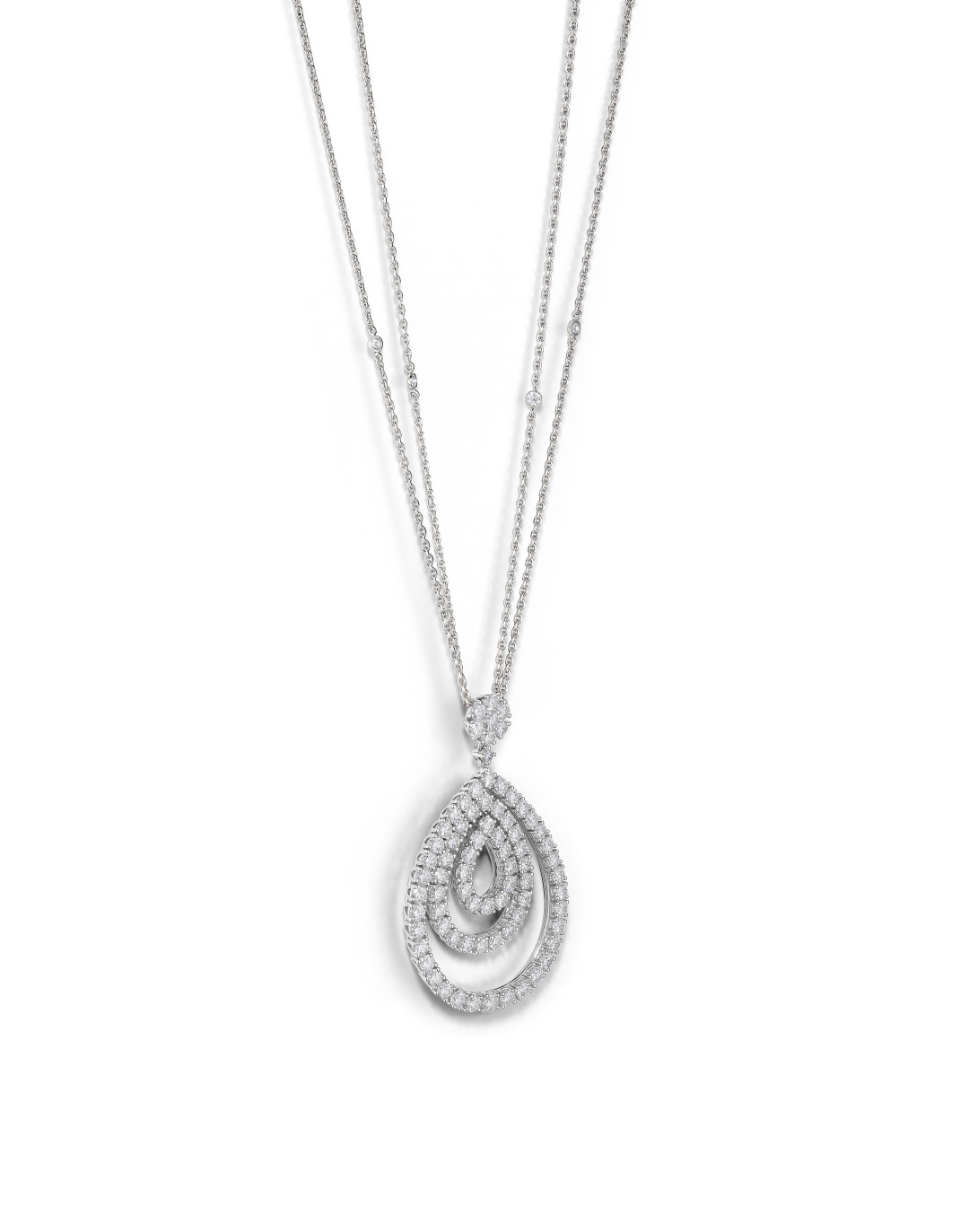 Контуры трех капель из белого «этичного» золота инкрустированы бриллиантами круглой огранки весом в 6,7 карата.