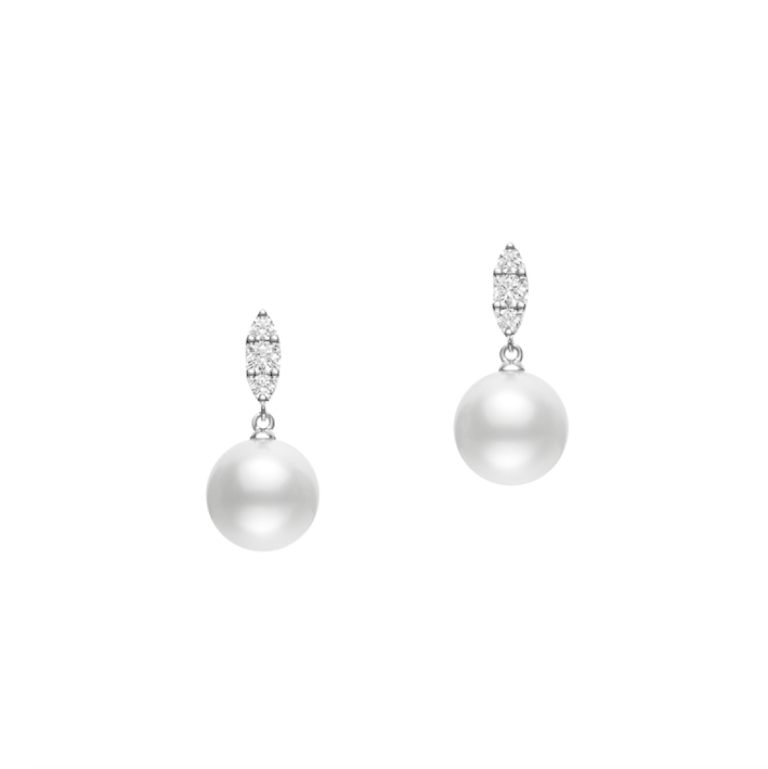 С уложенных в форму «маркиза» круглых бриллиантов стекают культивированные жемчужины южных морей.