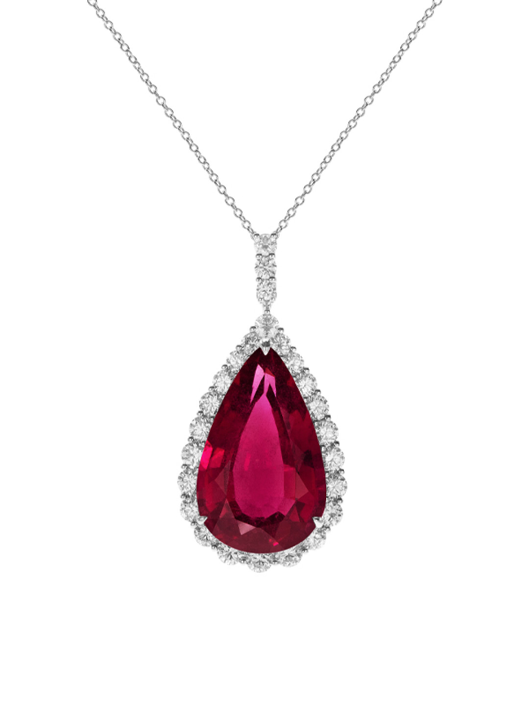 Огромный (33 с половиной карата!) рубеллит огранки «груша» уравновешивает застежка с обратной стороны колье — капля из цельного золота и две с бриллиантовым паве.