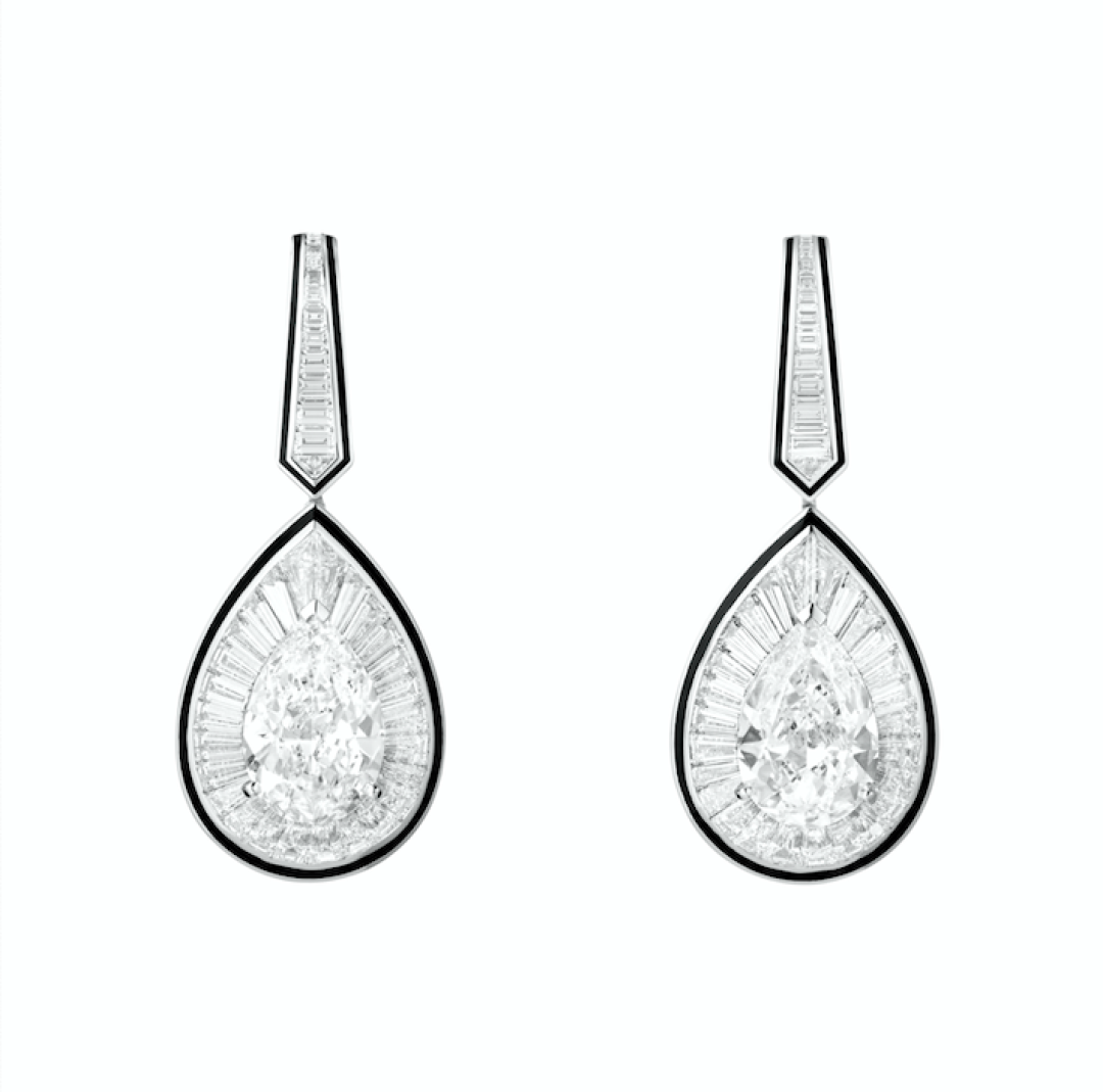 В высокой ювелирной коллекции Histoire de Style вышла наглядная лекция по ар-деко. Трехкаратная «груша» каждой из сережек окружена нимбом багетных бриллиантов с черной лаковой оторочкой.
