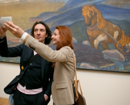 Солисты балета Мариинского театра Екатерина Кондаурова и Ислом Баймурадов на экскурсии по экспозиции картин в корпусе Бенуа.