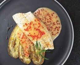 Сибас на пару с баклажанами, красной икрой и соусом беарнез на кокосовом масле от Артема Чудненко