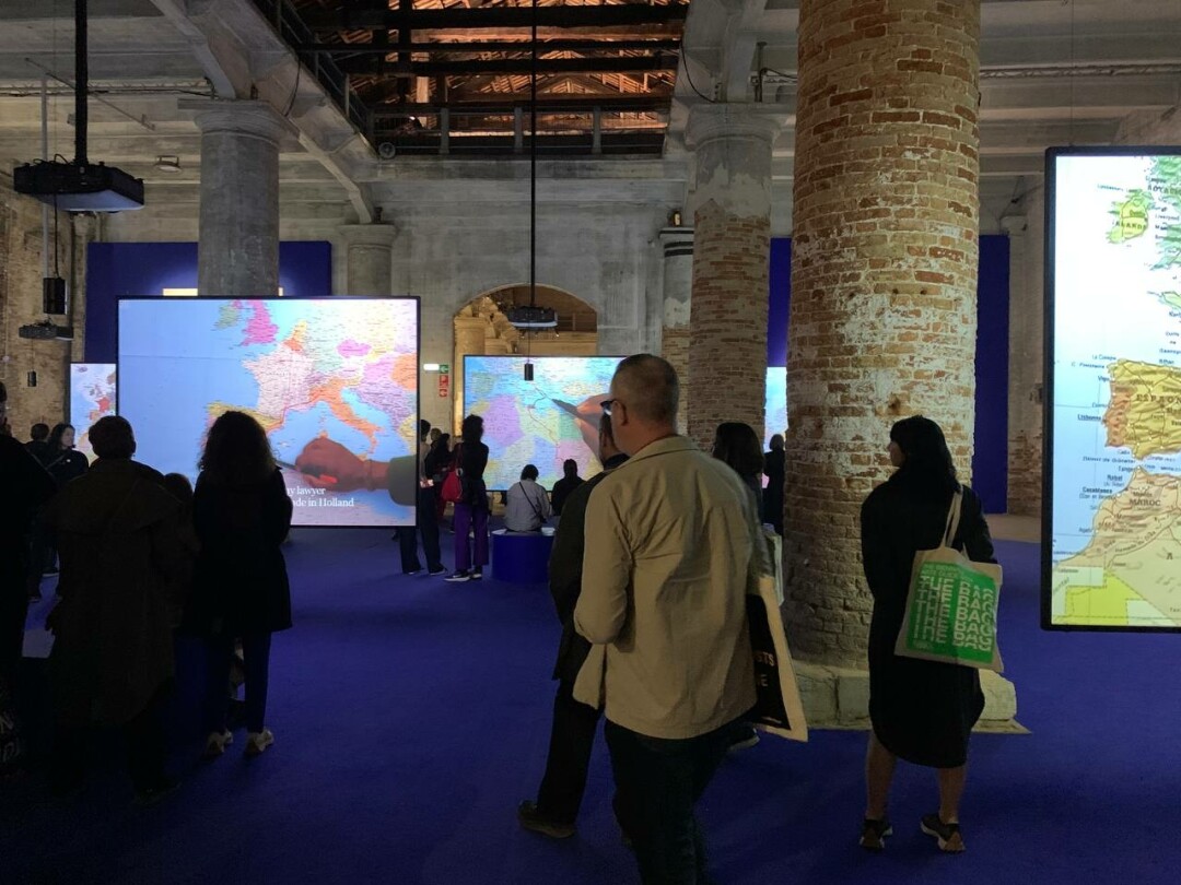 Ярким для меня высказыванием стал проект Бушра Халили – французско-марокканской художницы, исследующей аутсайдеров как людей без гражданства. Проект Халили «Картографическое путешествие» – серия из 8 проекционных экранов в отдельном зале, на которых представлены воспоминания людей, вынужденных переместиться из своего родного региона.