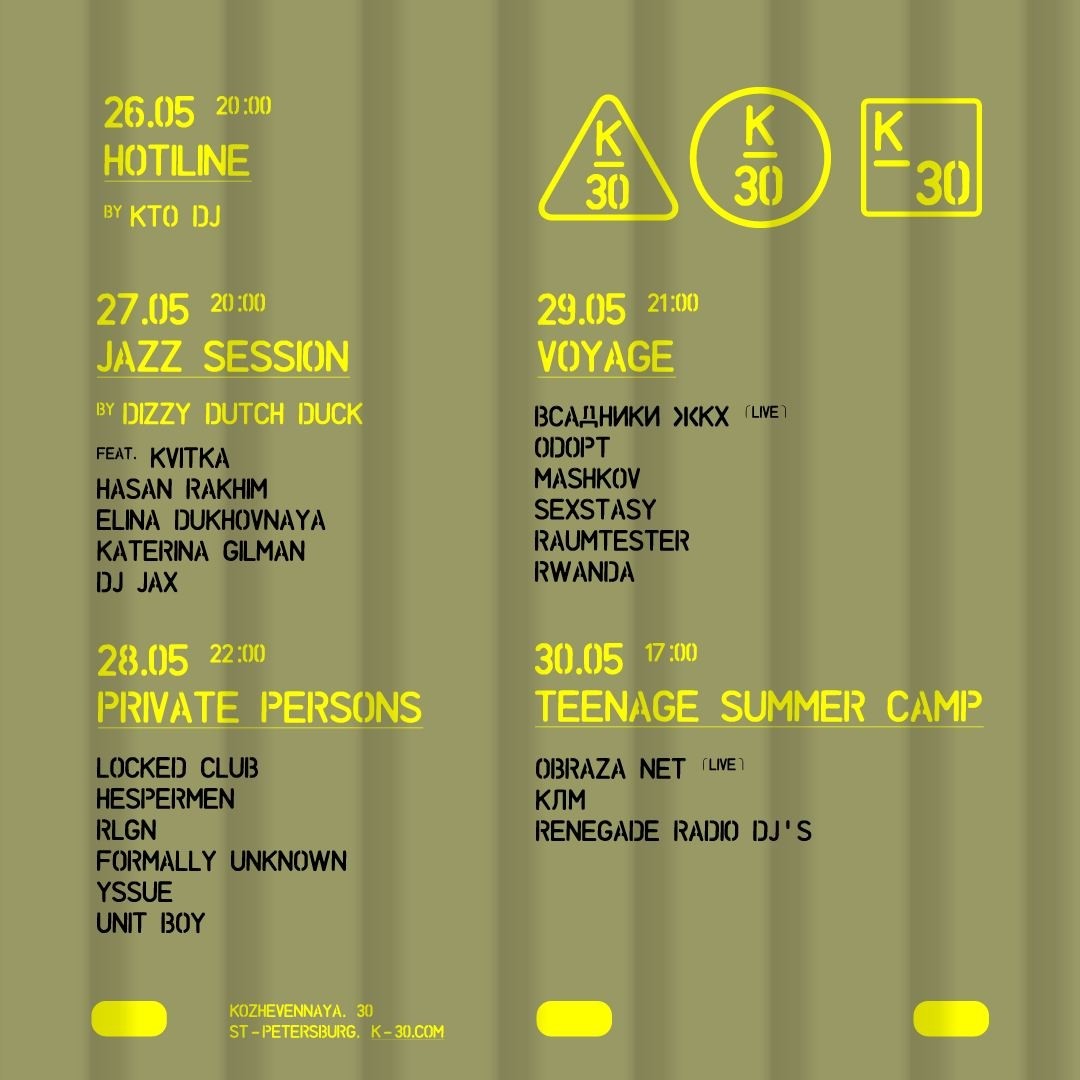 На этих выходных фулл хаус собрал и К-30. В пятницу здесь пройдет большая вечеринка и первый шоукейс лейбла Private Persons в Петербурге. Почти солд-аут, но еще можно успеть. Хедлайнеры — скрывающийся за балаклавами дуэт Locked Club. Также в лайн-апе Hespermen, Yssue и петербуржцы Formally Unknown.