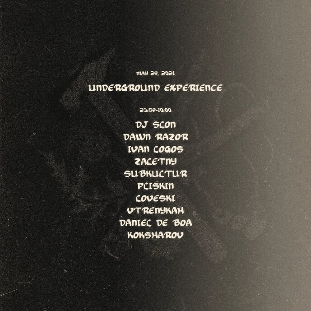 В субботу финальный аккорд весны отгремит двухэтажной авторской вечеринкой Underground Experience — за вертушками идеолог вечера DJ Slon, Dawn Razor, Ivan Logos, Zaletny, Subkultur, Pliskin, Loveski, Vtrenykah, Daniel De Boa, Koksharov.