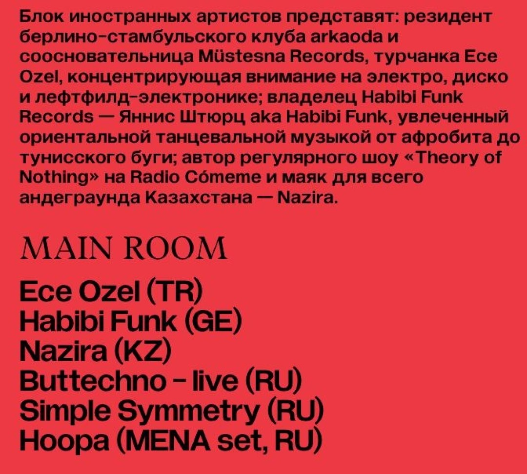 В субботу здесь пройдет вечерне-ночной блок фестиваля MaWaheb, который команда К-30 курирует от лица Roots United. Блок иностранных артистов представят: резидент берлино-стамбульского клуба arkaoda и соосновательница Müstesna Records, турчанка Ece Ozel, концентрирующая внимание на электро, диско и лефтфилд-электронике; владелец Habibi Funk Records — Яннис Штюрц aka Habibi Funk, увлеченный ориентальной танцевальной музыкой от афробита до тунисского буги; автор регулярного шоу «Theory of Nothing» на Radio Cómeme и маяк для всего андеграунда Казахстана — Nazira.
