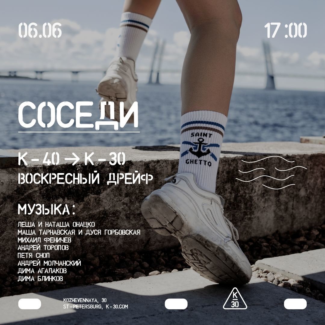 В воскресенье в К-30 по-соседски заглянет команда «Севкабель Порта». Диджейку вынесут на набережную, чтобы все смогли поудобнее устроиться у воды под музыку «от тех, кто ее ставит примерно раз в год и только по особенным случаям» — это Леша и Наташа Онацко, Маша Тарнавская и Дуся Горбовская, Михаил Феничев, Андрей Торопов, Петя Сноп, Андрей Молчанский, Дима Агалаков, Дима Блинков.
