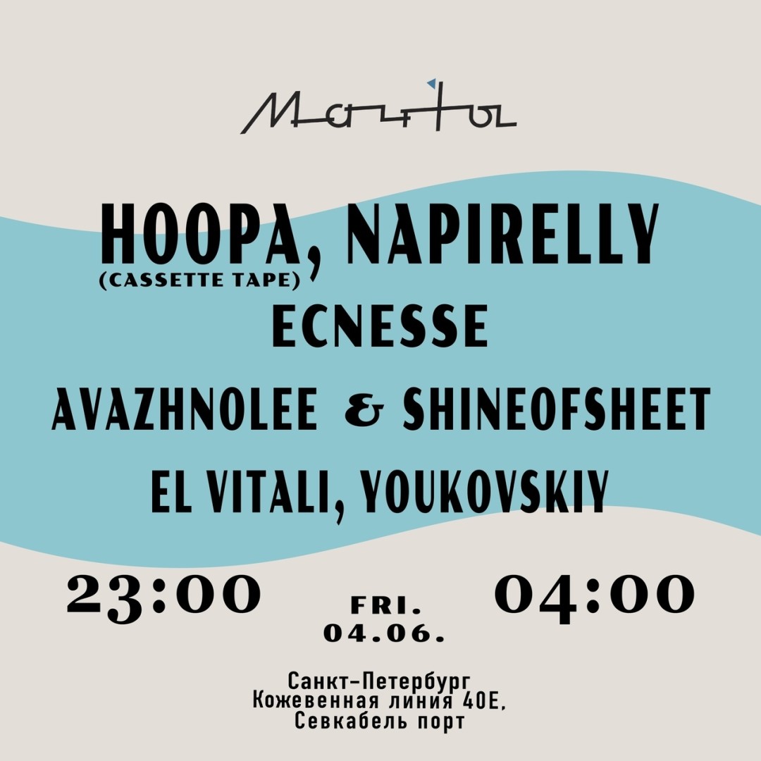 В пятницу вечером в клубе «Мачты» концерт группы Musty Luxury — музыкальный коктейль двух столиц. Ночью — третья серия вечеринки «Плывем», которая в этот раз пройдет на двух танцполах. В лайн-апе отец электронной сцены Петербурга Hoopa с кассетным сетом и «музыкой от локальных лейблов преимущественно», Диана Napirelly, дебютант Ecnesse, бэк-ту-бэк резидентов вечеринки AvazhnoLee & Shineofsheet. Теплоту заднего двора обеспечат Youkovskiy и El Vitali.