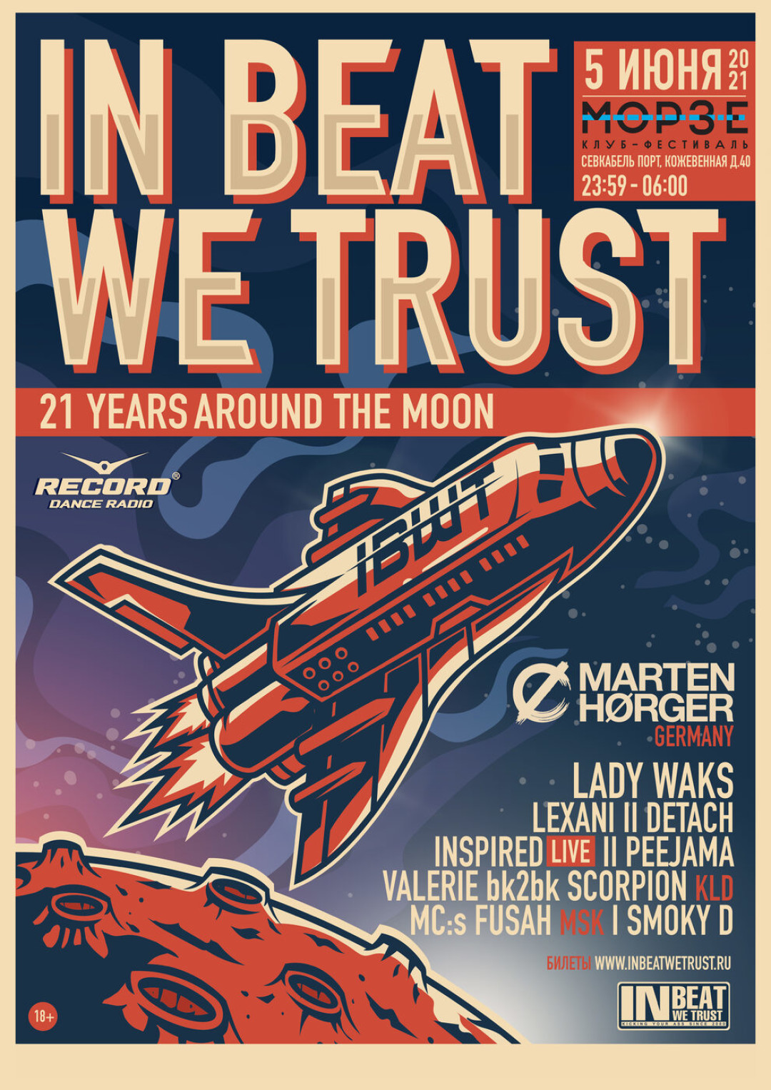 Свое 21-летие музыкальный лейбл In Beat We Trust отметит уже в эту субботу в клубе «Морзе». В лайн-апе Marten Horger, Lady Waks и Lexani, диджеи Detach, Peejama, MC Smoky D, MC Fusah и VJ Oding. Также обещают live-перформанс электронного проекта Inspired и шоу от дуэта Valerie и Scorpion. Не только послушать, но и посмотреть: в рамках вечеринке в «Морзе» покажут фотоинсталляцию «из прошлого в будущее», которая позволит гостям вспомнить успешную историю лейбла.