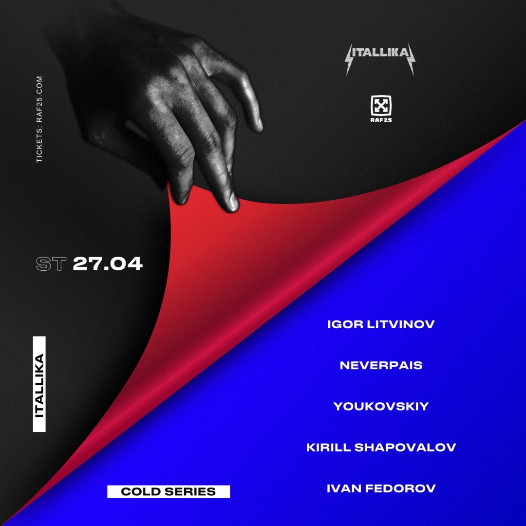 В технобункере RAF25 пройдет первая синтвейв-вечеринка от объединения ITALLIKA. Помимо его идеологов — Igor Litvinov и Ivan Fedorov — в эту ночь тут Павел Юковский, Кирилл Шаповалов, а также Neverpais. Каждый из диджеев выступит дважды: на главном танцполе артисты будут играть музыку с холодным звучанием, а в Engine Room можно будет услышать итало-диско и нью-вейв.