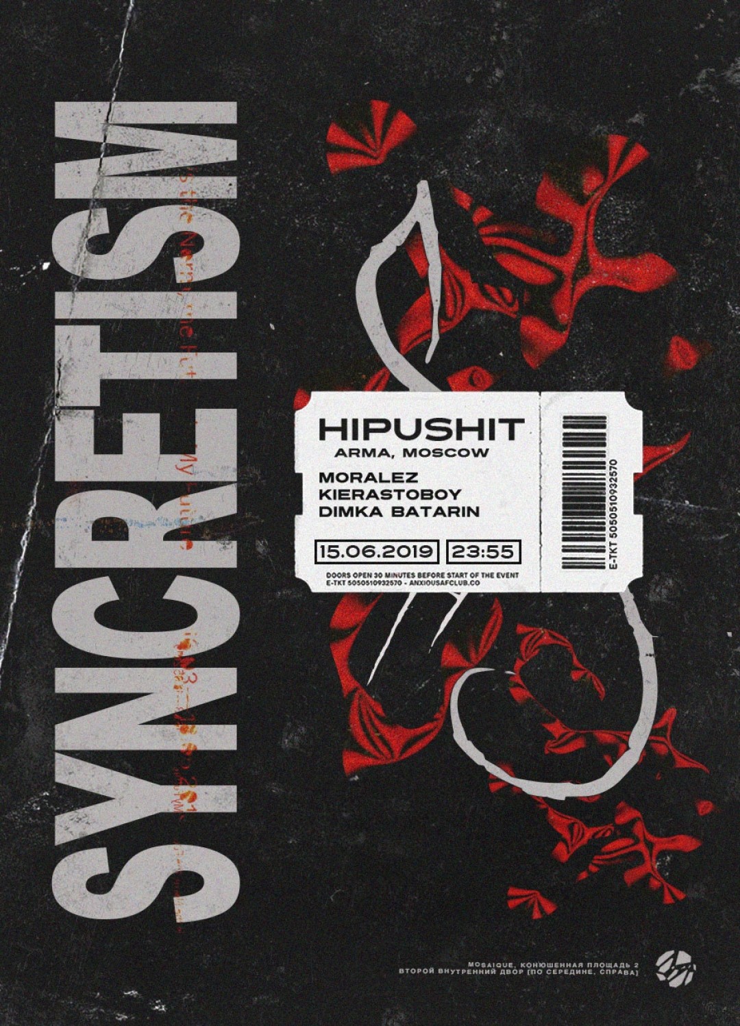 На вечеринку Syncretism приезжает резидент Arma17, московский селектор Hipushit. Компанию ему составят куратор клуба Mosaique и лейбла Mosaique Records — Moralez; Dimka Batarin из Super Collection Orchestra и Kierastoboy, известная по эфирам Discorpion Show на Test FM.