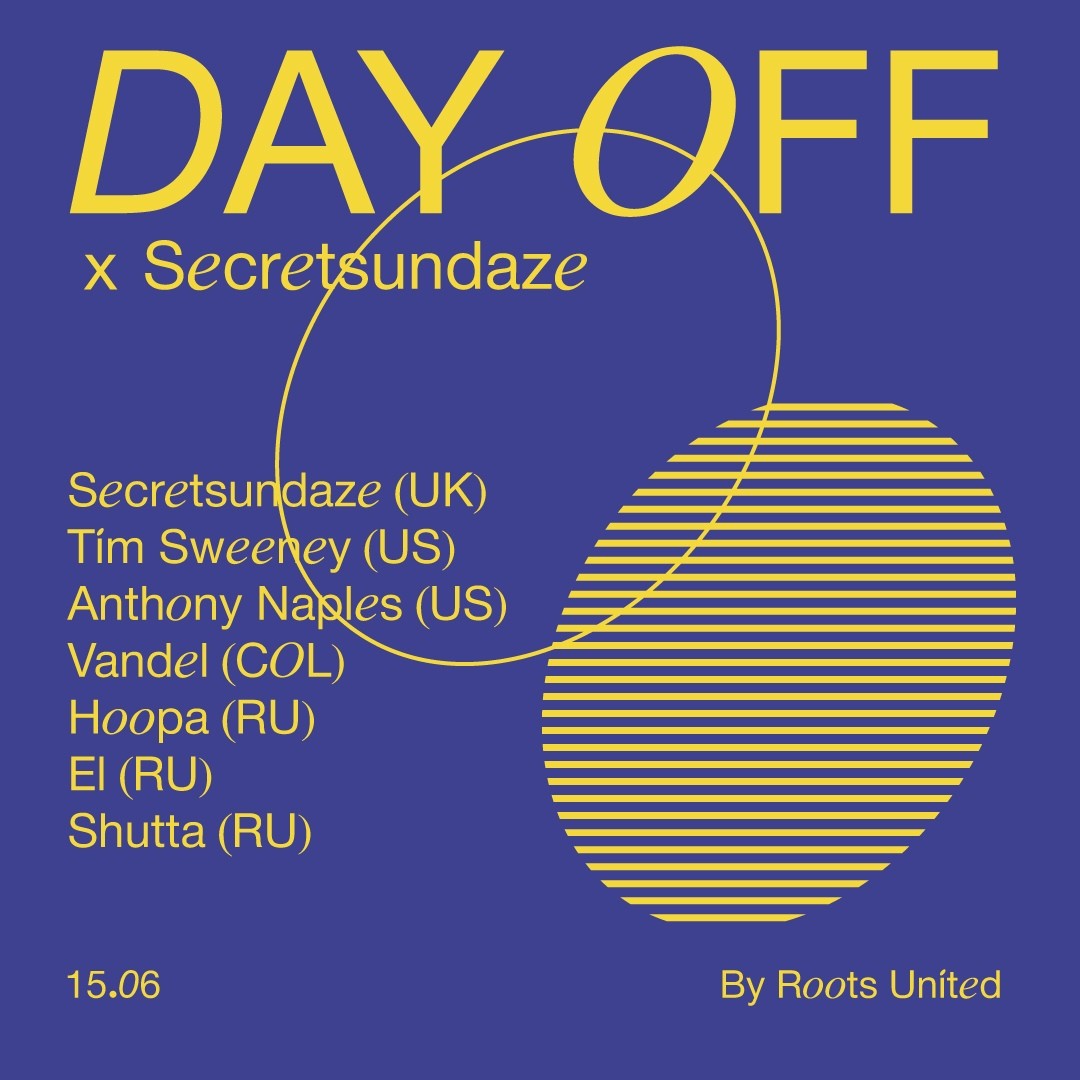 В пространстве «Севкабель Порт» развернется новый эпизод дневного музыкального события от Roots United. Партнером Day Off стал британский бренд Secretsundaze — они делают фирменные дневные вечеринки в Лондоне, Нью-Йорке, Барселоне и по всему миру. На сцене Secretsundaze выступят англичане Giles Smith и James Priestley, а из США приезжают Tim Sweeney и Anthony Naples. По традиции в лайнапе резиденты Roots United — Shutta, El и Hoopa. Также весь день будет работать студия TEST FM, где отыграют сеты молодые диджеи из Петербурга