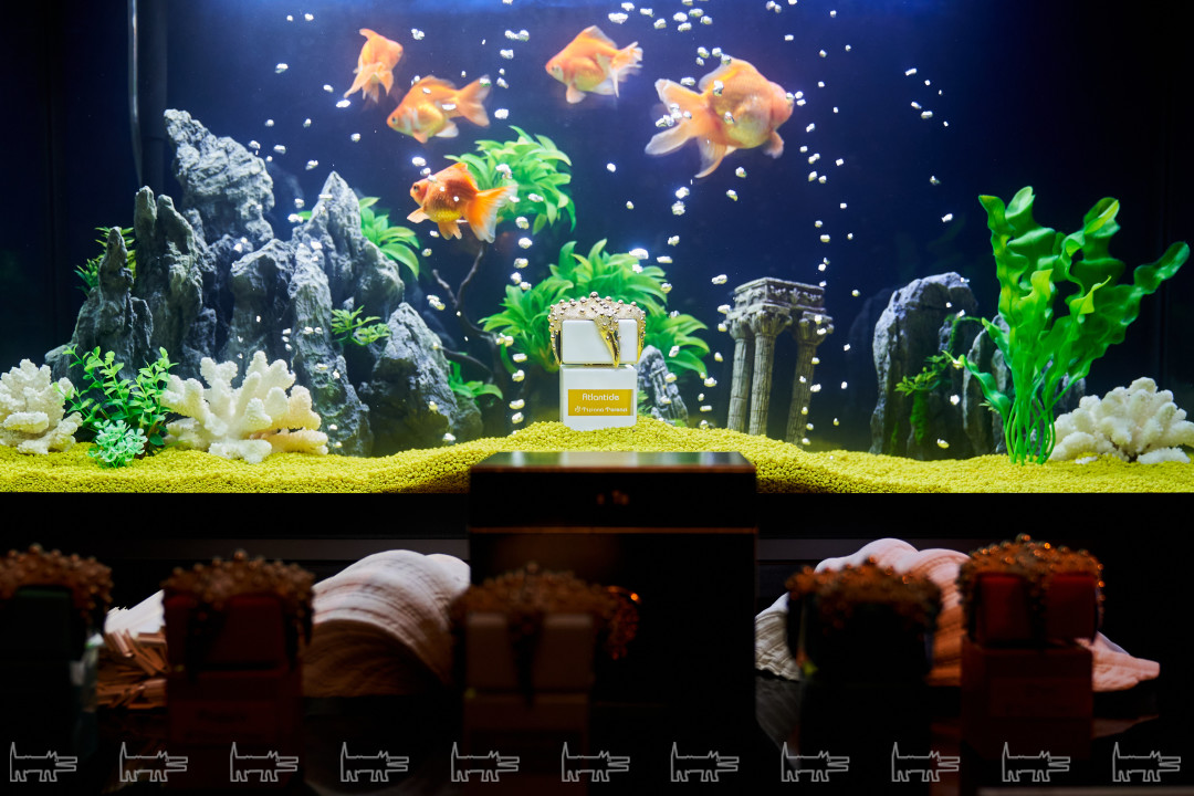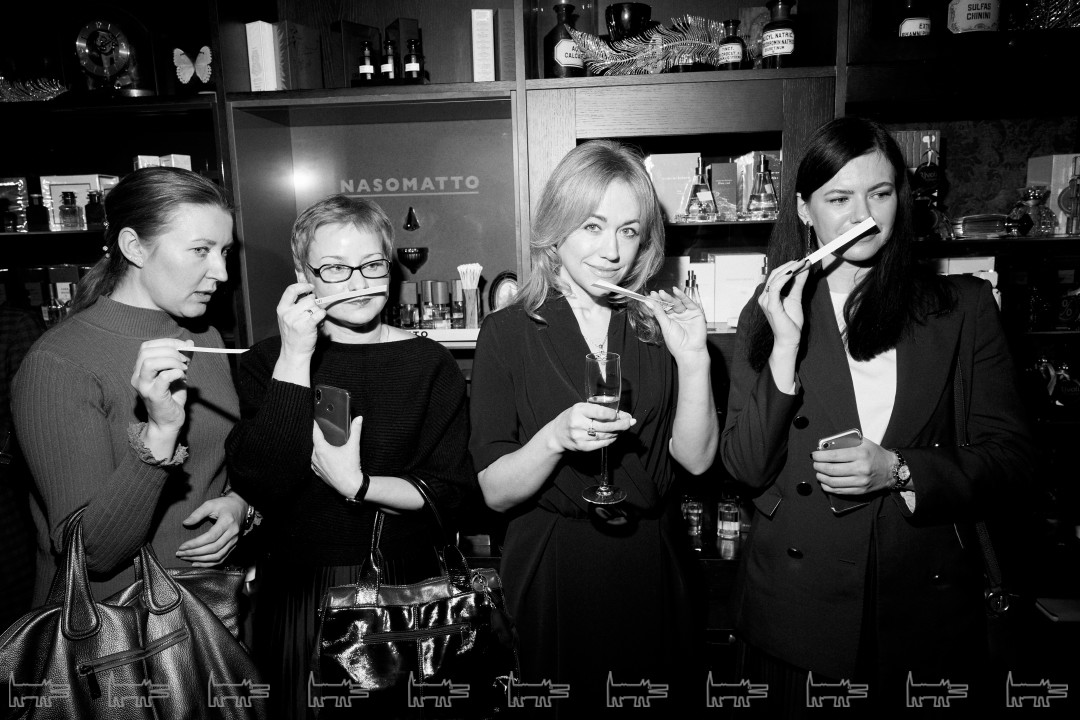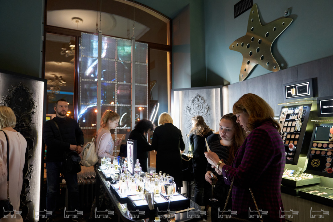 Выйти сухим из воды не получилось ни у одного гостя: флаконы, на которых распласталась золотая морская звезда, поместили в аквариум и сопроводили презентацию шумом Адриатического побережья. Парфманьяки познакомились с ароматами, узнали историю их создания из первых уст и получили автограф от маэстро.