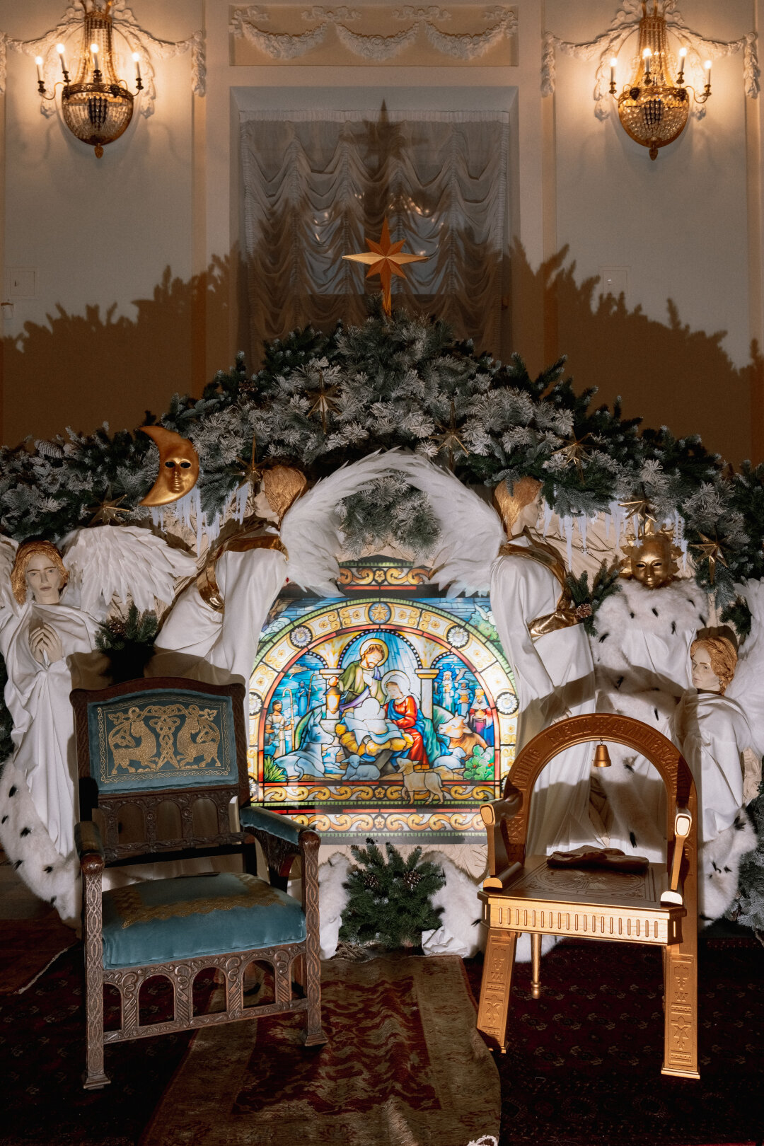Главным украшением зала стал вертеп: композицию со сценой рождения Христа и декорации для зала создали по эскизам студентов Московского художественно-промышленного института. Во время маскарада президент компании Russkaya Skazka Петр Аксенов поблагодарил будущих дизайнеров и ректора вуза — Алексея Егорова — за виртуозную работу.