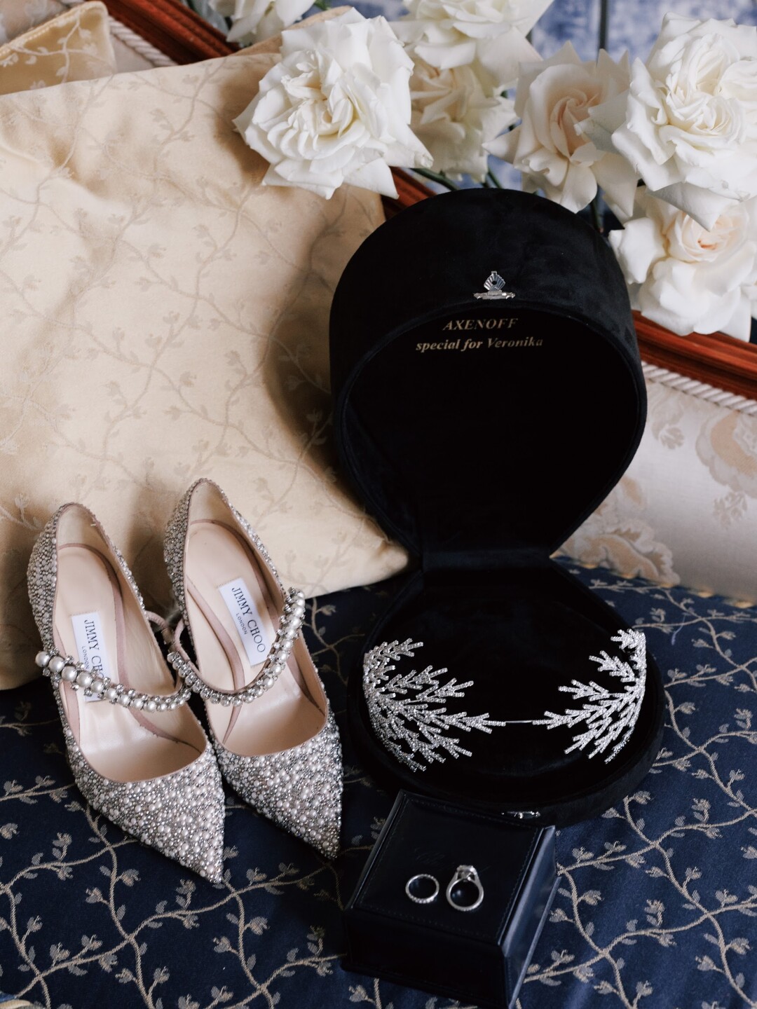 Также для первого образа я выбрала тиару от ювелира Петра Аксёнова по прототипу той, которую он делал для сериала «Война и мир», для сцены, когда Наташа Ростова впервые появилась на балу. Завершали мой первый образ туфли Jimmy Choo, которые мы смогли найти только в Дубае.