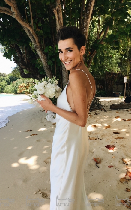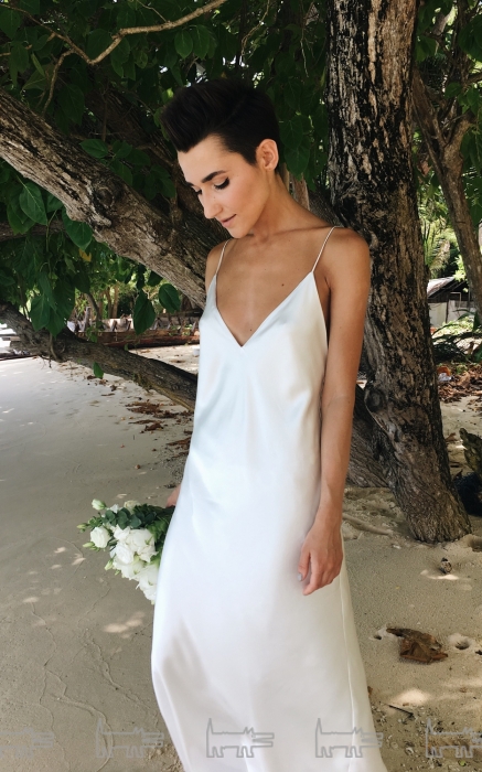 Я всегда ношу простые наряды, очень люблю открытую спину и декольте. В повседневной жизни выбираю именно такие силуэты и не стала отходить от них при составлении своего свадебного образа. Платье я изначально представляла именно таким, но, на удивление, не могла найти подобный фасон в магазинах. У нас очень много нарядов в «бельевом стиле», но все было не то! В итоге обратилась за помощью к своей хорошей подруге и дизайнеру бренда Jana Segetti Натальи Каптур. Она сшила все в сжатые сроки, буквально за неделю, и платье доставляла мне на остров родная сестра — единственный гость на нашей с Ильей свадьбе. Так что финальная примерка была уже в ночь перед самой церемонией.