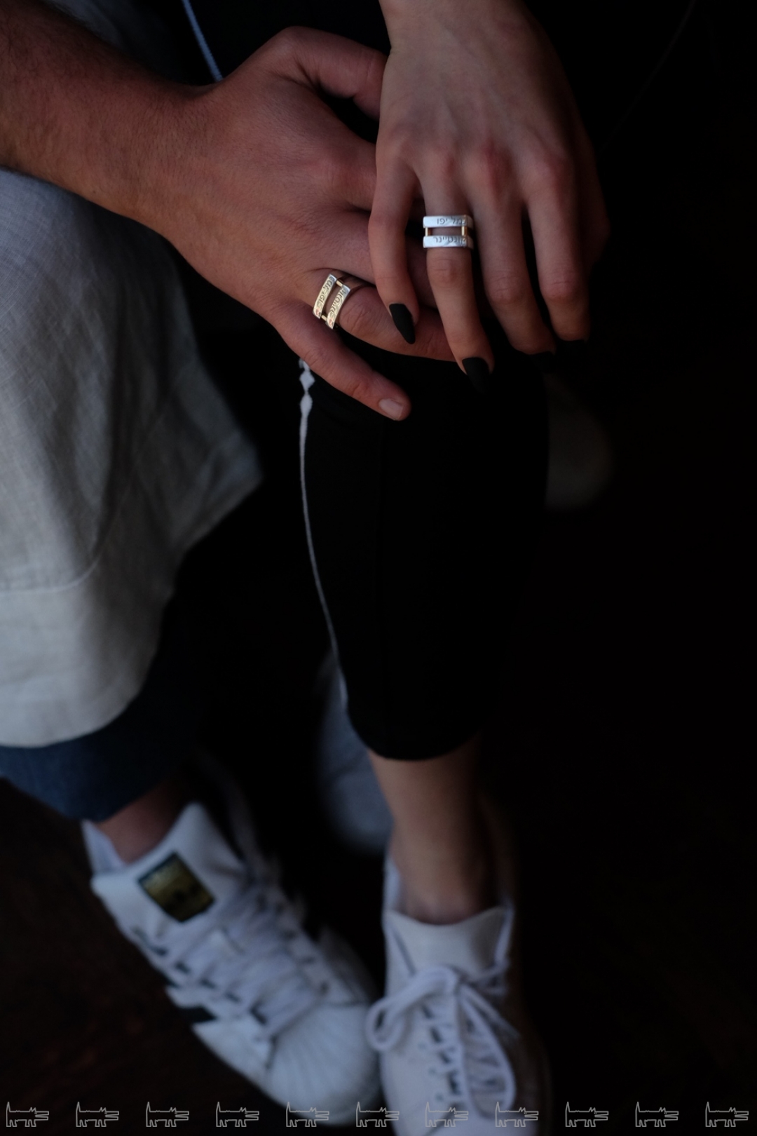 Саша: Страсть к ювелирным украшениями я испытываю с детства, странно, что у меня еще нет золотых зубов. Именно поэтому дизайном наших колец я с радостью занялся сам, а воплотил мою идею ювелир Алексей Маркич. По сути, каждое из них — это два серебряных кольца, соединенных между собой четырьмя золотыми болтами. Надпись я выбрал символичную и на иврите: «Старый порт Яффо, Контейнер».