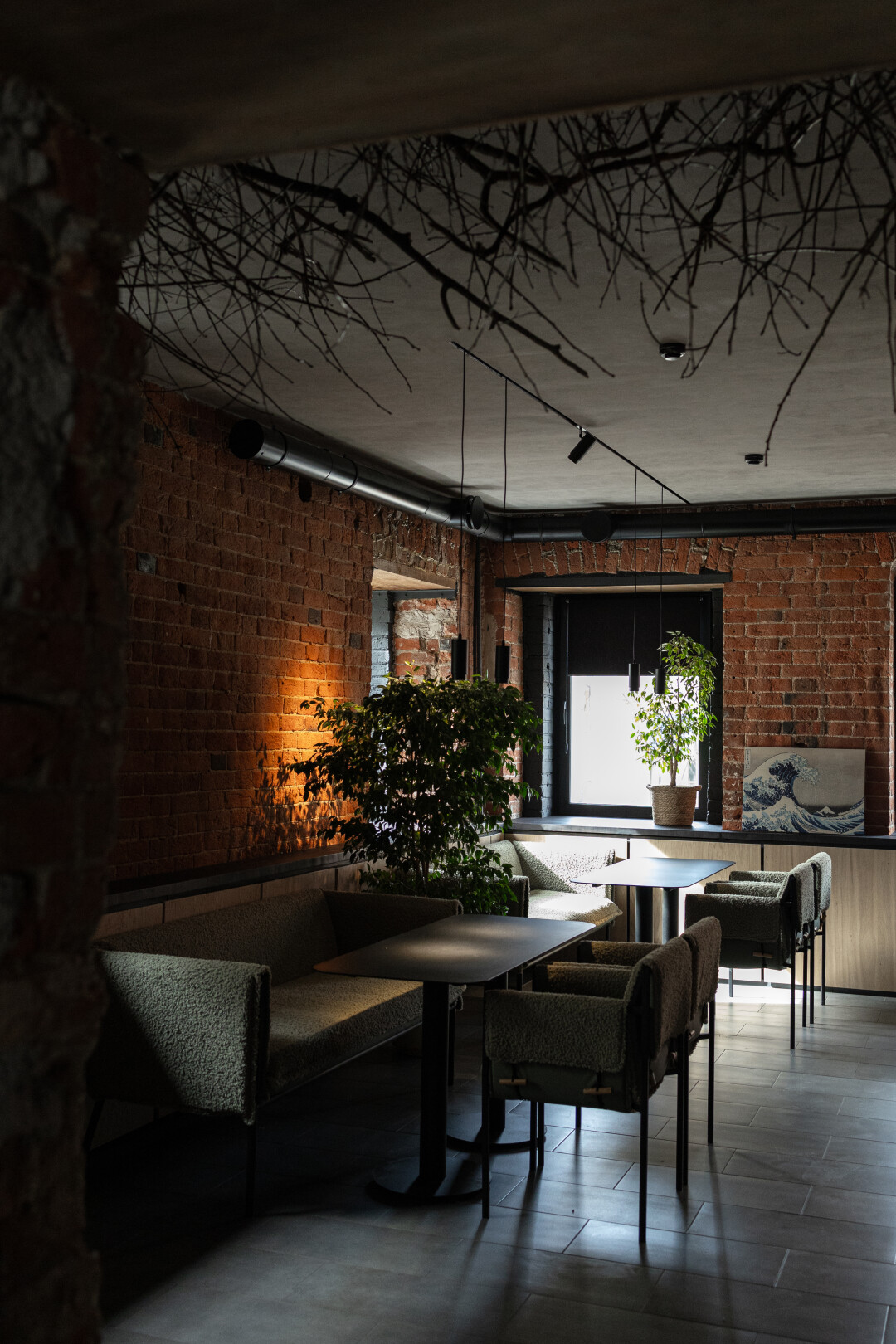 Максимально эстетичное кафе с японской философией: о свободе быть собой, щедрости к себе и миру, умении жить комфортно в природе. Первый этаж символизирует быстрый ритм жизни в городе. Остров кухни и гардероб напоминают фасады жилого дома. С помощью изображений на проекторе здесь создали ощущение пробивающихся лучей солнца и колышущихся трав. Второй этаж в стиле минимализма, с японским акцентом. Уютно разместиться можно за барной стойкой, в зоне рощи-горизонта и за столами из натурального камня. Попробуйте гречневую лапшу с ростбифом, яичную лапшу с хрустящим цыпленком и маринованным желтком, тартар из говядины с угрем и черным трюфелем.