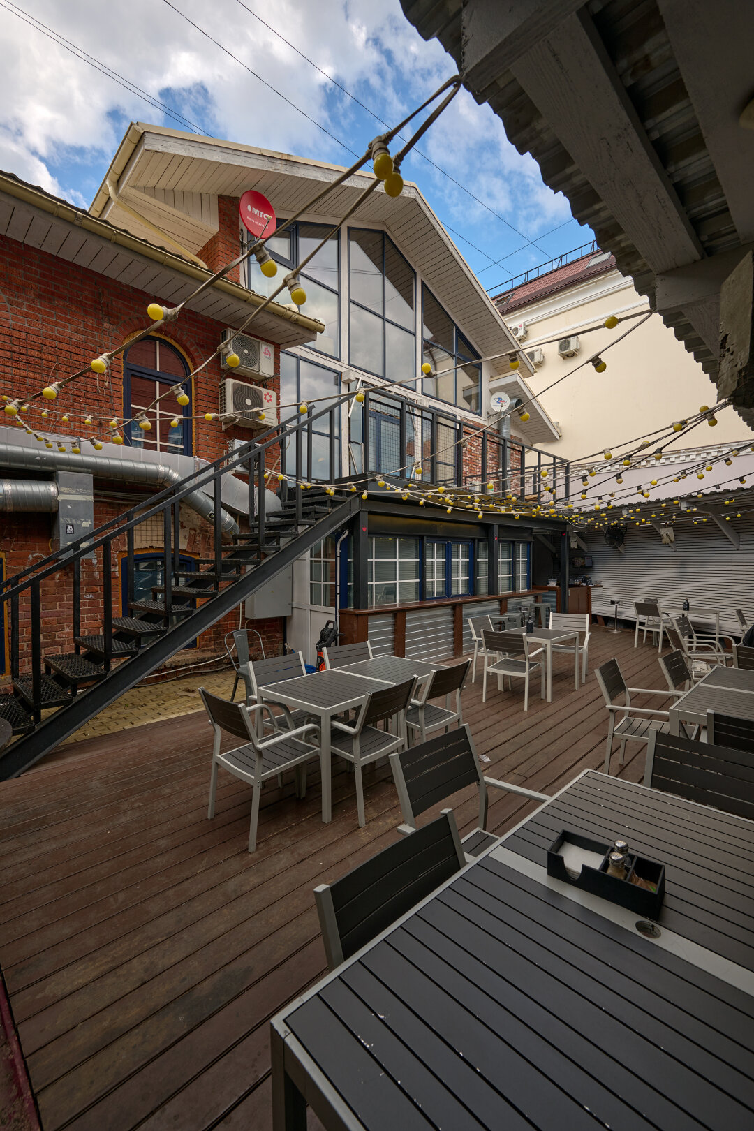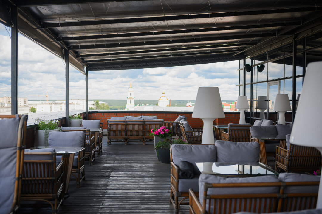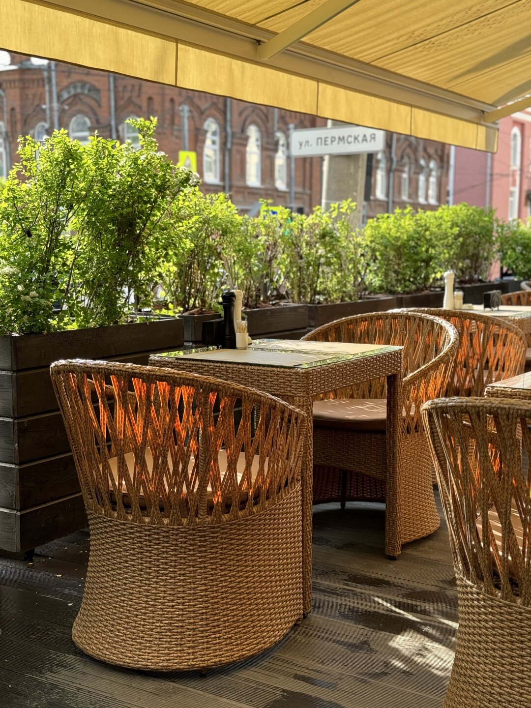 Панорамная терраса с видом на сердце Перми — летний магнит для жителей и гостей города. Сюда приходят встречать закаты с бокалом игристого и наслаждаться блюдами со свежими сырами из собственной сыроварни. Хэдлайнеры меню — сырное ассорти со сладкими томатами, пицца с мортаделлой и страчателлой, зеленые равиоли с крабом и креветками и черная треска с томленым картофелем. Под занавес — клубничное-земляничное гаспачо, домашнее мороженое и сорбеты.