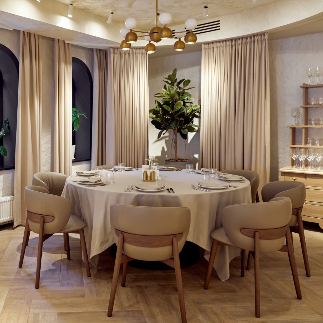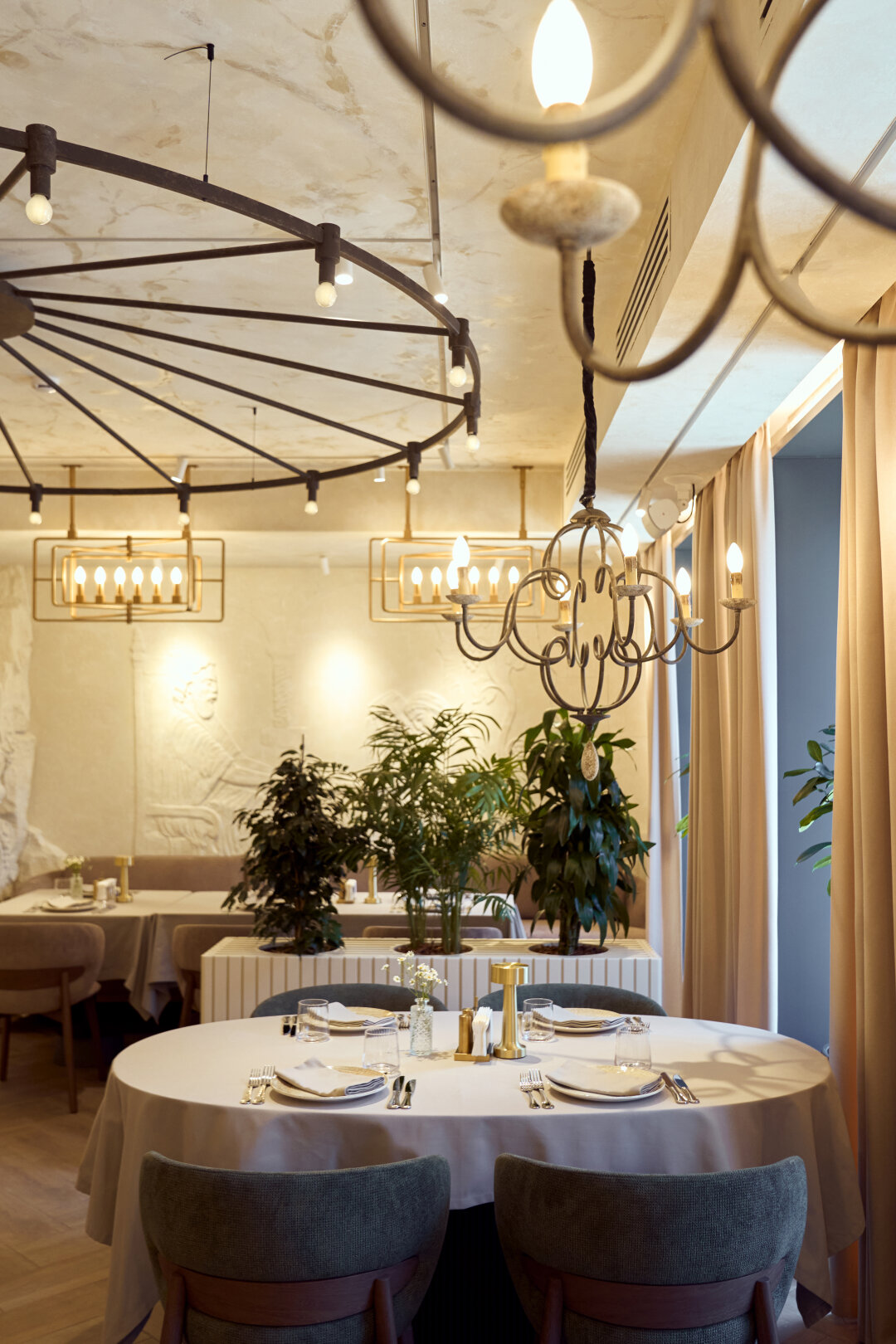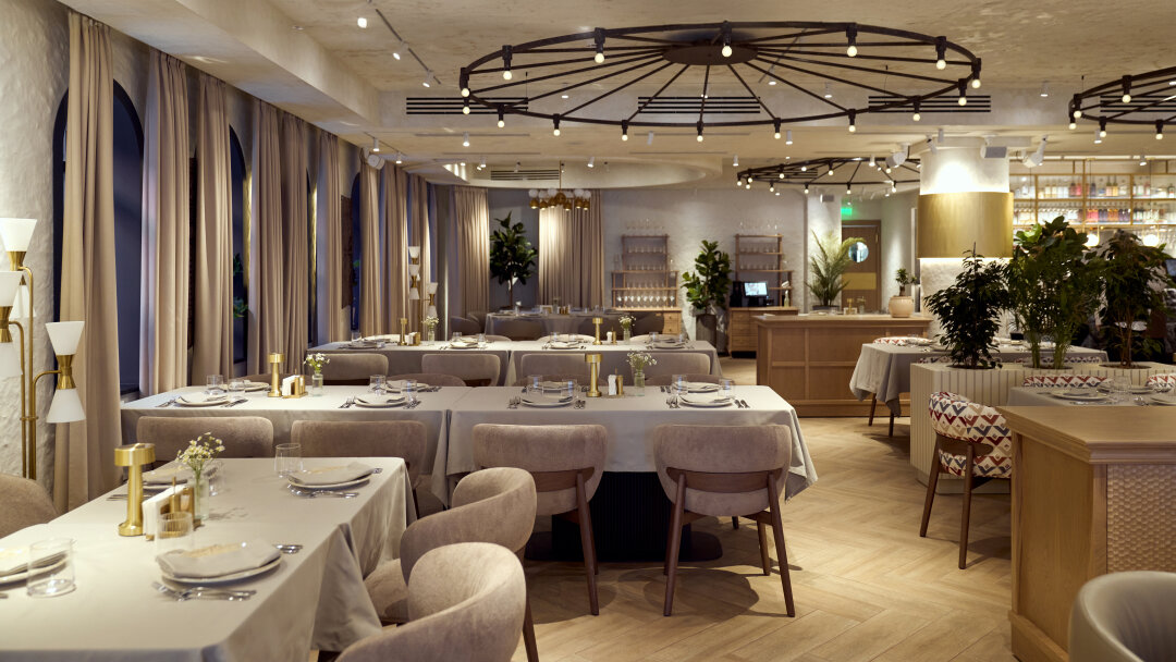 В прошлом году ресторан пережил масштабную реконструкцию. Интерьер был обновлен — сейчас это современный классический стиль с элементами ар-деко. Основу цветовой гаммы составили лаконичные светлые оттенки, а настоящим украшением пространства стали детали, отсылающие к искусству Армении.